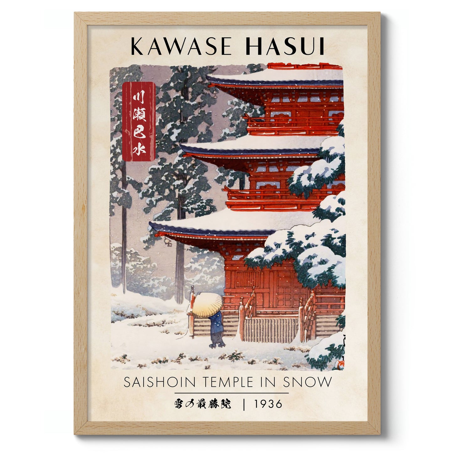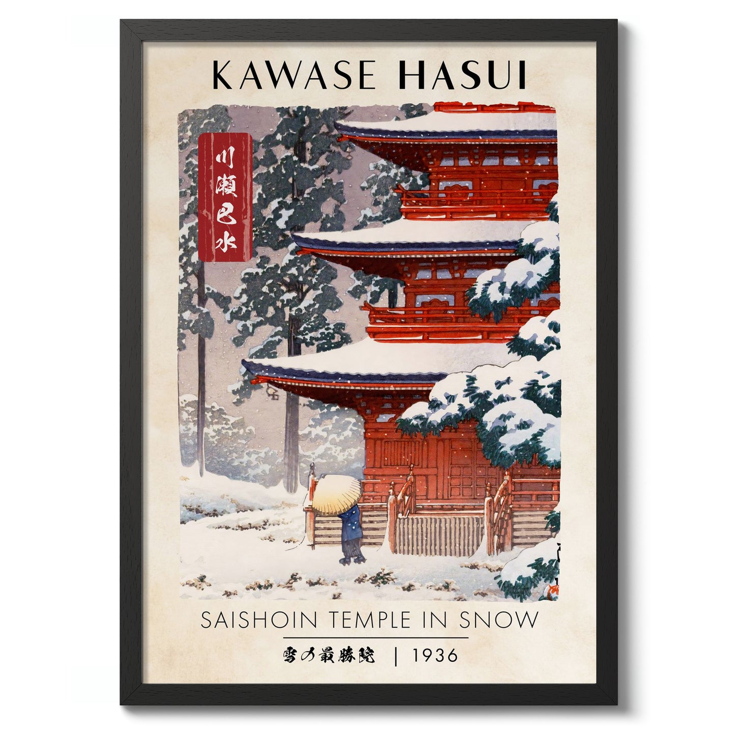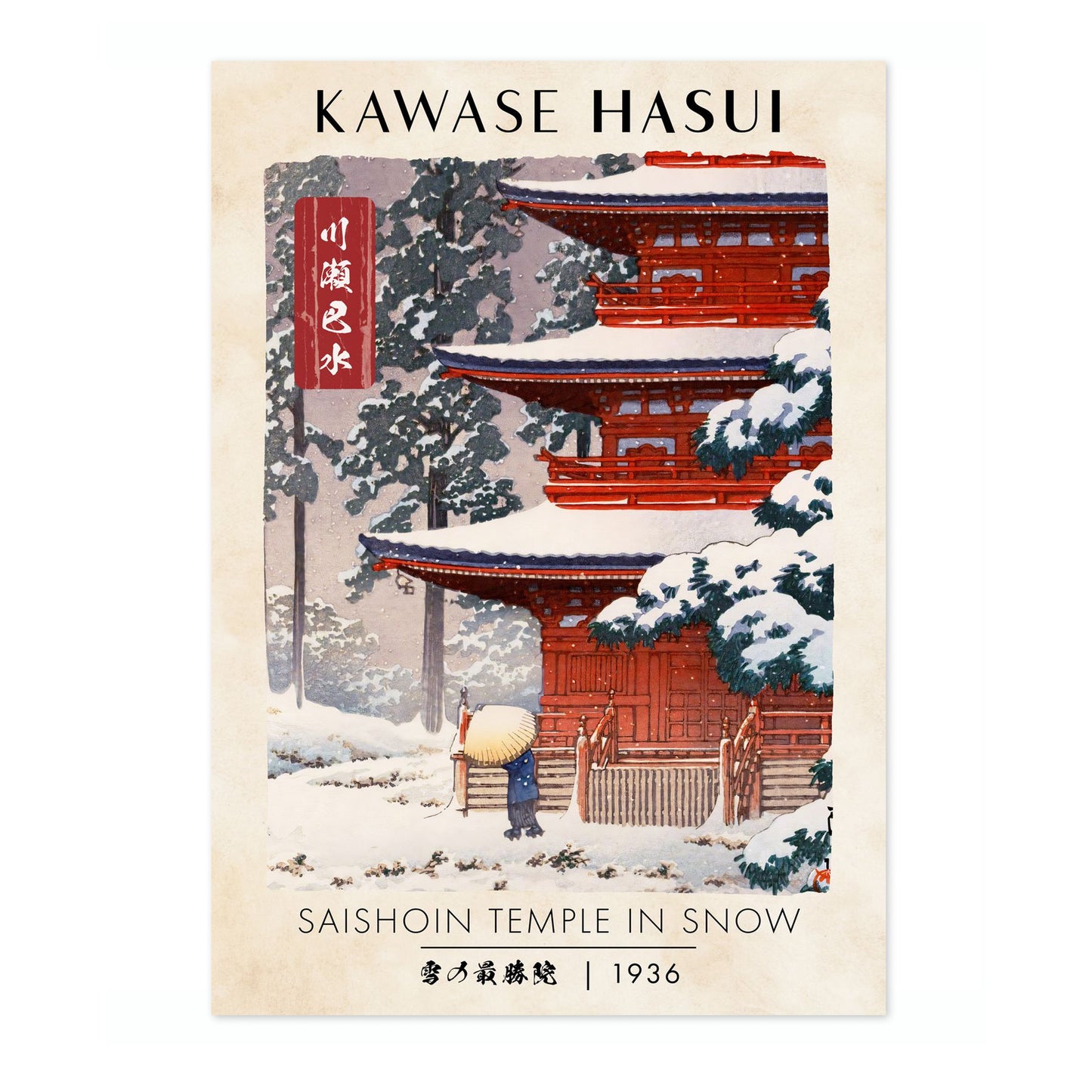 The "Saishoin Temple in Snow" poster by Kawase Hasui captures a tranquil winter scene featuring a snow-clad pagoda and serene temple grounds. Rendered in traditional Japanese woodblock style, the artwork employs a striking red temple against a snowy backdrop, highlighting the peaceful ambiance. Ideal for fans of Japanese art and historical architecture, this 1936 composition evokes quiet reflection and beauty.