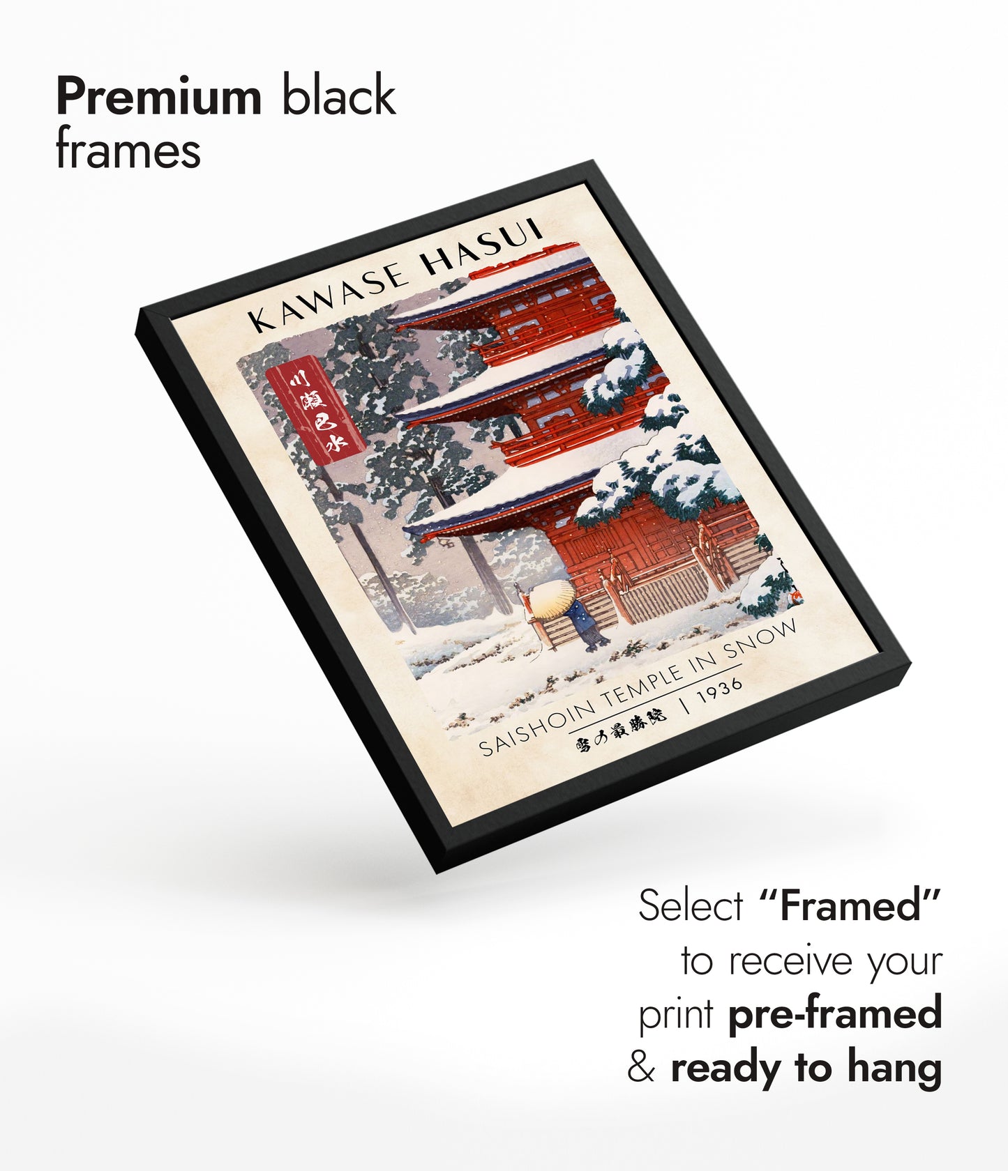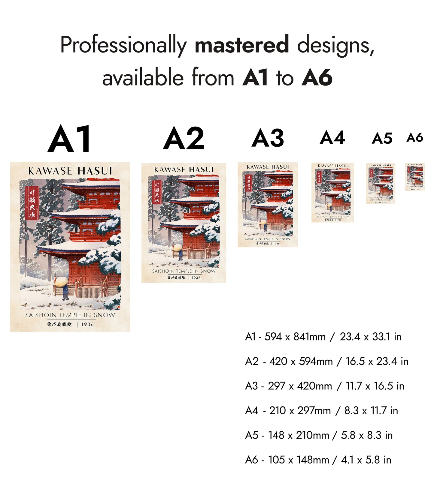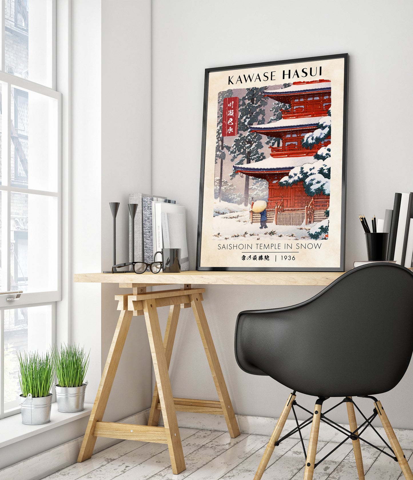 The "Saishoin Temple in Snow" poster by Kawase Hasui captures a tranquil winter scene featuring a snow-clad pagoda and serene temple grounds. Rendered in traditional Japanese woodblock style, the artwork employs a striking red temple against a snowy backdrop, highlighting the peaceful ambiance. Ideal for fans of Japanese art and historical architecture, this 1936 composition evokes quiet reflection and beauty.