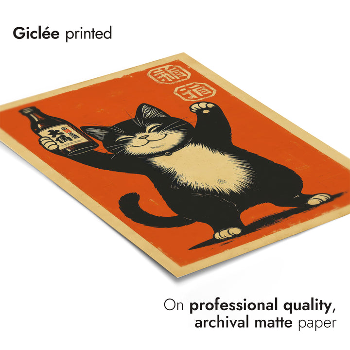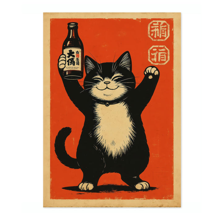 This lively anime-style poster depicts a cheerful black and white cat holding a sake bottle against a vibrant red background. The bold graphic illustration captures the playful essence of Japanese culture, combining themes of alcohol and feline charm. Its striking composition and joyful theme make it an eye-catching piece for art enthusiasts and cat lovers alike.