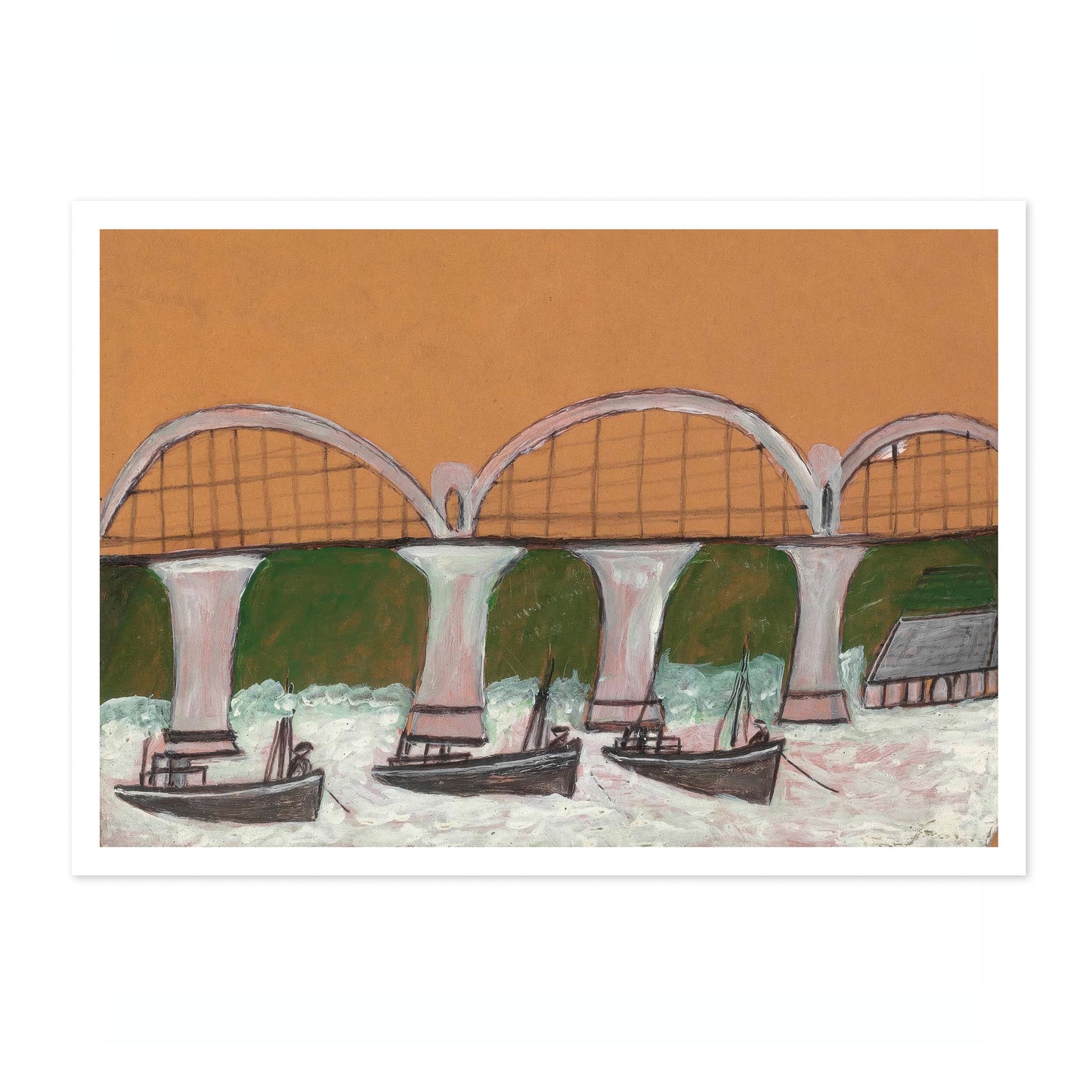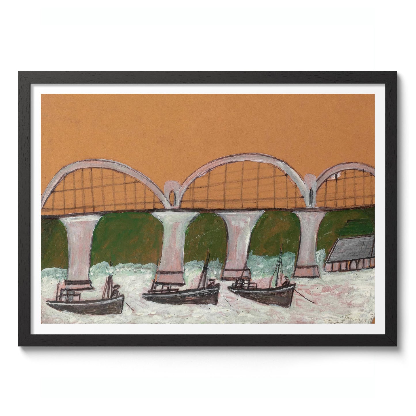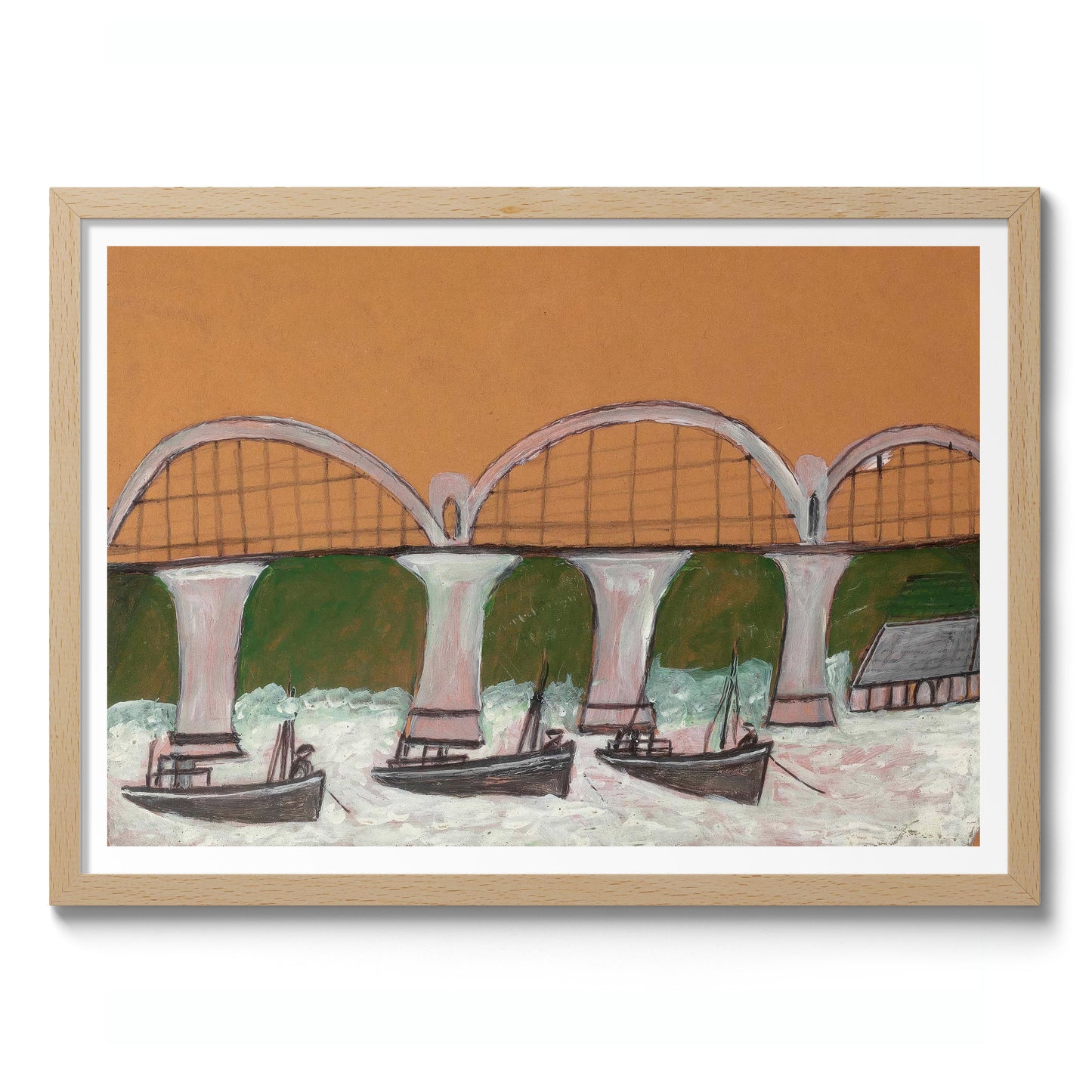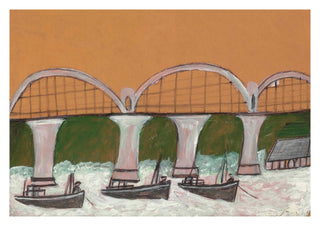 The "Saltash Bridge" poster by Alfred Wallis depicts a quaint maritime scene with a primitive yet captivating style. The artwork features boats gracefully sailing beneath the arches of the Saltash Bridge set against a green backdrop. Perfect for marine enthusiasts and admirers of naïve art, this landscape captures the charm of seaside life in a distinctive and expressive manner.