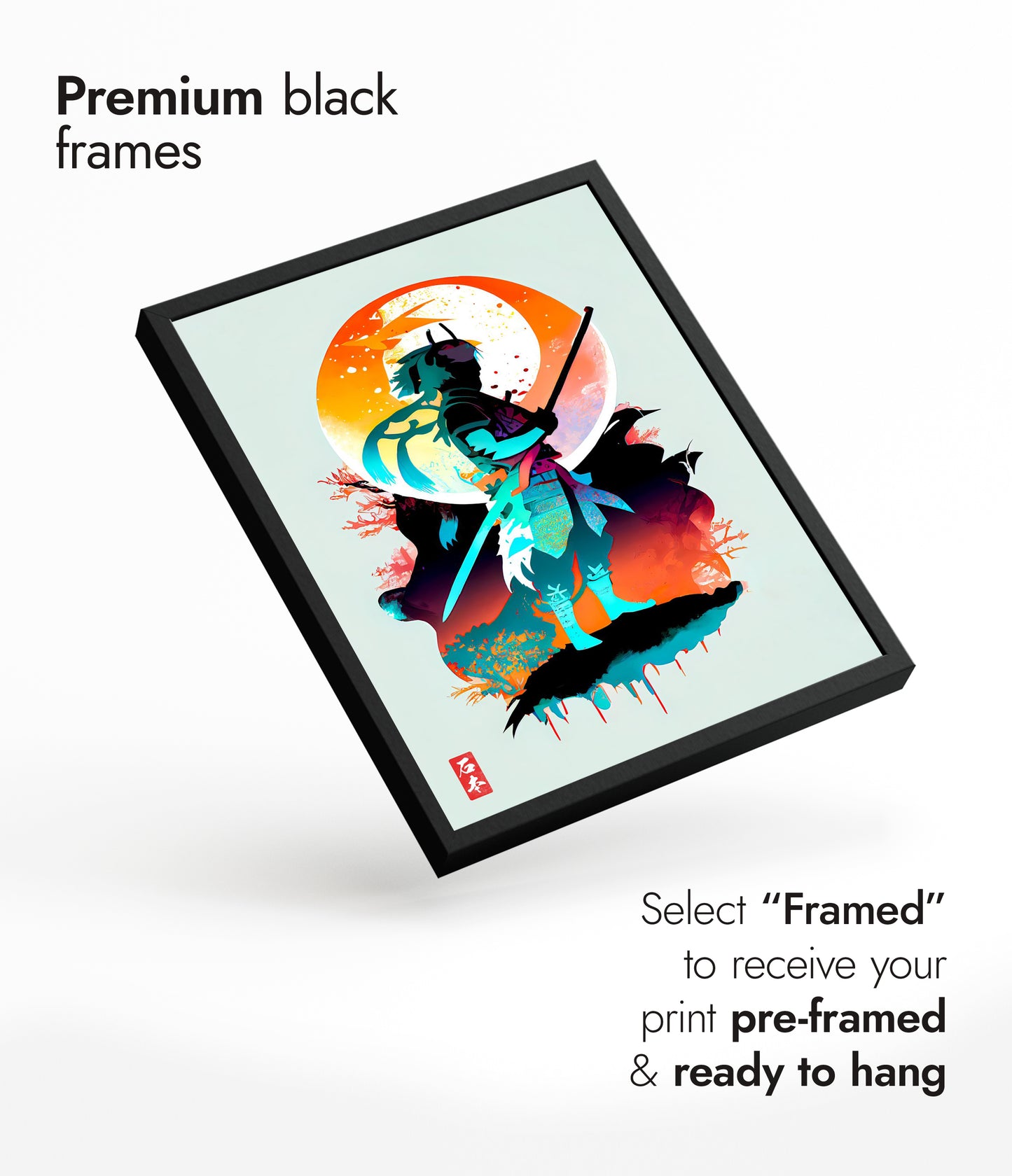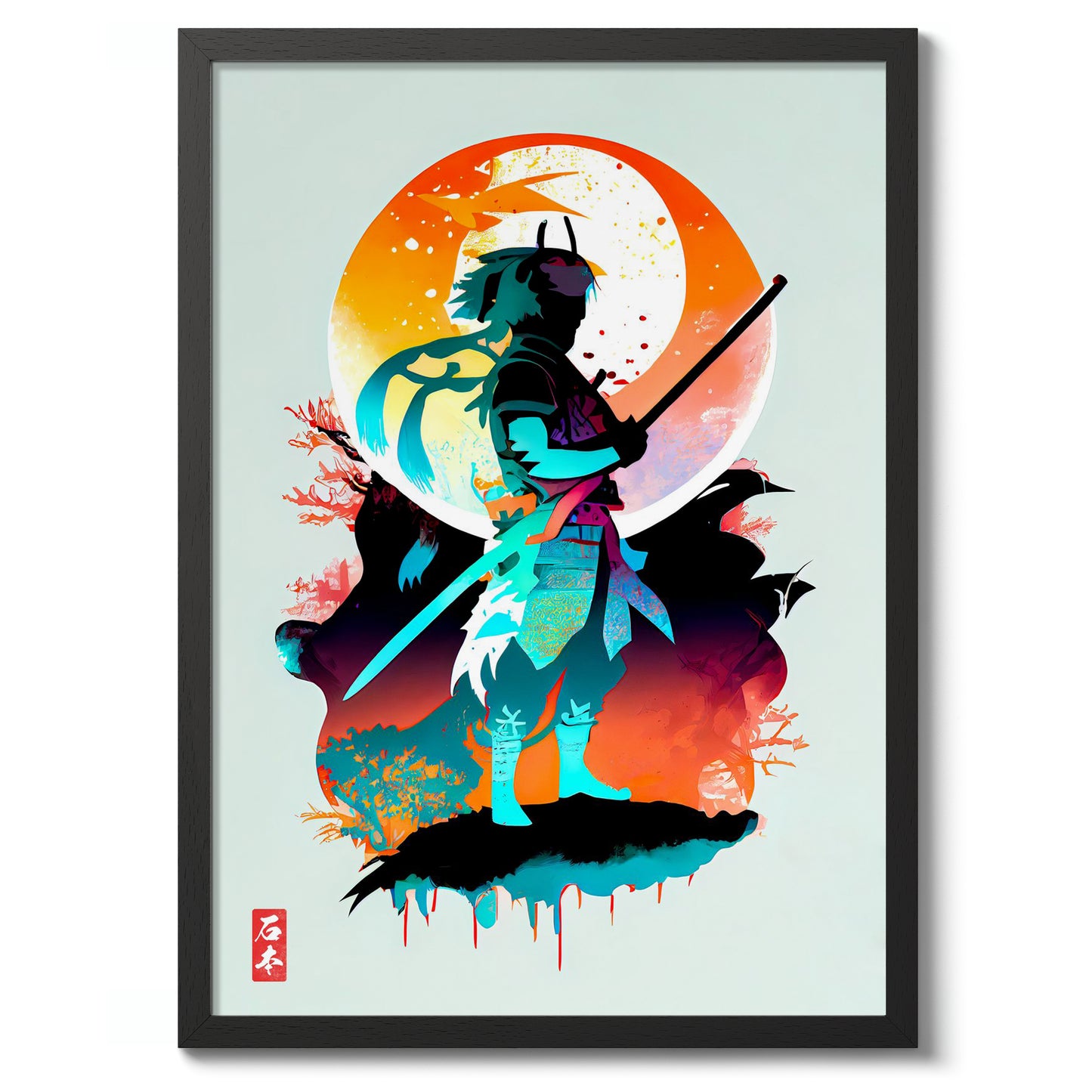 This poster, titled "Samurai's Honor," captures a striking silhouette of a samurai poised before an orange and red sunset, contrasted beautifully with a glowing moon. The artwork blends anime and minimalist styles, infused with vibrant watercolor techniques. The bold depiction of the warrior in modern illustration style brings a dynamic yet tranquil composition perfect for any anime or modern art enthusiast.