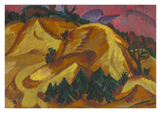The "Sand Hills in Grünau" poster by Ernst Ludwig Kirchner showcases a vibrant Fauvist landscape. Bold, expressive brushstrokes depict golden sand dunes amidst a verdant forest, set against a dramatic sky. The dynamic colour contrasts and stylized portrayal of nature reflect Kirchner's unique artistic vision. Perfect for adding a touch of expressionist art to any space. Ideal for those appreciating art prints and landscape posters.