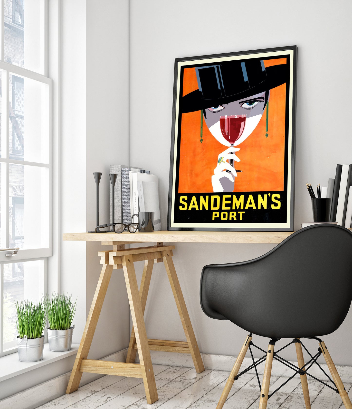 This vintage-inspired poster features an enigmatic figure with a black hat, jeweled earrings, and a prominent red wine glass. The bold orange background enhances the striking contrast, emphasizing the allure of Sandeman's Port. Ideal for enthusiasts of classic alcohol advertisements, this illustration captures the sophisticated and mysterious essence of the iconic brand in a refined artistic representation.