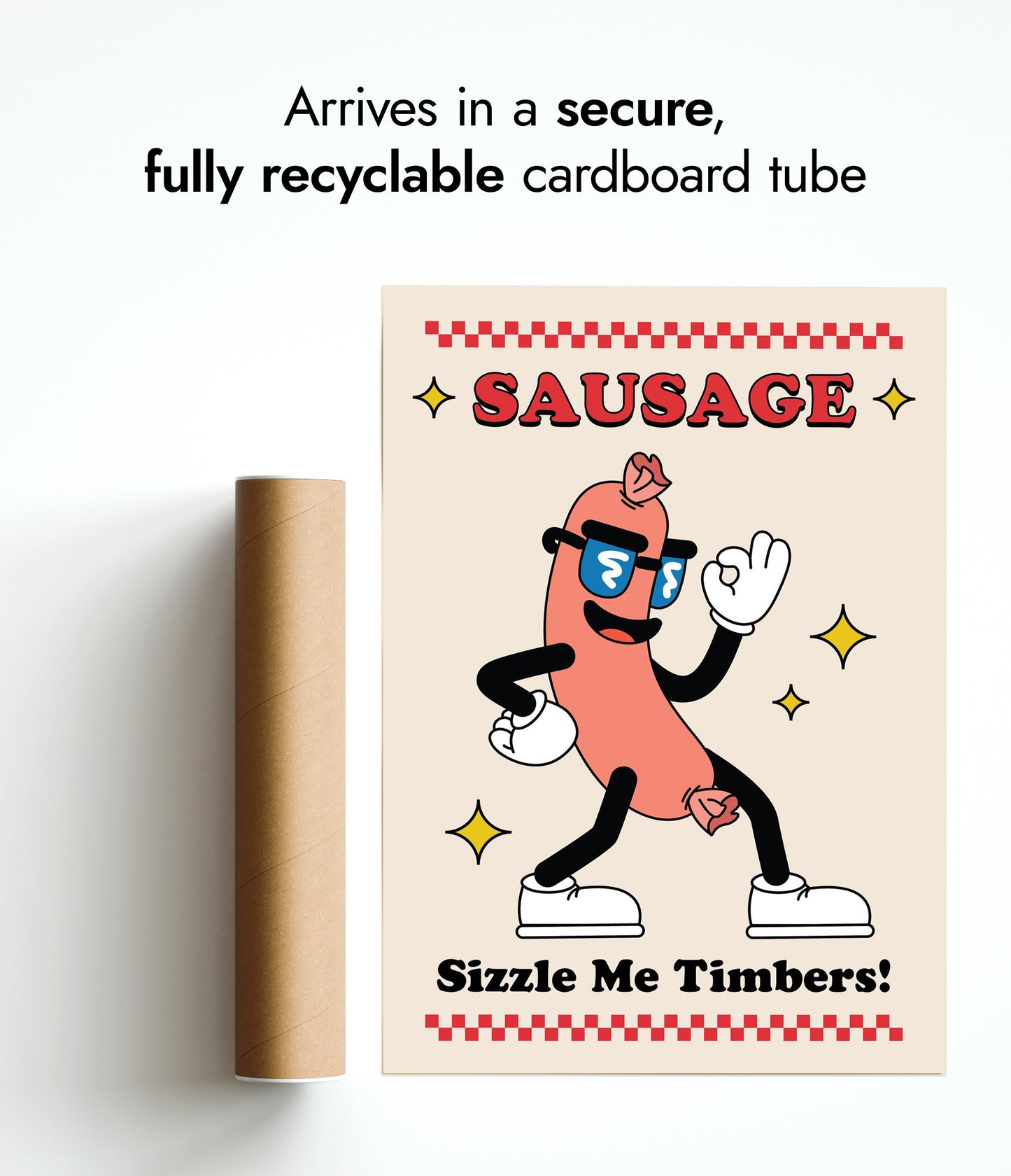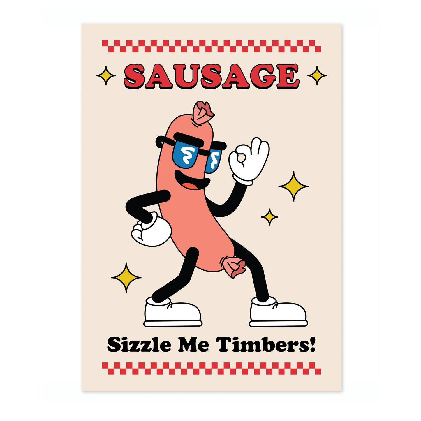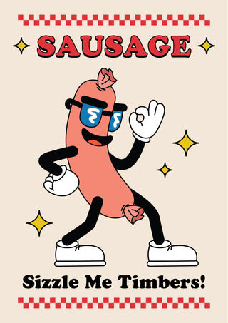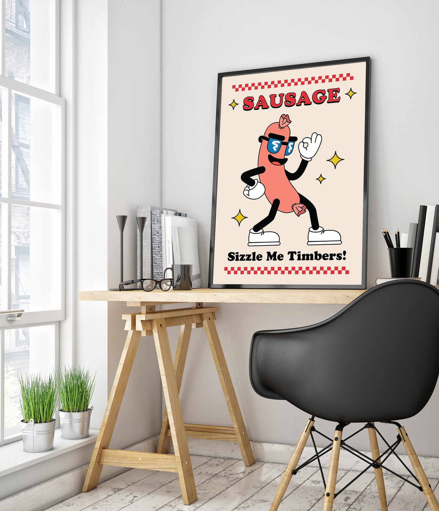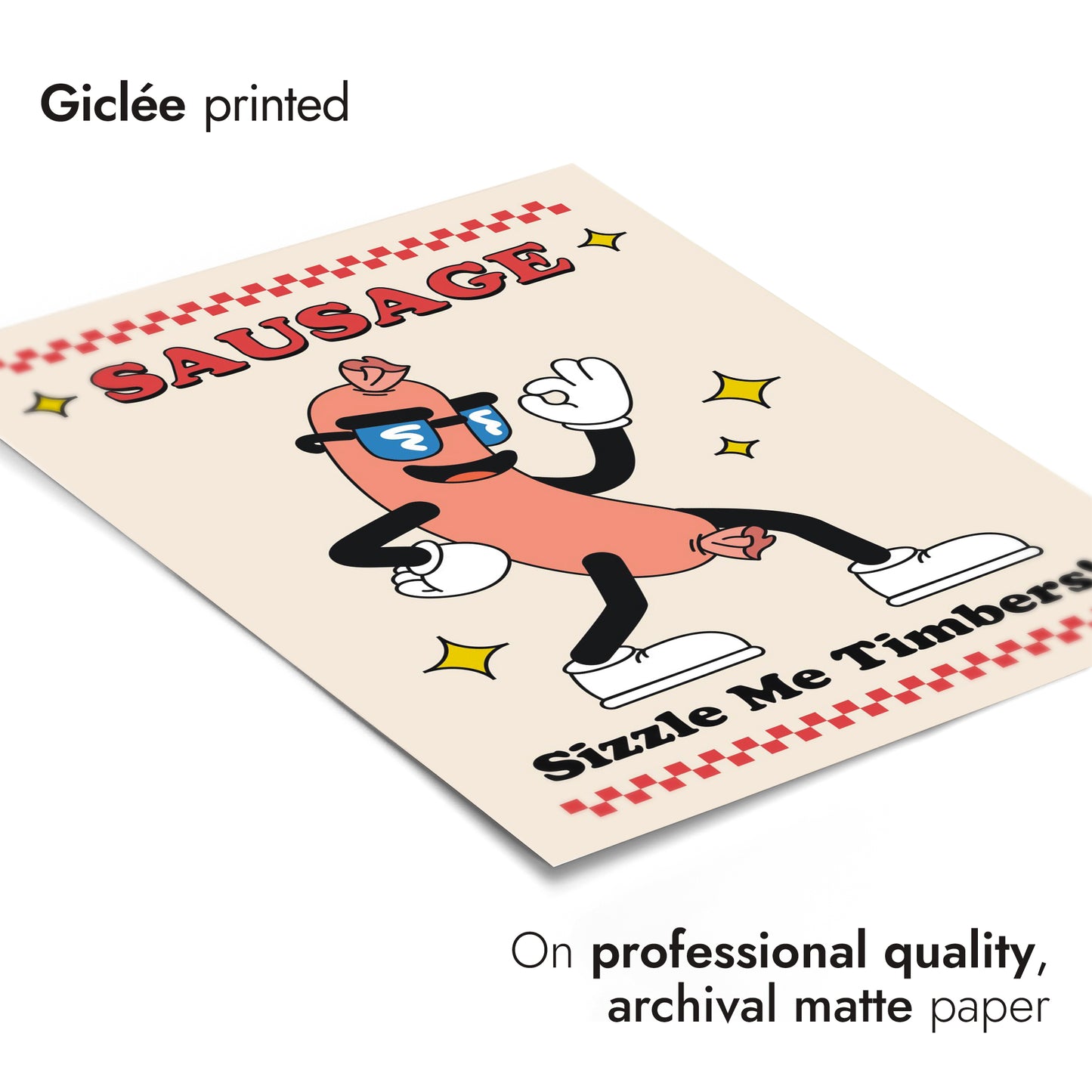 This retro-style poster features a playful cartoon sausage mascot, complete with sunglasses and dancing limbs. Surrounded by sparkling accents and bold typography, the illustration exudes a lively, humorous vibe. Perfect for food enthusiasts or fans of quirky graphic design, it captures a fun and animated atmosphere with its vibrant colors and eye-catching composition. Ideal for adding a touch of whimsy to any space.