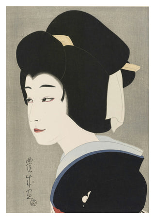 "Sawamura Sonosuke in the Role of Umegawa" by Koka Yamamura is a traditional Japanese woodblock print poster. This elegant portrait captures the refined features of a Kabuki actor in historical attire. The detailed illustration emphasizes intricate kimono design and a classic hairstyle, reflecting the theatrical essence and artistic style of Ukiyo-e. Perfect for decor celebrating Japanese culture and traditional art.
