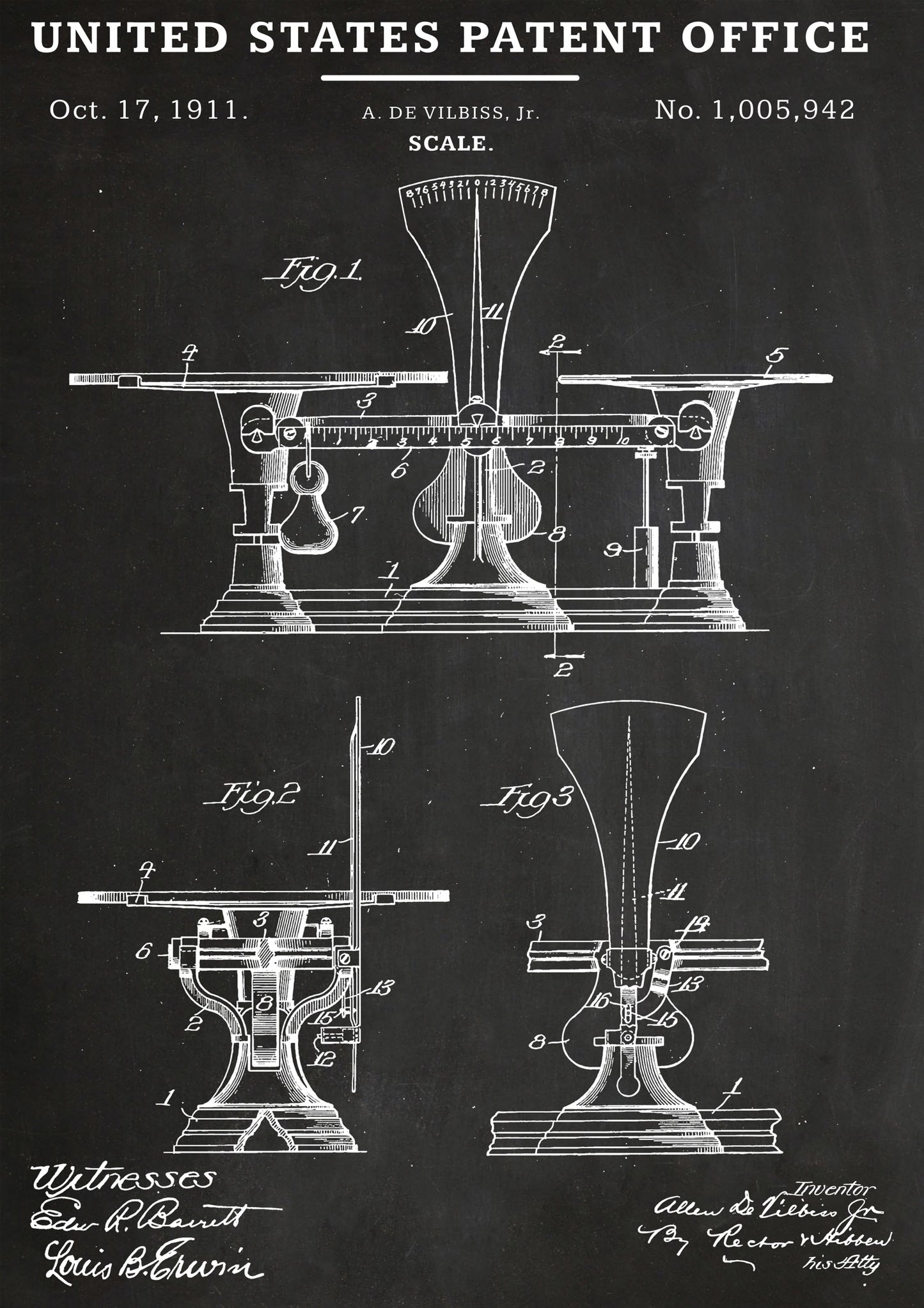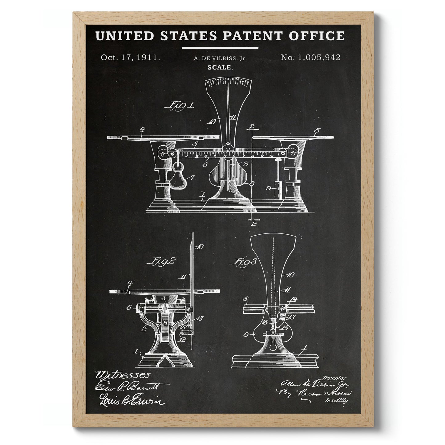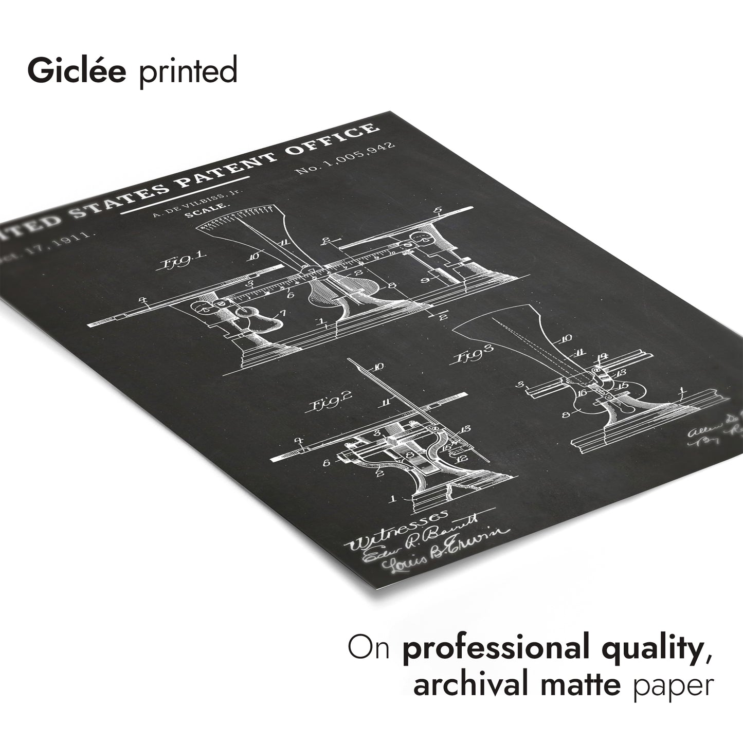 This vintage patent poster showcases detailed, line-art illustrations of a classic weighing scale, highlighting its intricate schematic design. The monochromatic black and white palette exudes a timeless appeal, ideal for enthusiasts of vintage or bakery-themed decor. Featuring precise technical drawings, this artwork brings an industrial touch to any space, making it perfect for educational or design-focused environments.