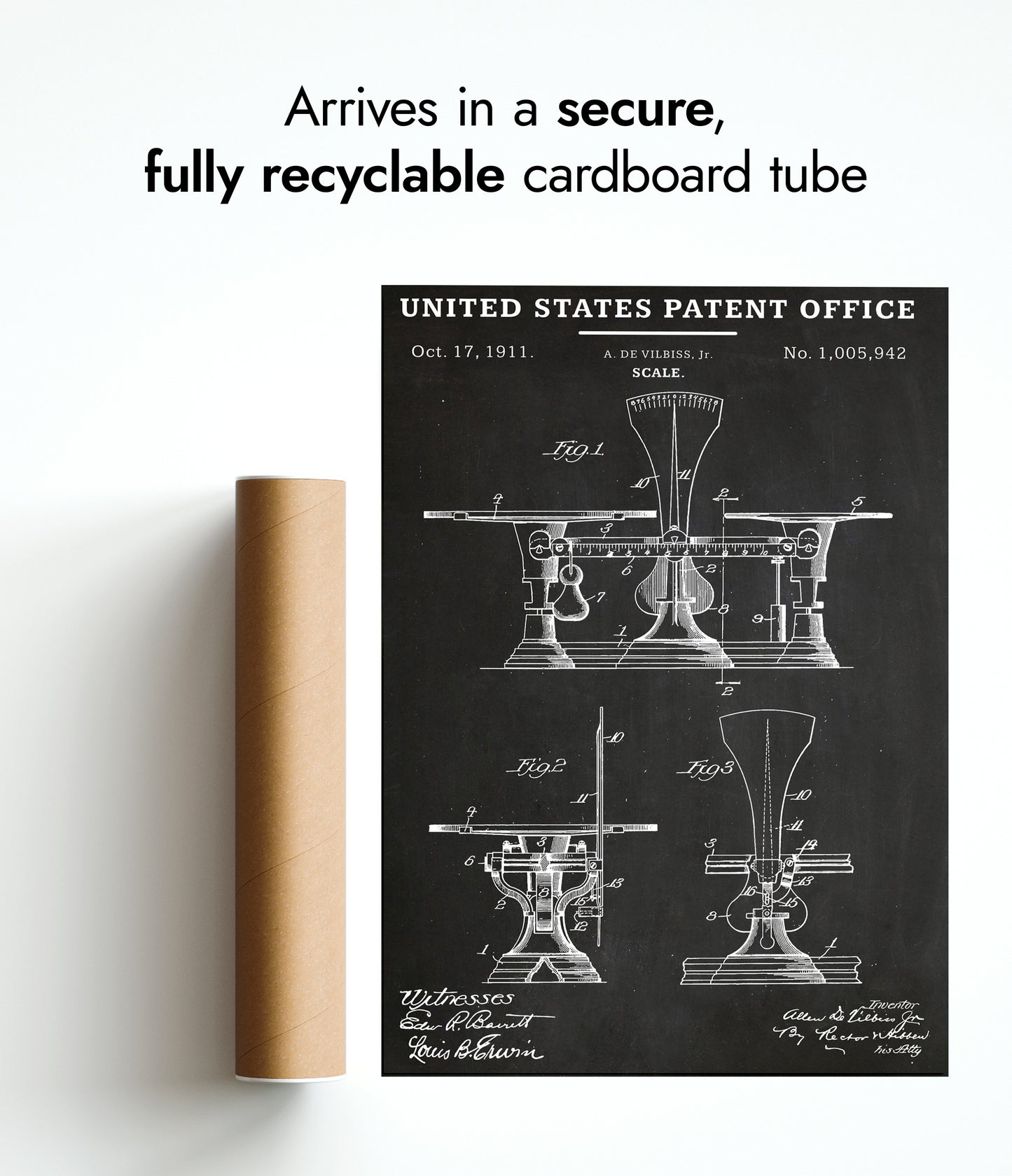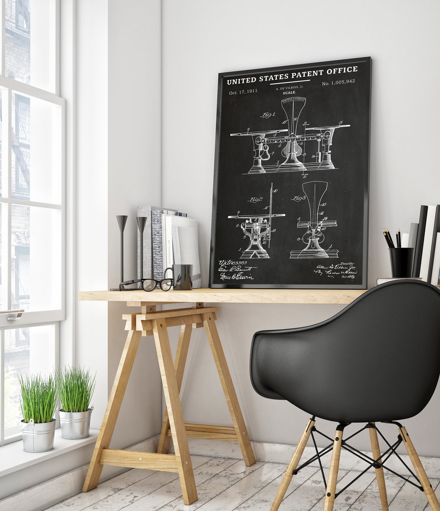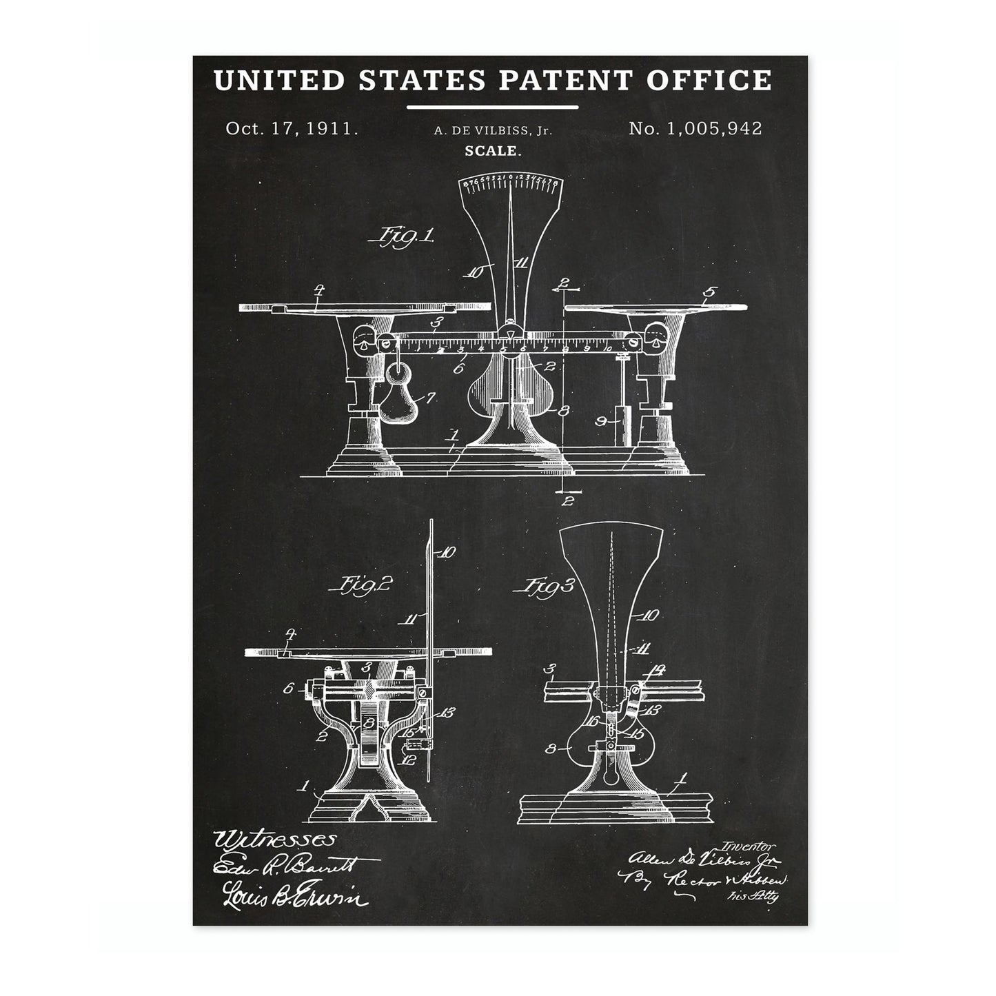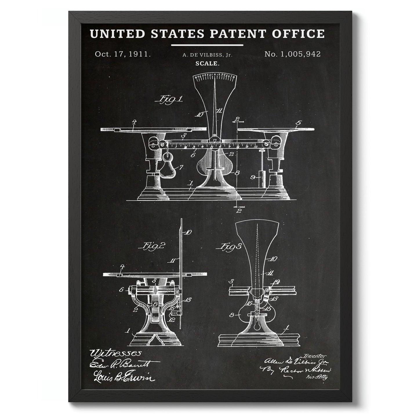 This vintage patent poster showcases detailed, line-art illustrations of a classic weighing scale, highlighting its intricate schematic design. The monochromatic black and white palette exudes a timeless appeal, ideal for enthusiasts of vintage or bakery-themed decor. Featuring precise technical drawings, this artwork brings an industrial touch to any space, making it perfect for educational or design-focused environments.