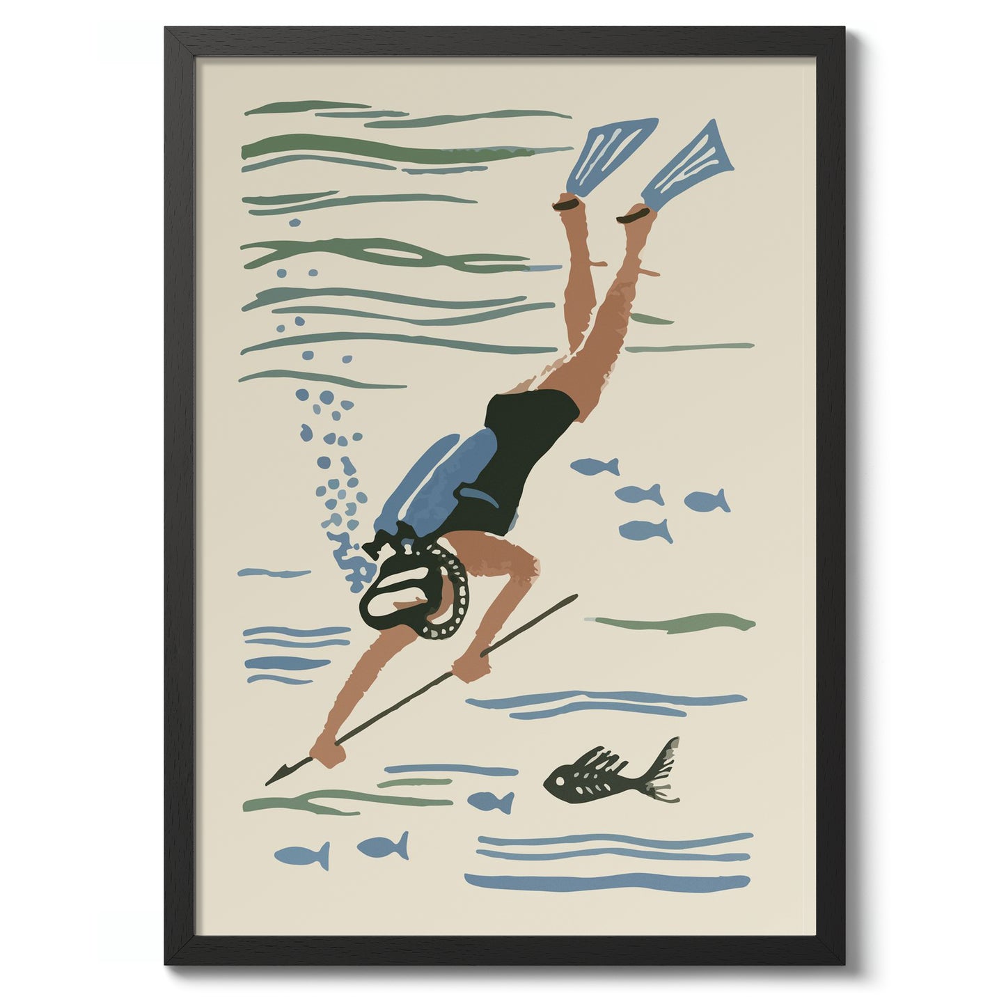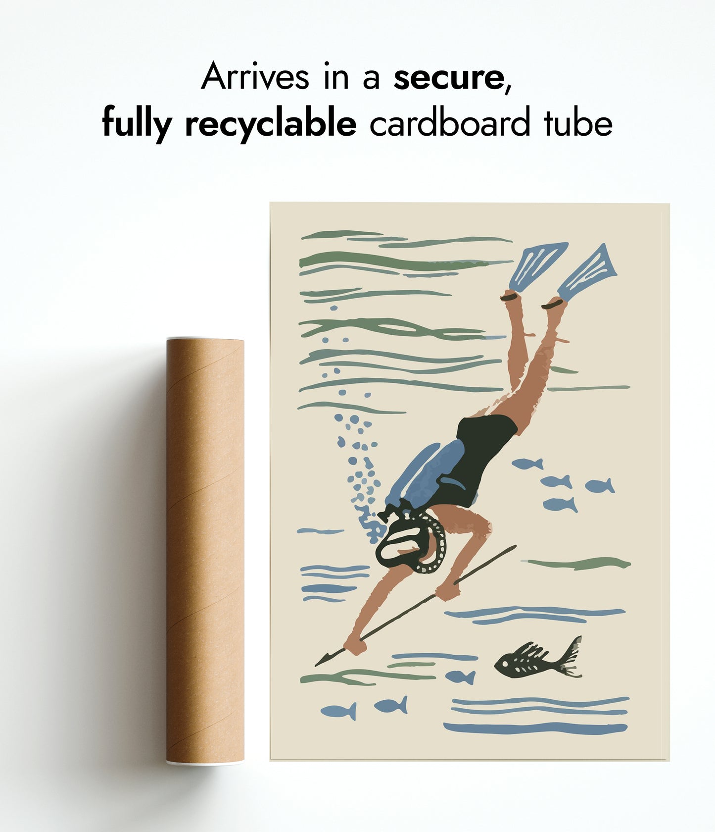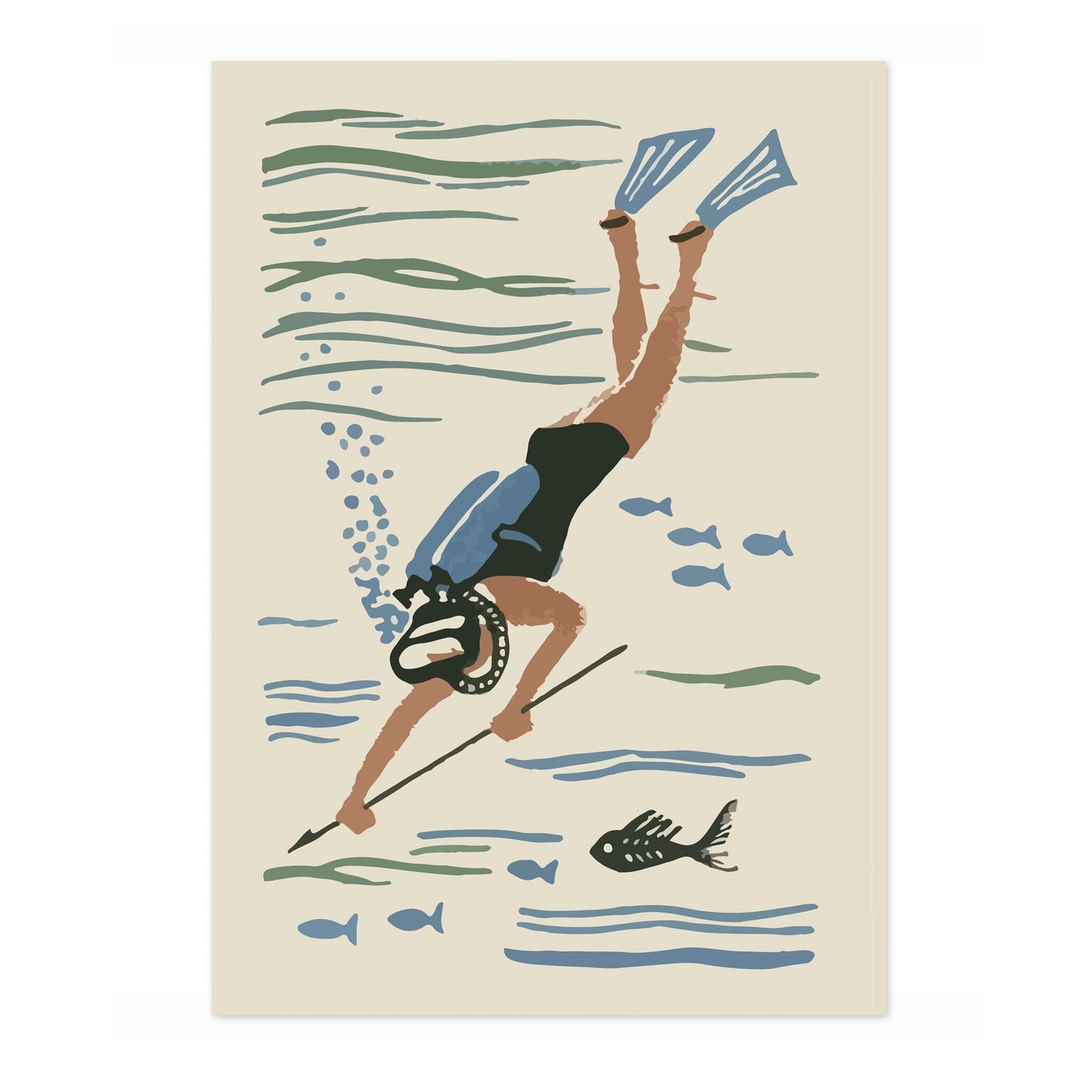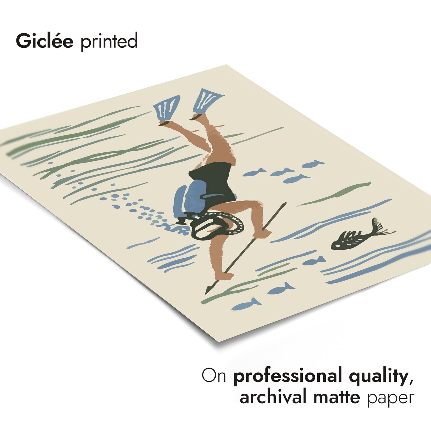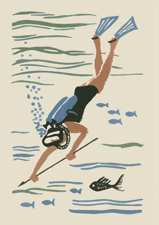 Dive into nostalgia with the "Scuba Diver Matchbox" poster. This vintage-inspired illustration captures a scuba diver exploring beneath the ocean surface, complete with fins, a mask, and a spear amidst fish silhouettes. The soft beige and blue colours evoke a serene underwater world, perfect for fans of scuba diving and aquatic adventures. Ideal for vintage and sea-themed décor.