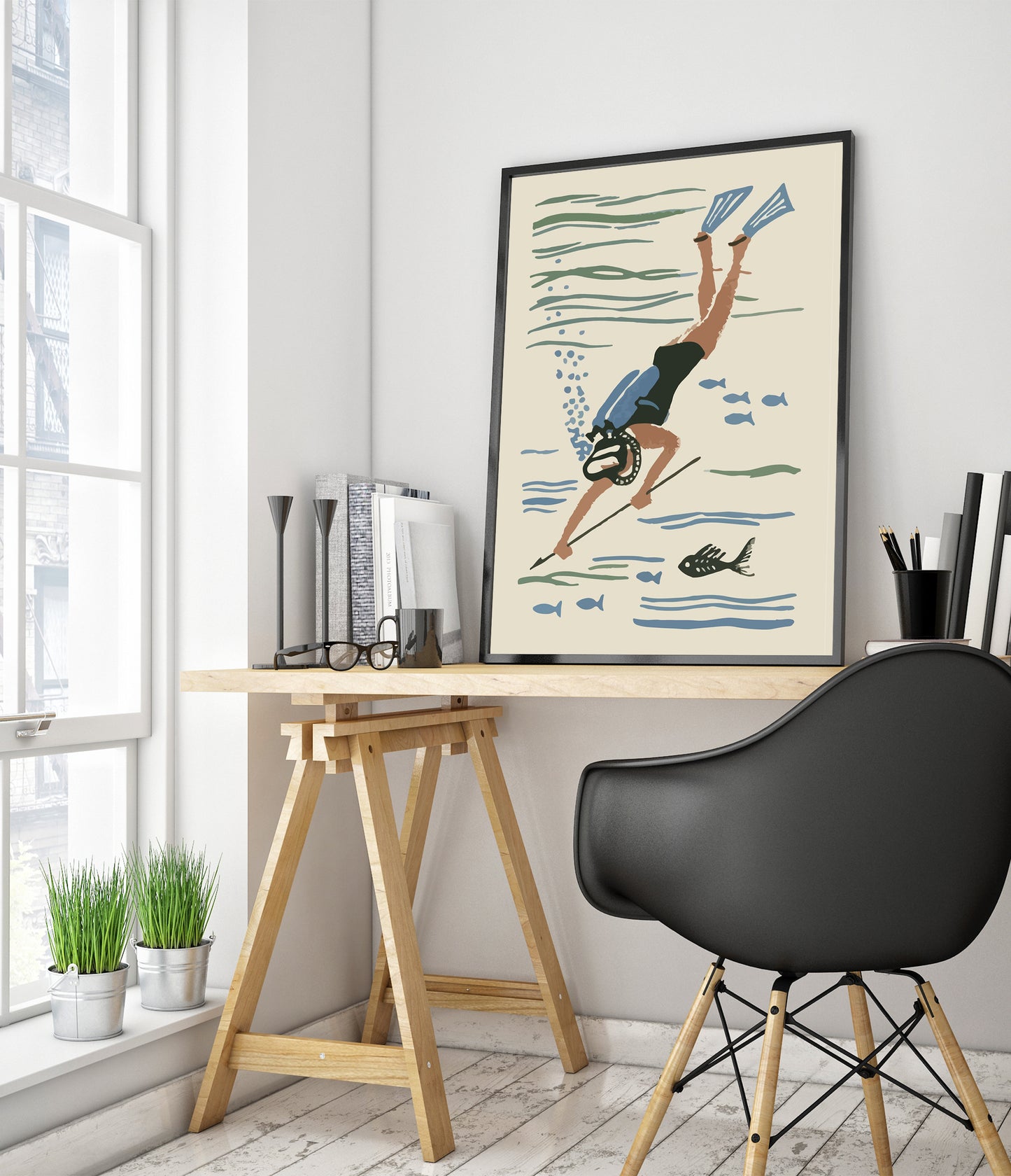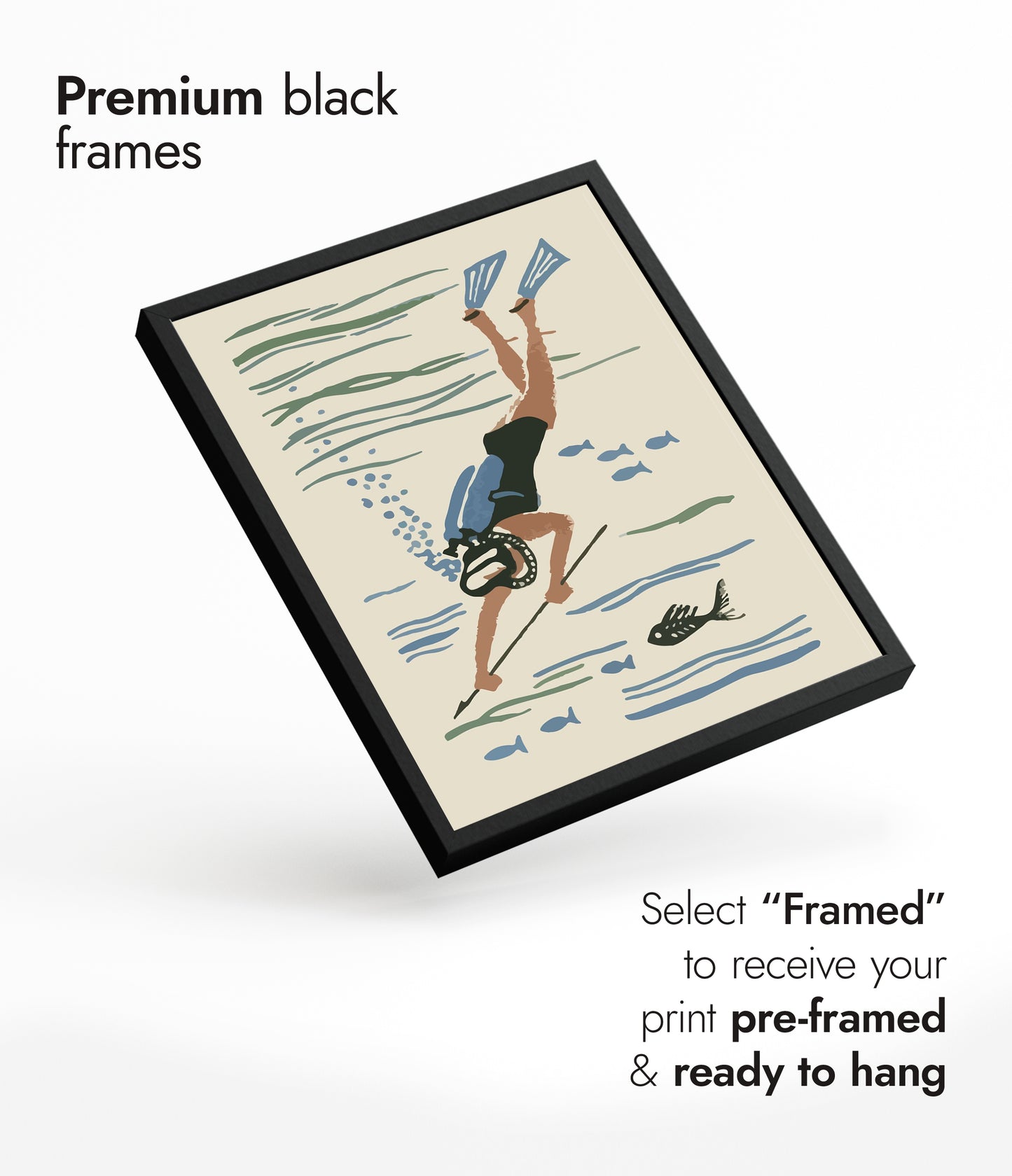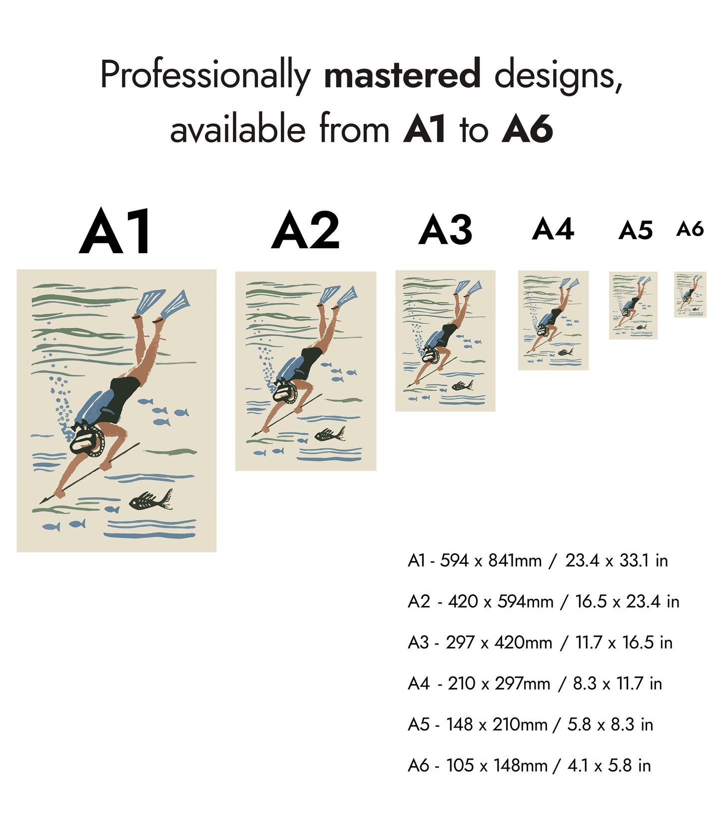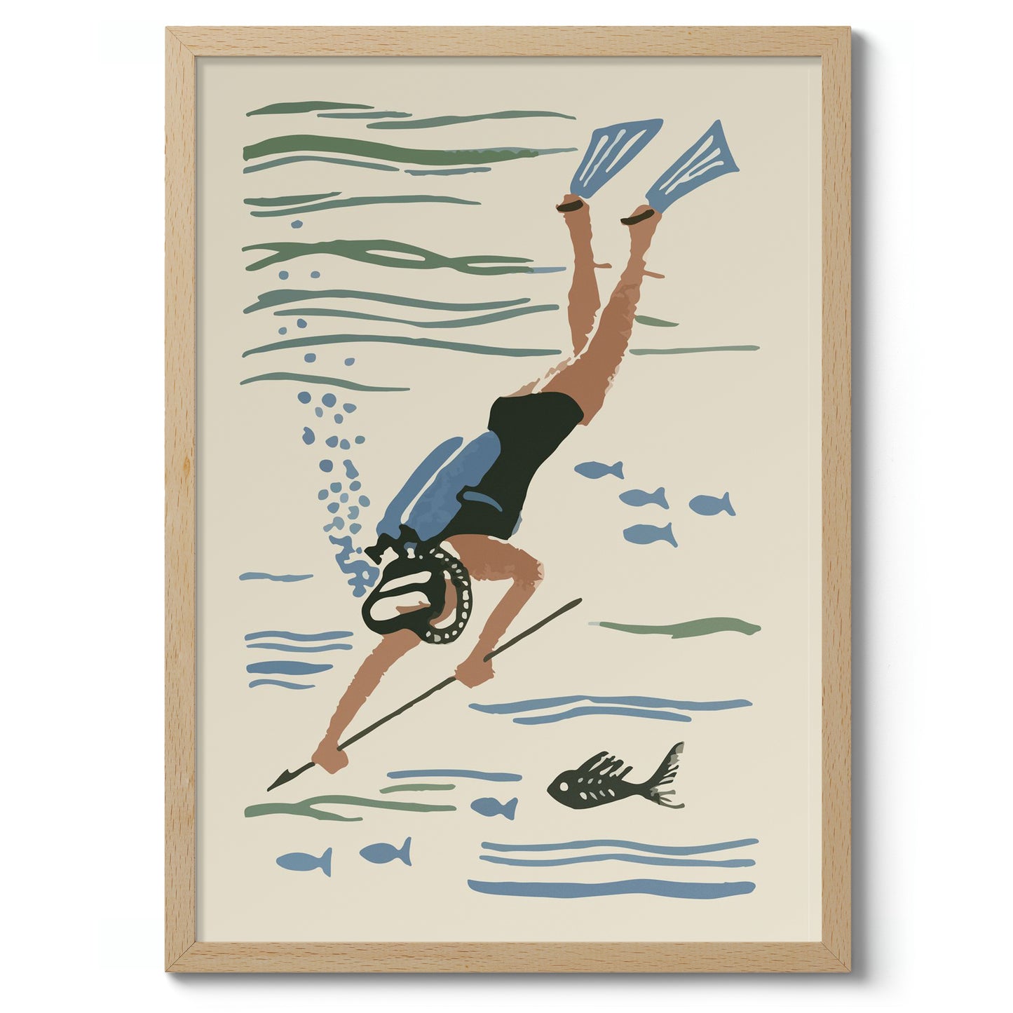 Dive into nostalgia with the "Scuba Diver Matchbox" poster. This vintage-inspired illustration captures a scuba diver exploring beneath the ocean surface, complete with fins, a mask, and a spear amidst fish silhouettes. The soft beige and blue colours evoke a serene underwater world, perfect for fans of scuba diving and aquatic adventures. Ideal for vintage and sea-themed décor.