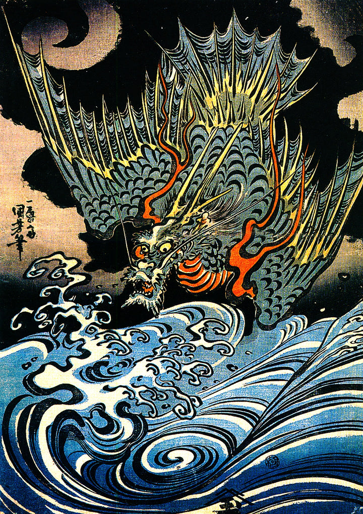 This poster, titled "Sea Dragon" by Utagawa Kuniyoshi, showcases a mythical dragon emerging powerfully from turbulent waves. Rendered in traditional Japanese woodblock Ukiyo-E style, the dynamic composition captures the raw energy and intricate detailing of the dragon and sea. Perfect for fans of Japanese art and mythical themes.