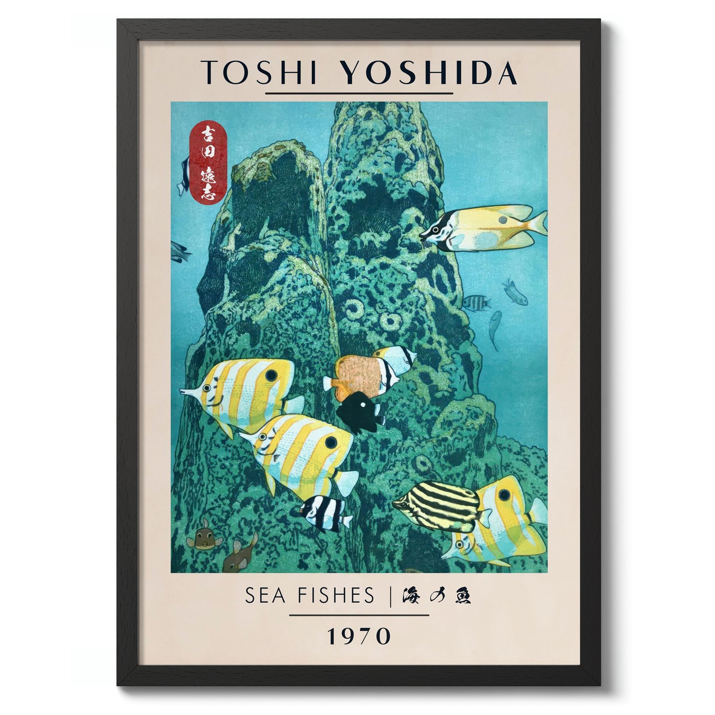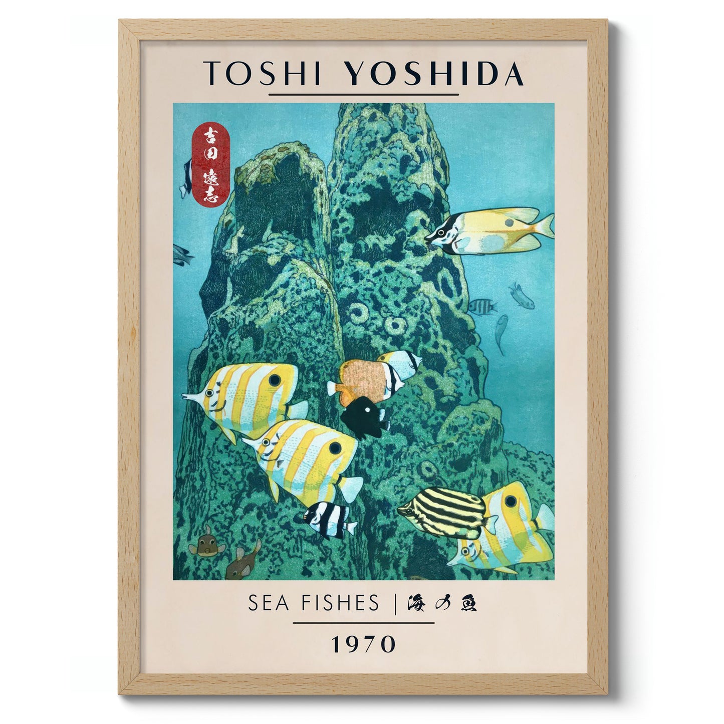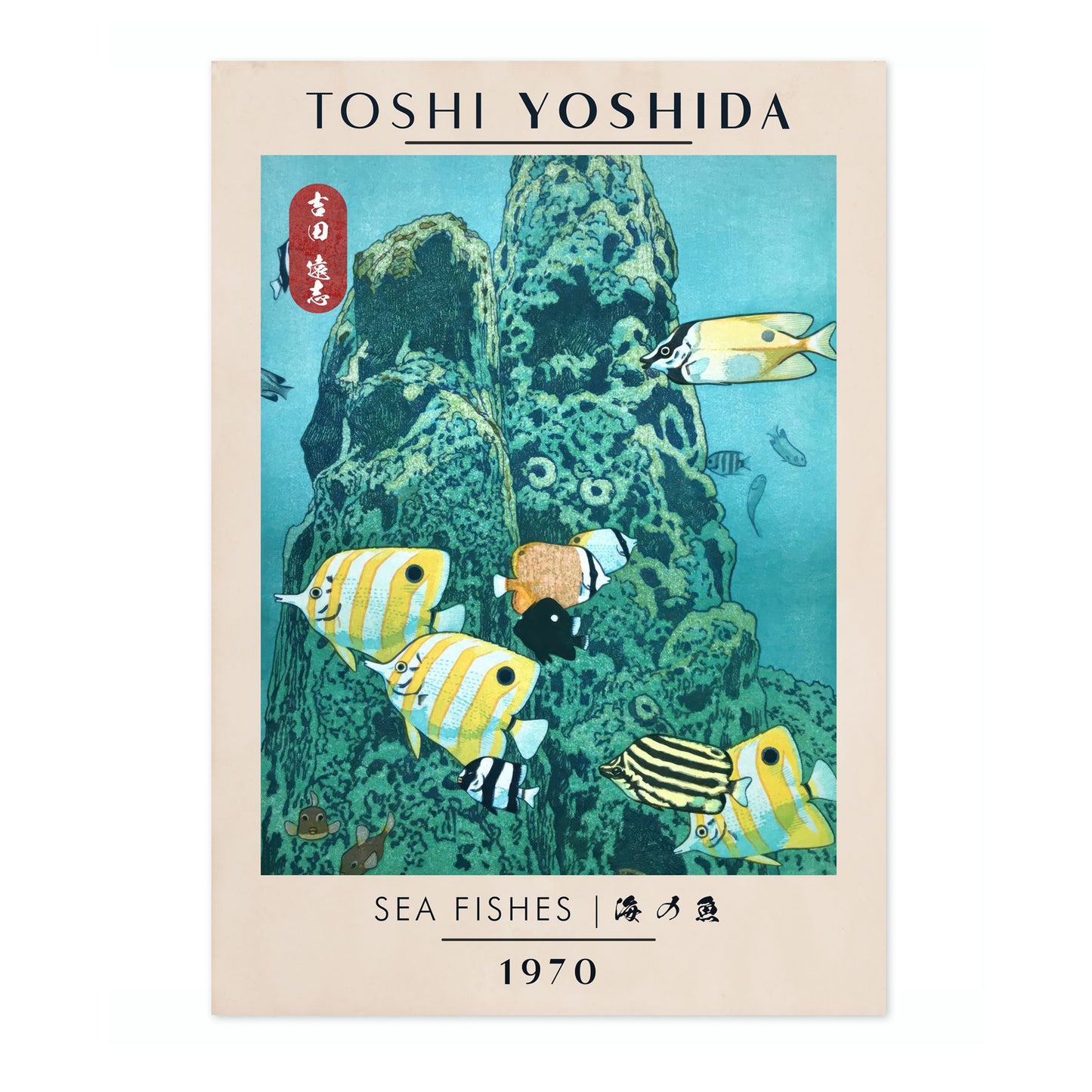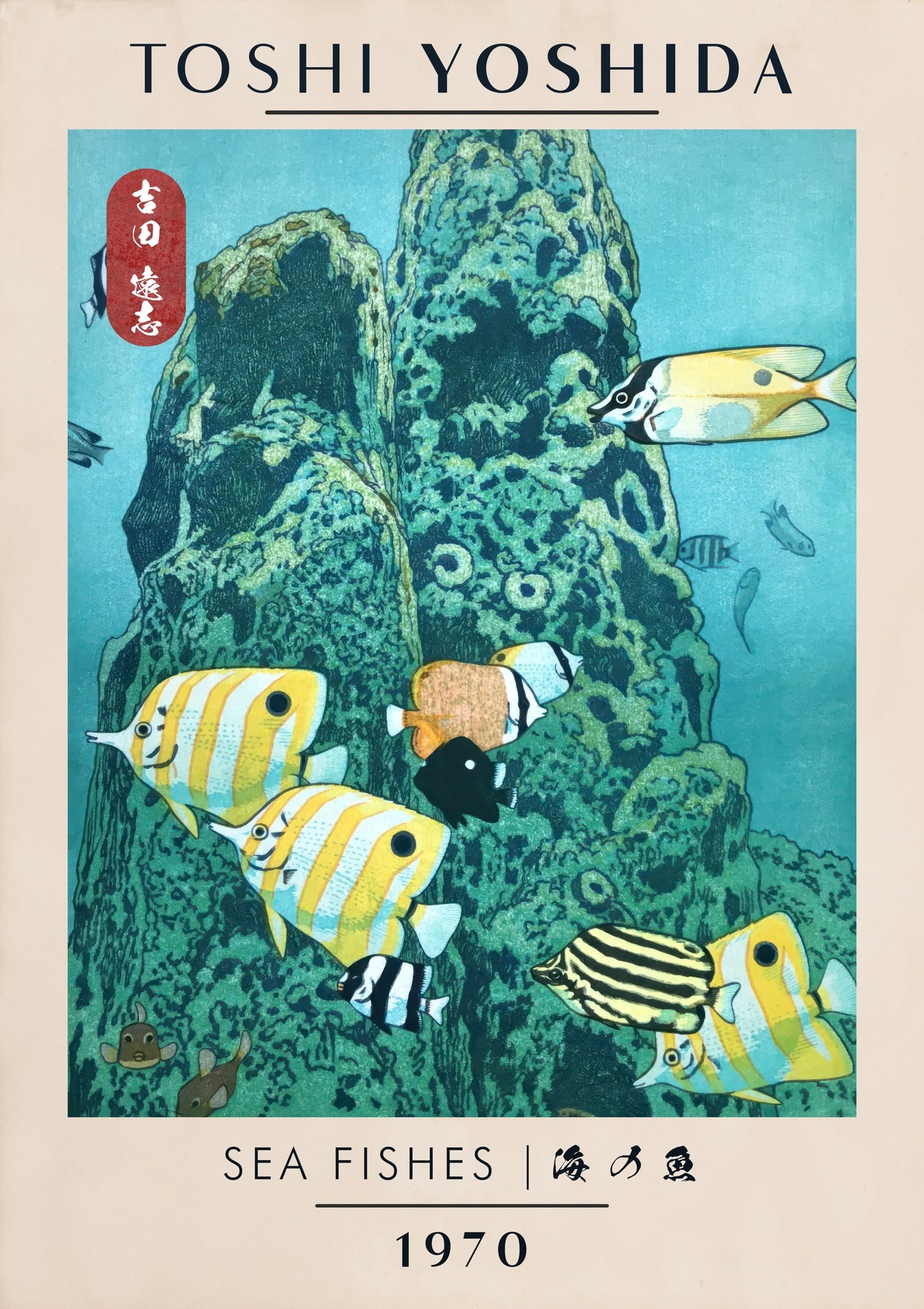 This "Sea Fishes" poster by Toshi Yoshida showcases a vibrant underwater scene with diverse marine life, rendered in traditional Japanese woodblock style. The piece features an array of colorful fish amidst lush coral formations, highlighted by hues of blue and green. Created in 1970, this artwork invites viewers into an enchanting oceanic world, perfect for nature and art enthusiasts alike.