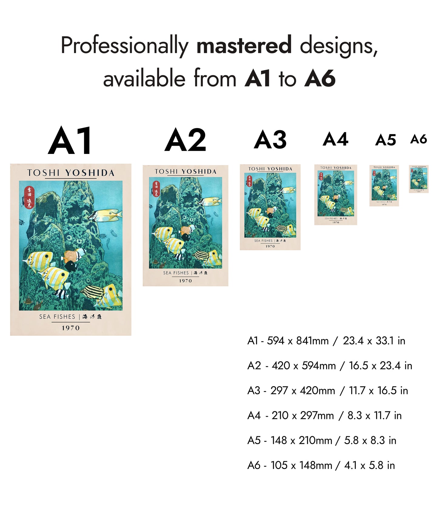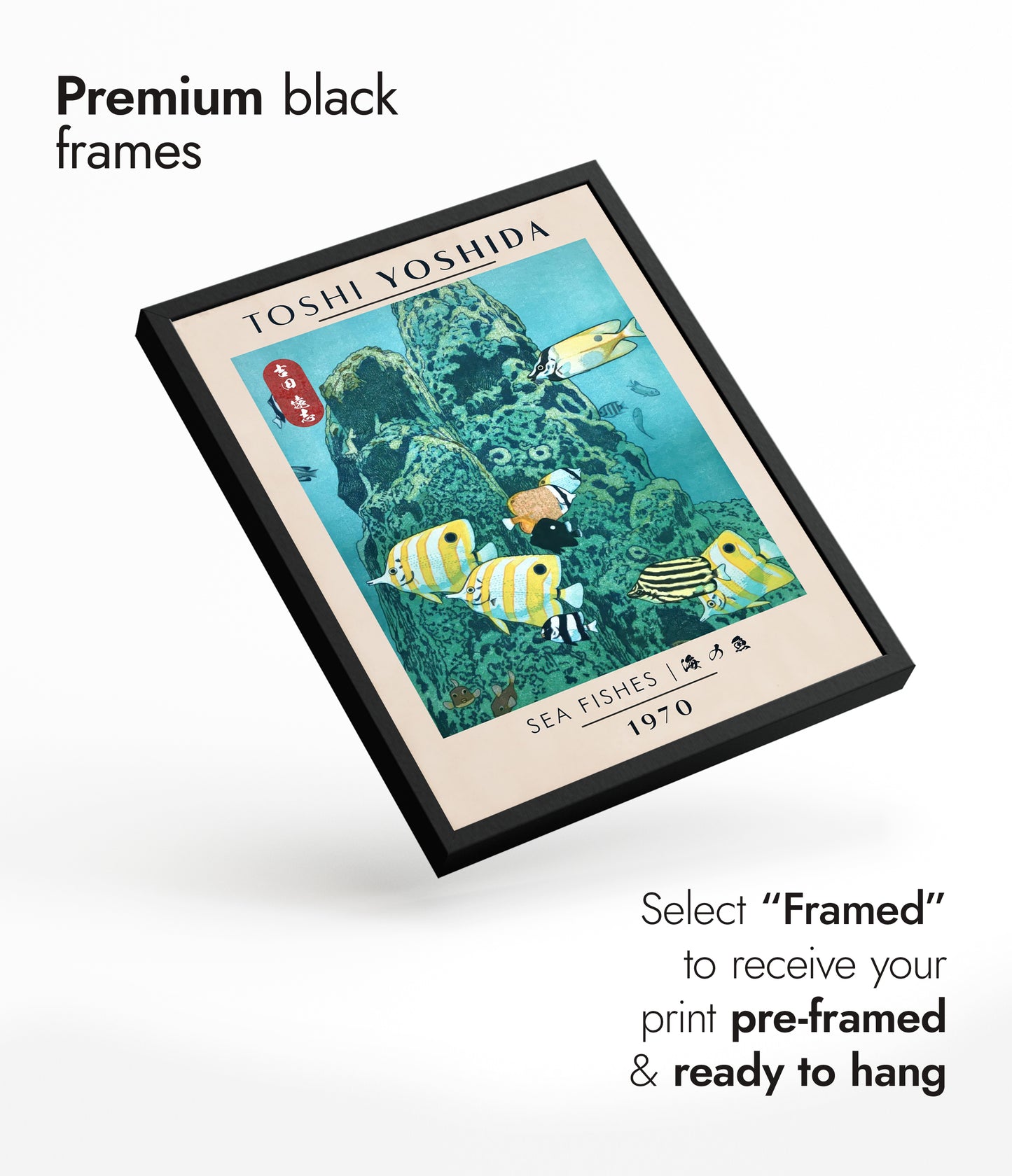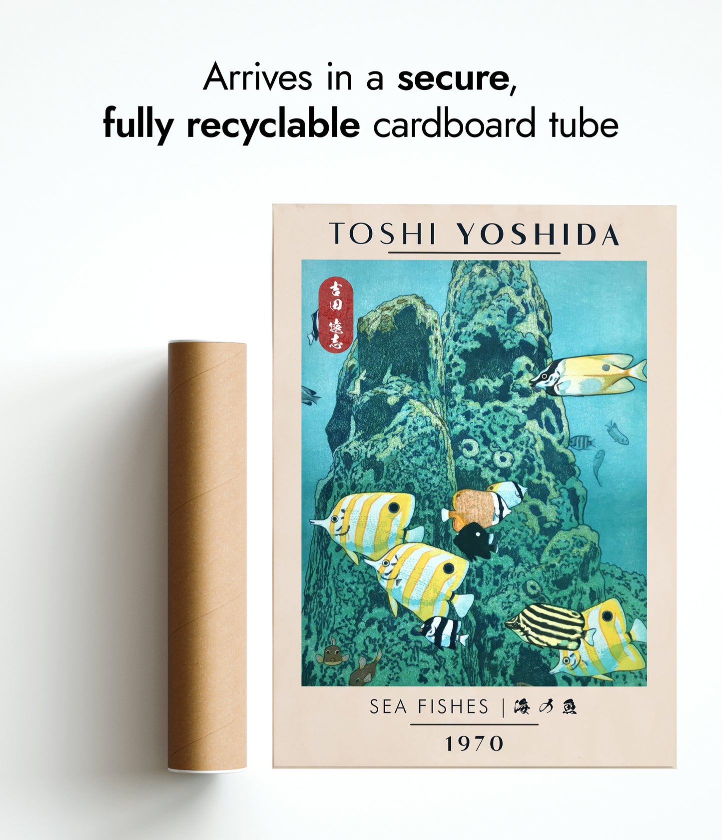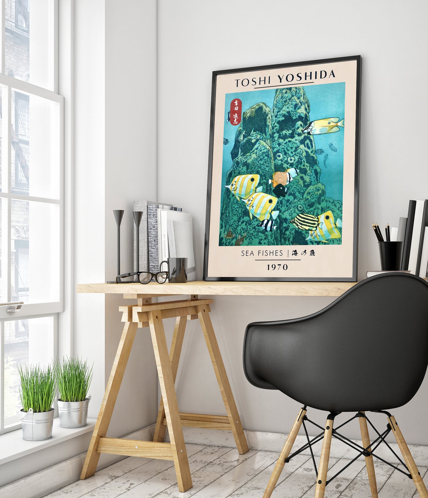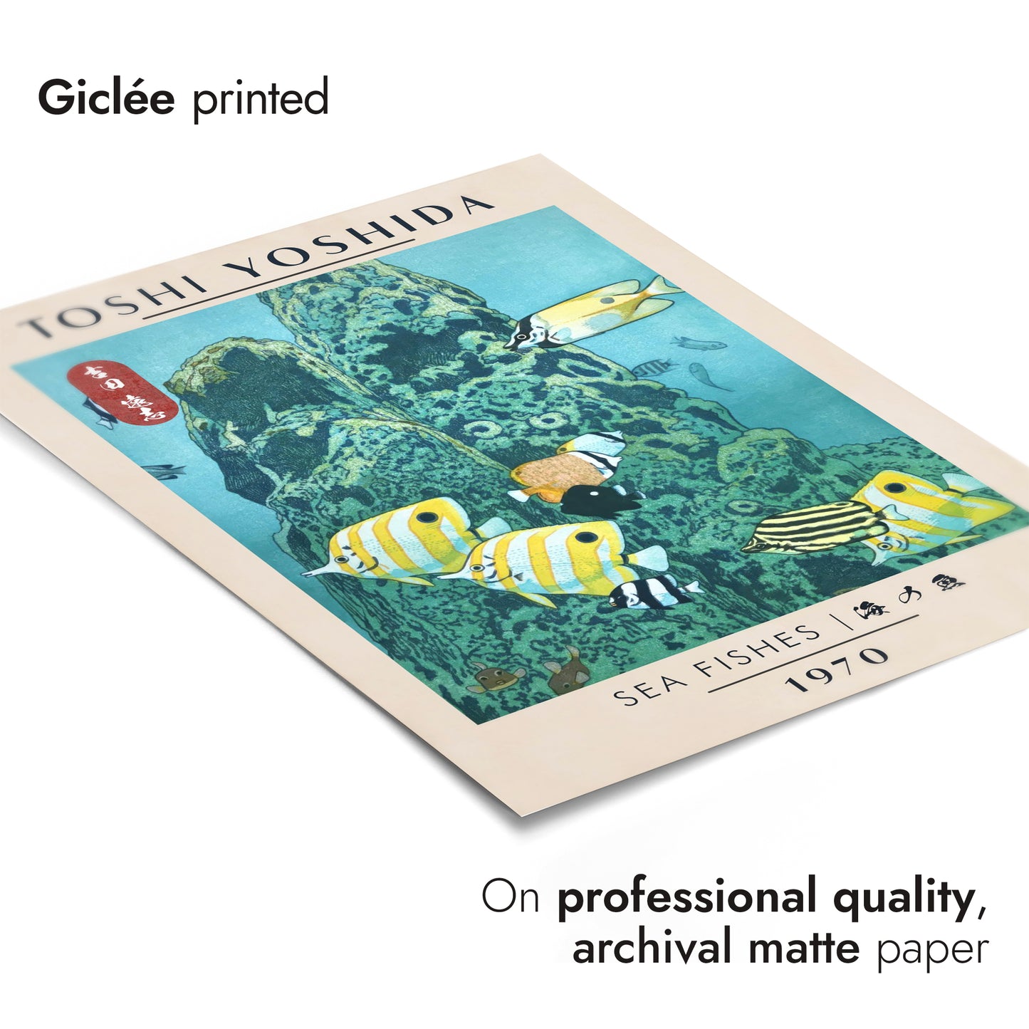 This "Sea Fishes" poster by Toshi Yoshida showcases a vibrant underwater scene with diverse marine life, rendered in traditional Japanese woodblock style. The piece features an array of colorful fish amidst lush coral formations, highlighted by hues of blue and green. Created in 1970, this artwork invites viewers into an enchanting oceanic world, perfect for nature and art enthusiasts alike.