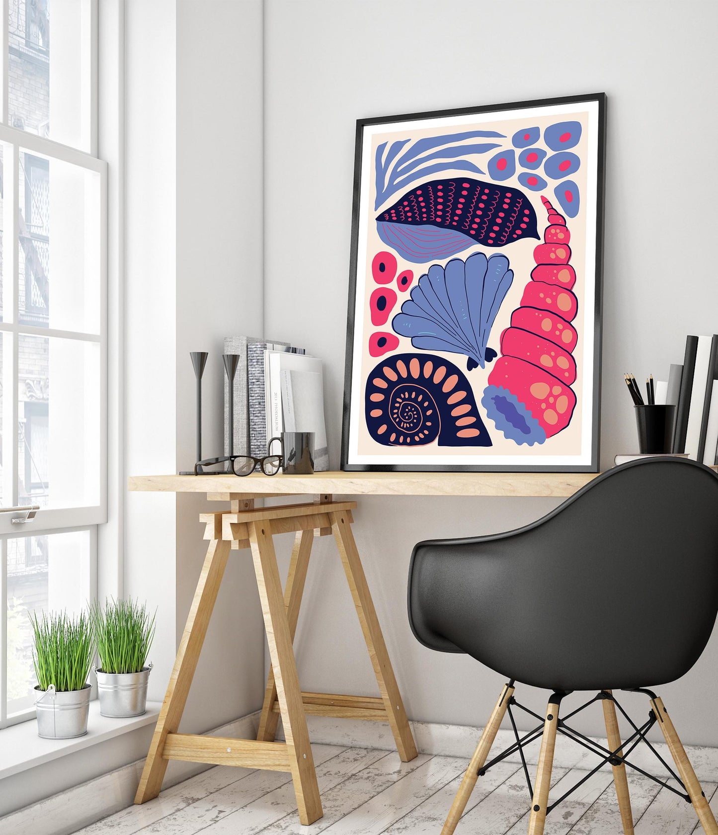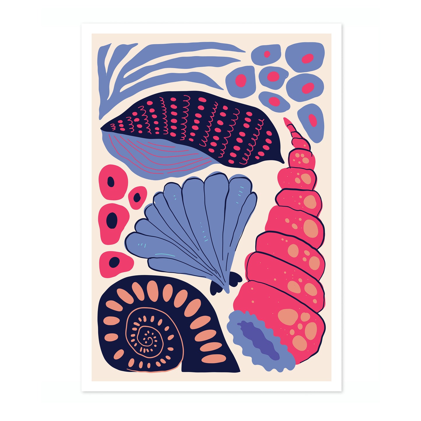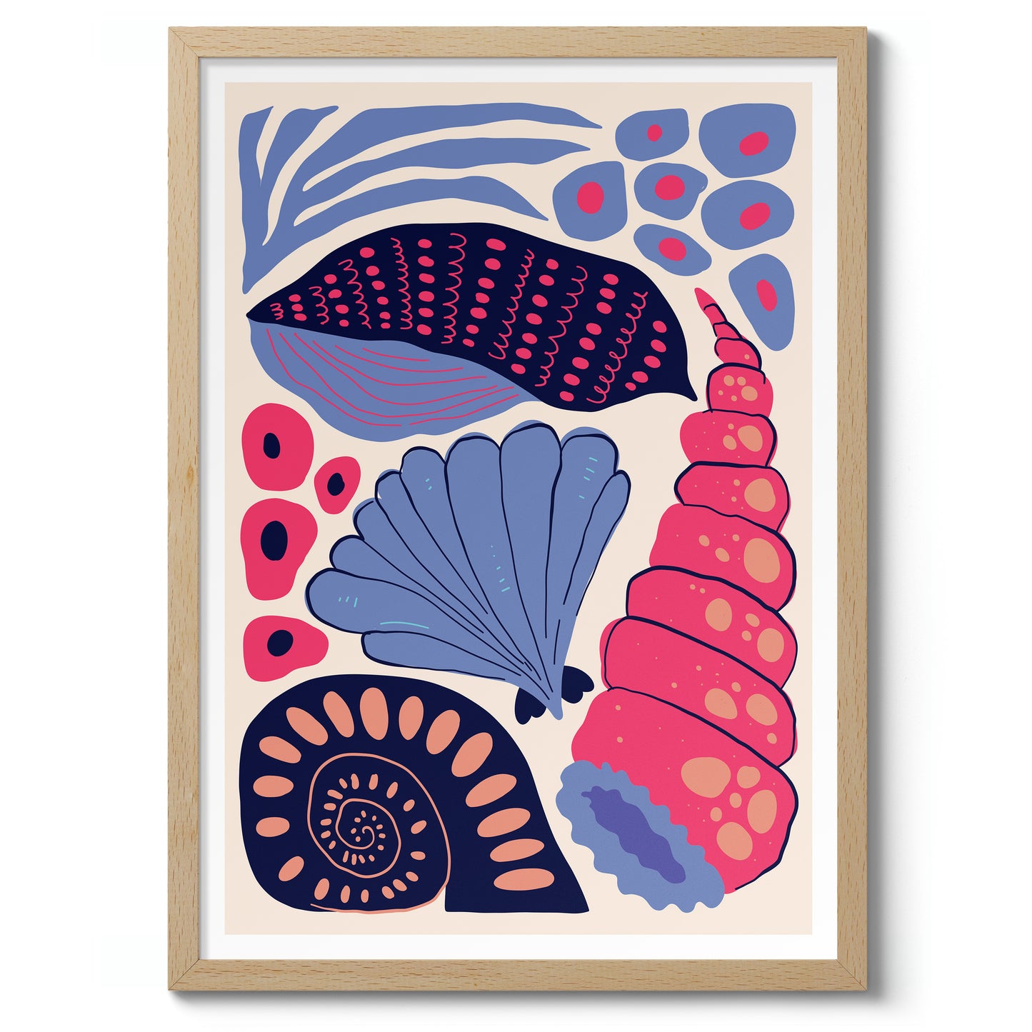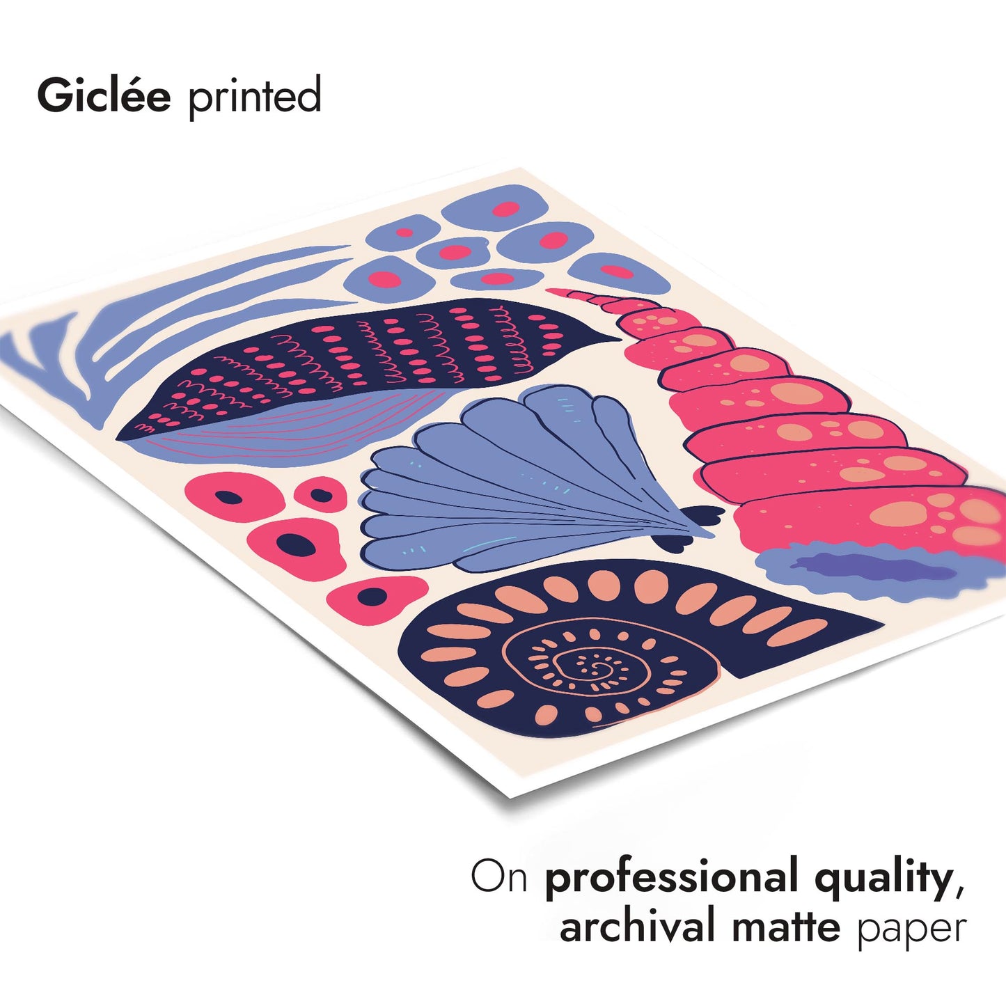 "Sea Shells" features a vibrant collage of seashells and marine elements in bold, contrasting hues of pink, blue, and navy. This graphic-style poster beautifully integrates seaweed and leaf motifs, creating a playful yet sophisticated aesthetic. Ideal for nursery decor, this art print adds a touch of the ocean's whimsy to any space.