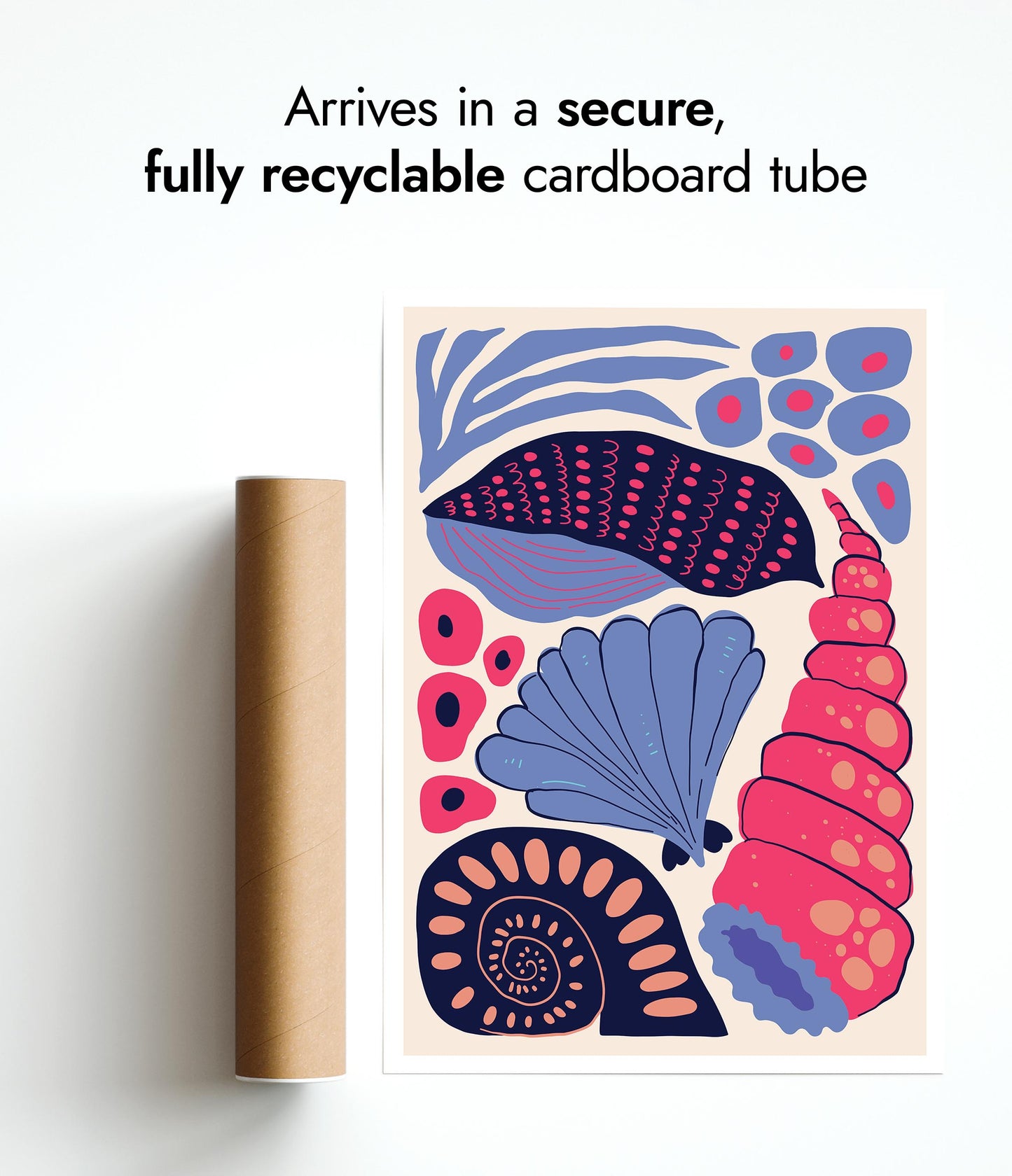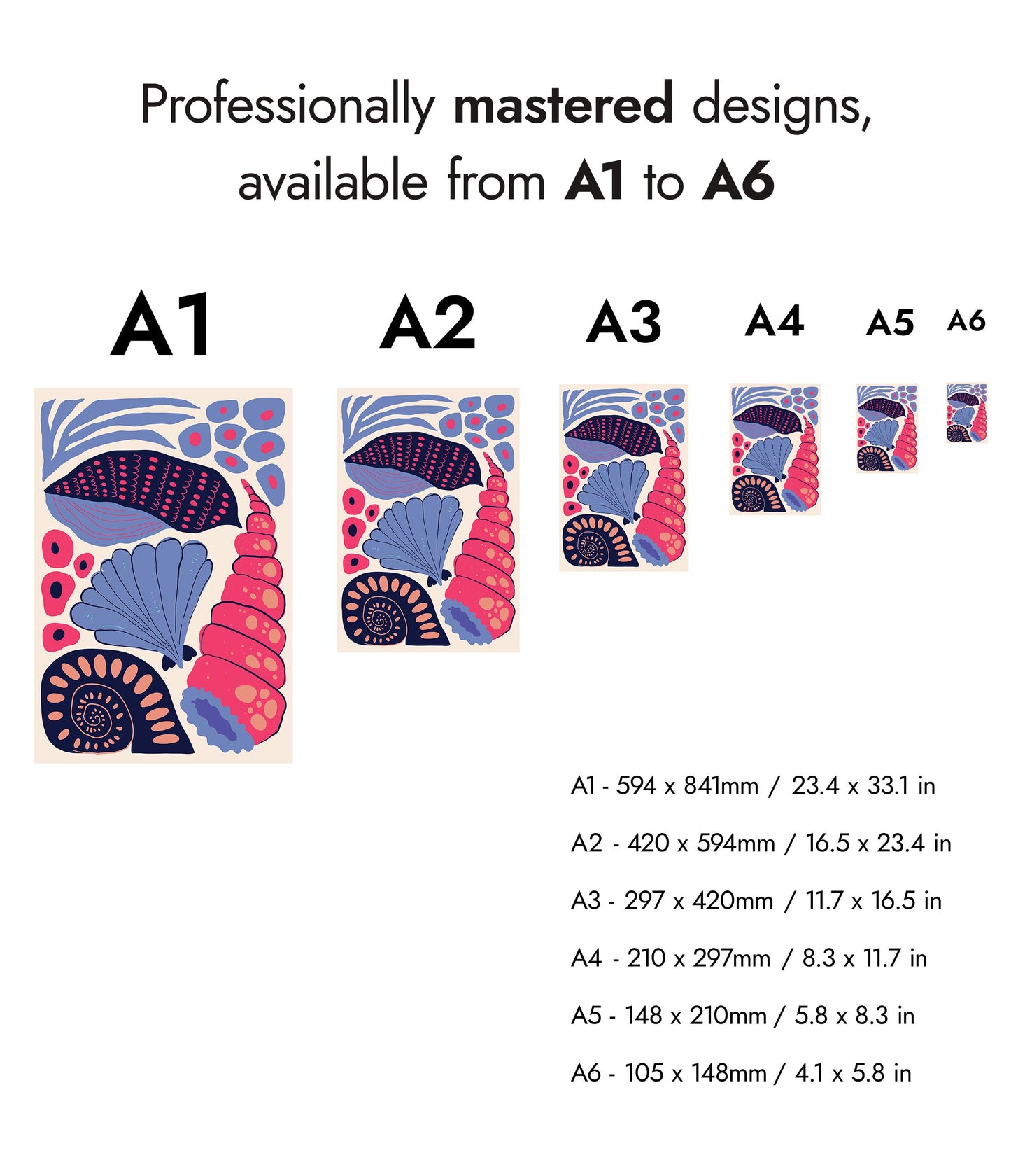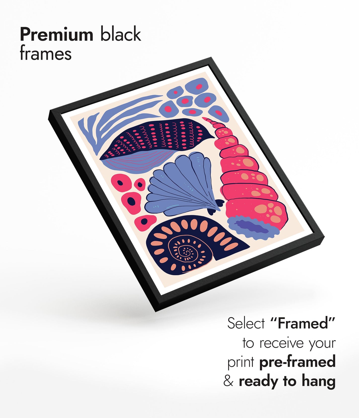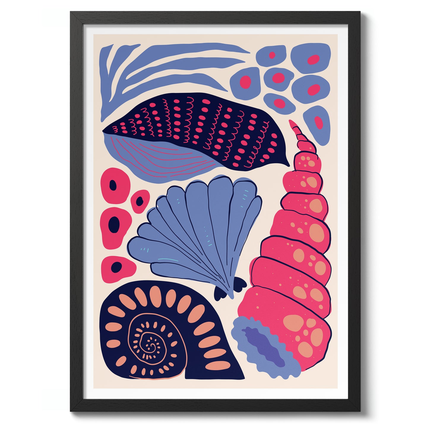"Sea Shells" features a vibrant collage of seashells and marine elements in bold, contrasting hues of pink, blue, and navy. This graphic-style poster beautifully integrates seaweed and leaf motifs, creating a playful yet sophisticated aesthetic. Ideal for nursery decor, this art print adds a touch of the ocean's whimsy to any space.