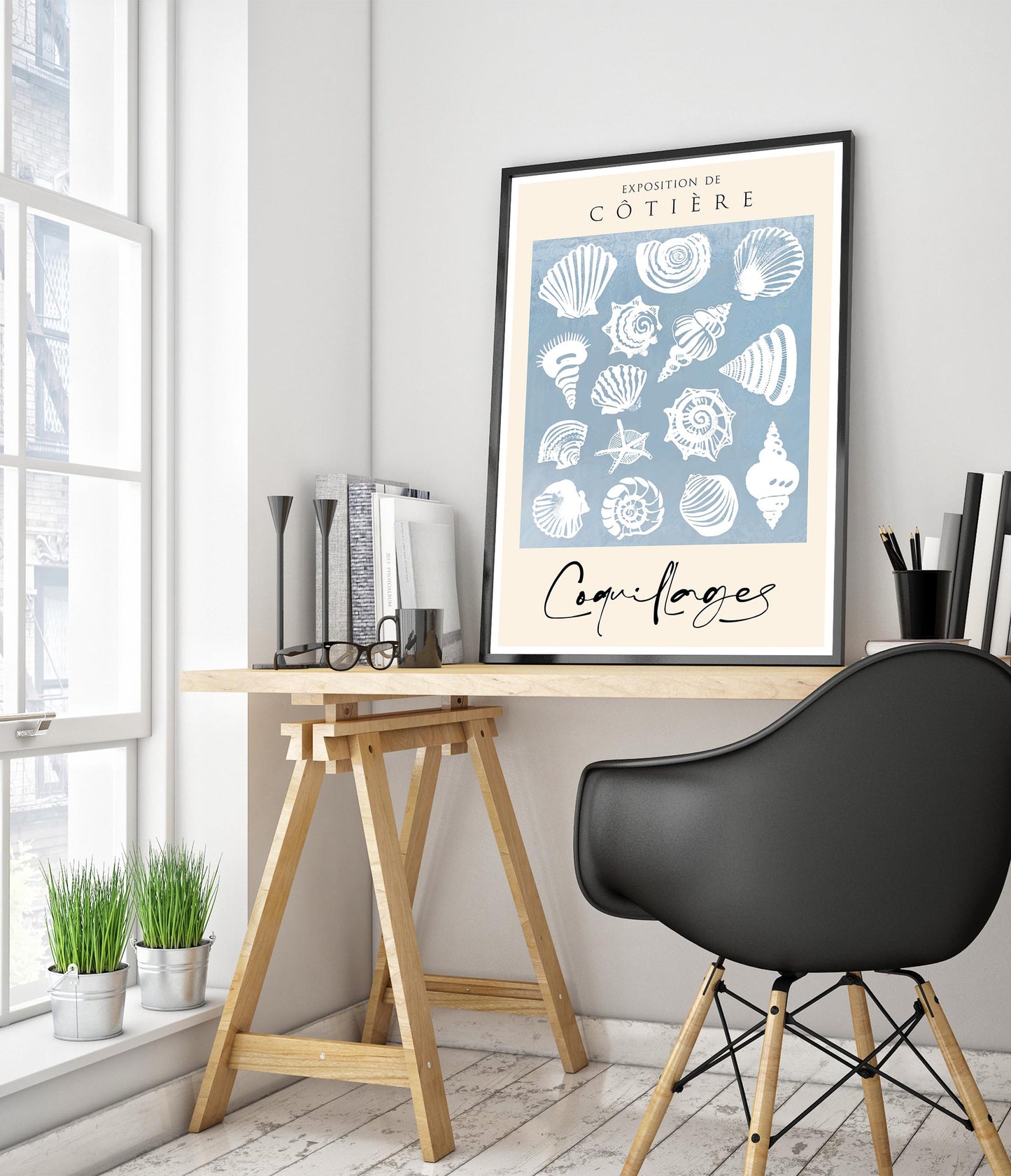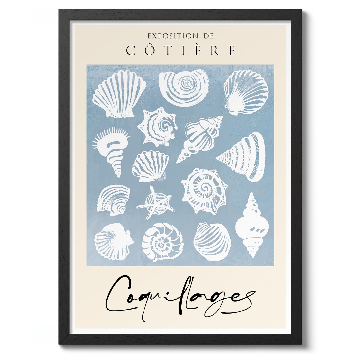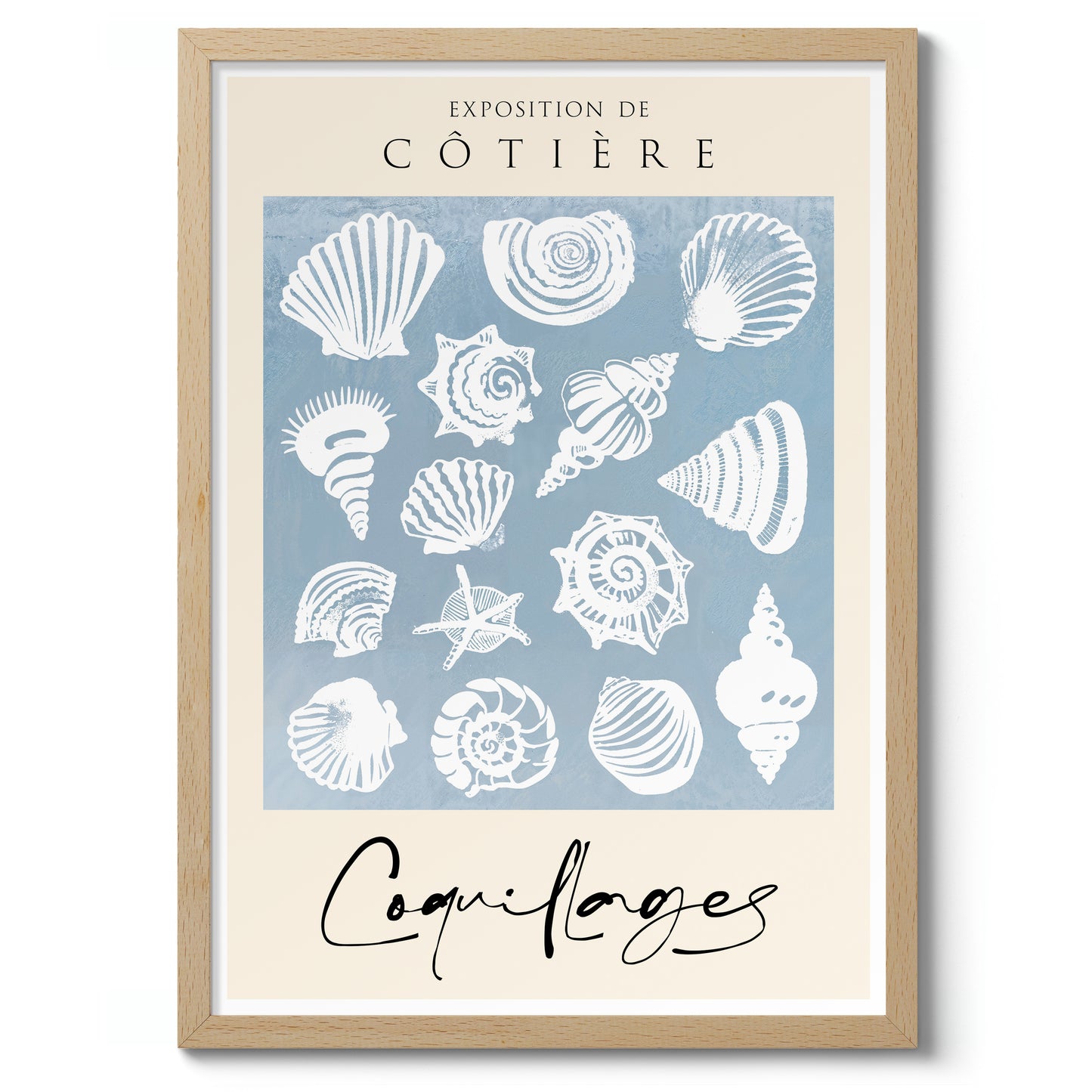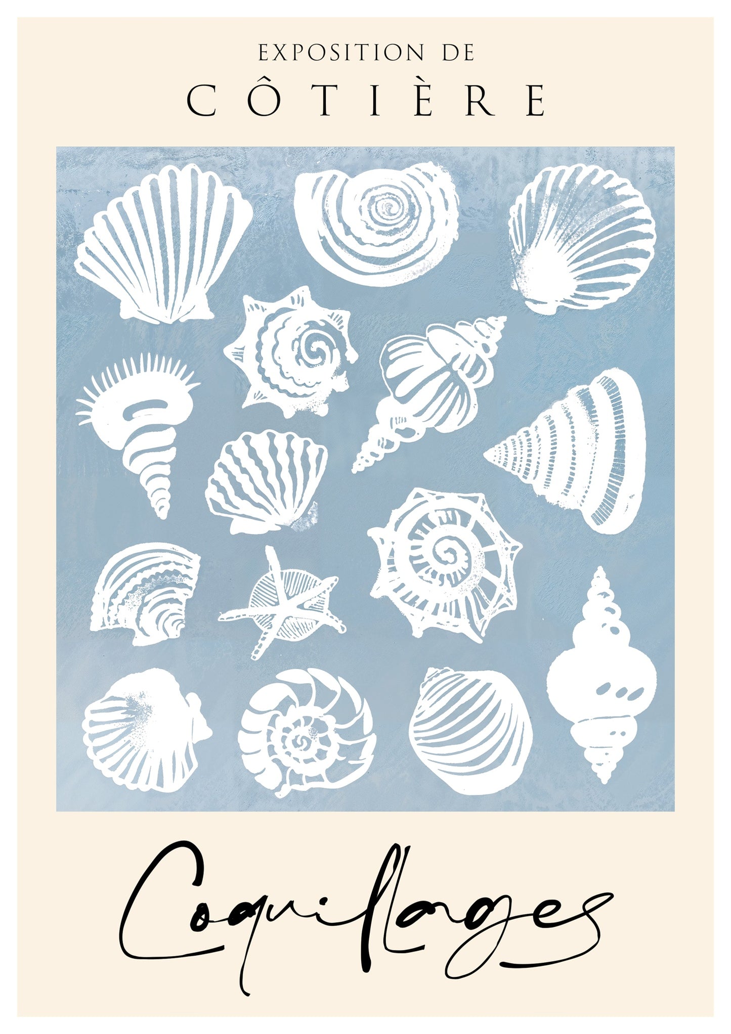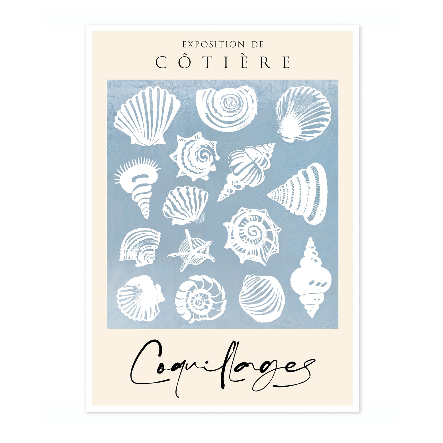 The "Sea Shells" poster features a vintage-style illustration of various sea shells on a soothing blue background. The intricate crustacean designs evoke a coastal exhibition feel, perfect for adding a touch of seaside charm to any space. Ideal for nature enthusiasts and those who appreciate marine life illustrations. This portrait captures the essence of coastal beauty.