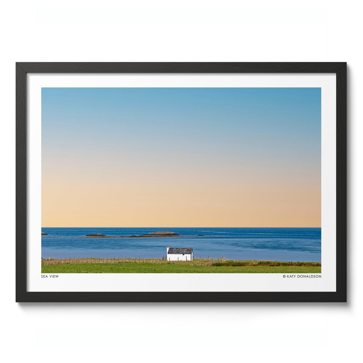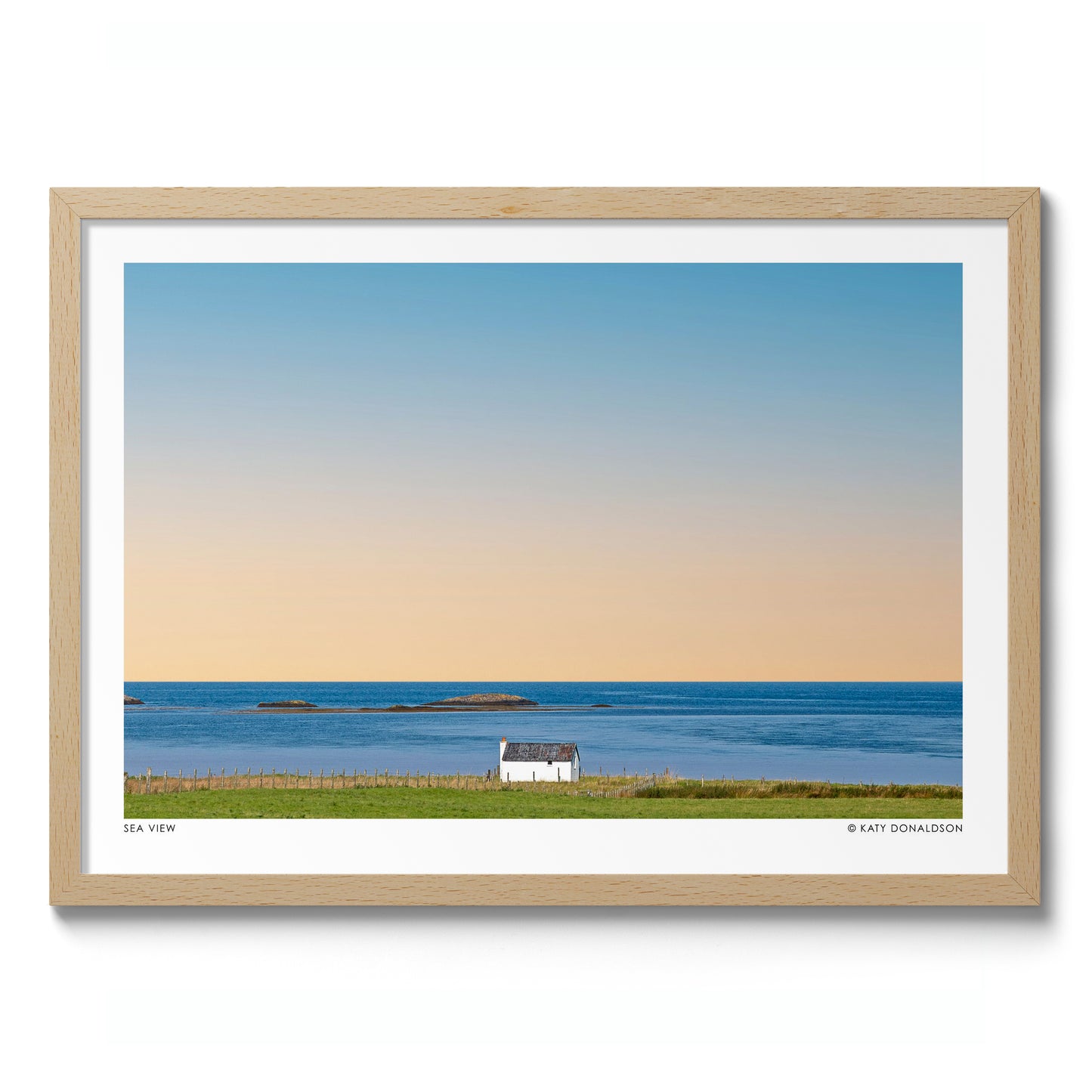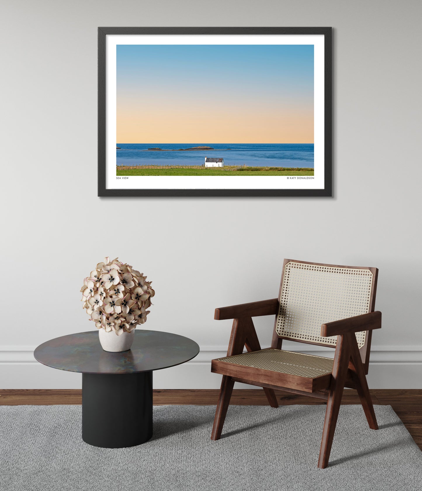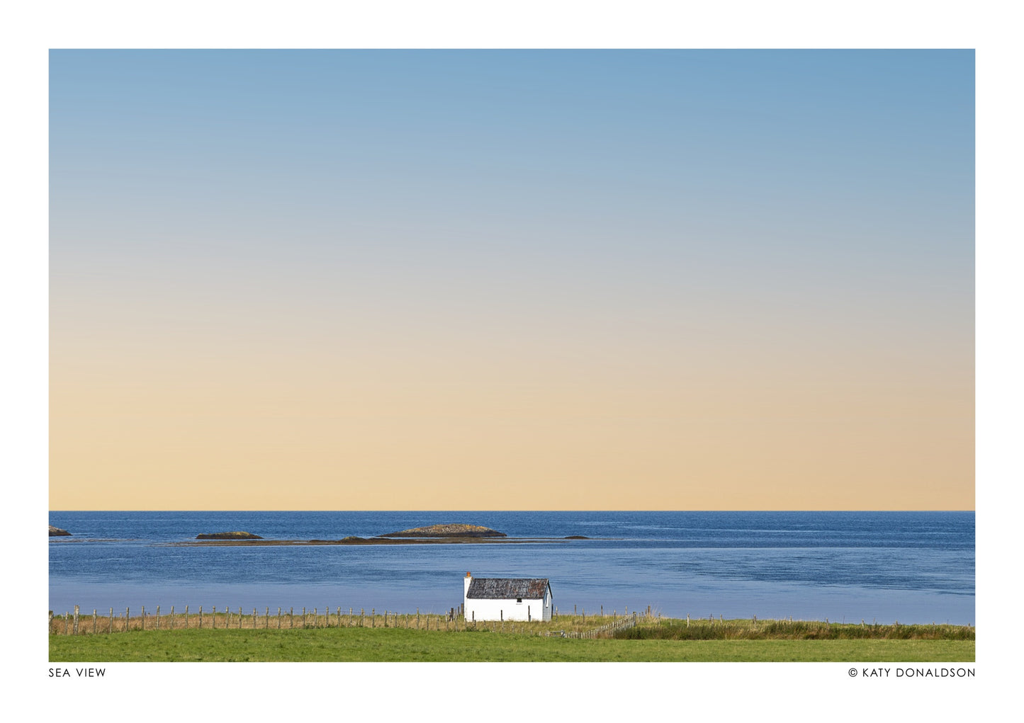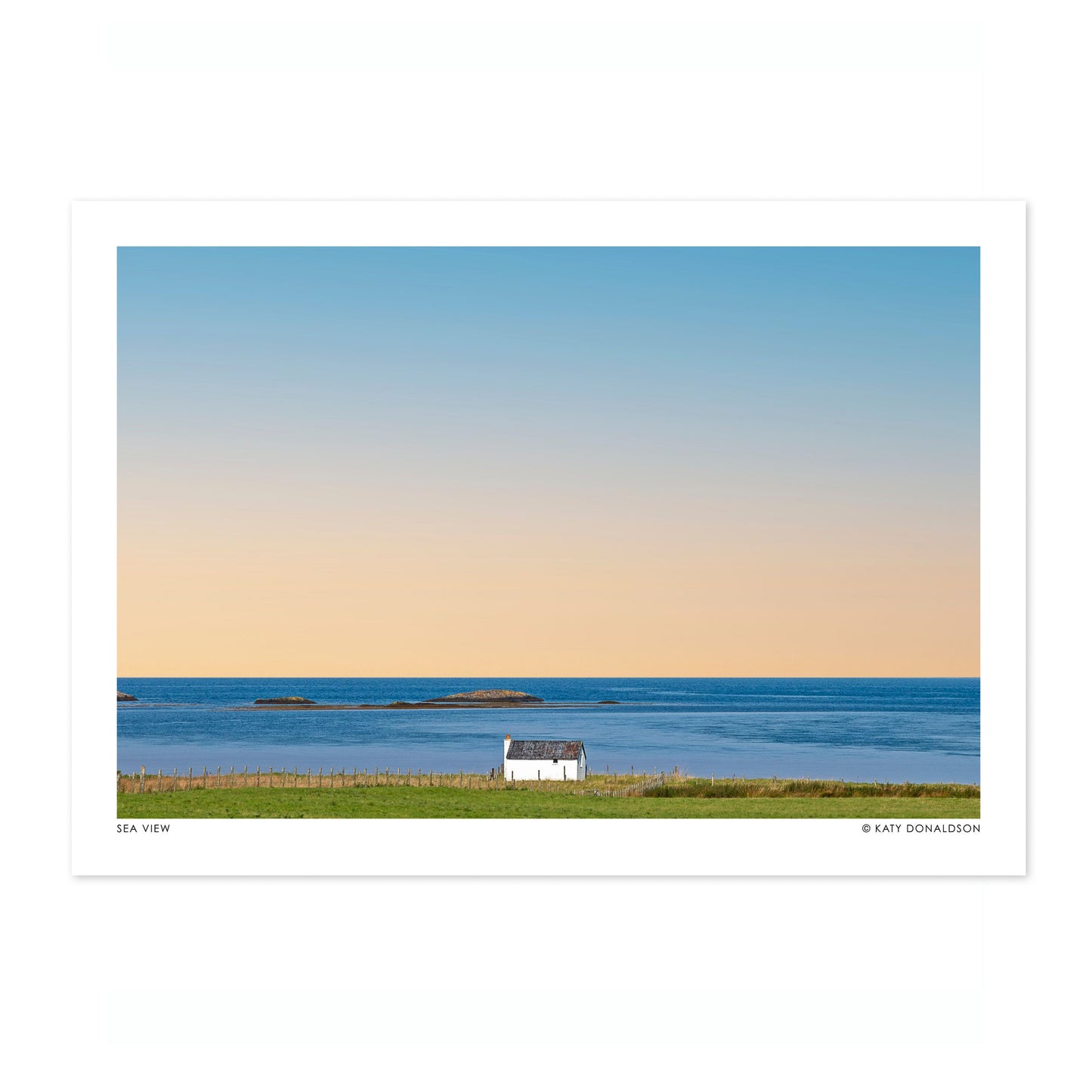 This minimalist landscape poster, "Sea View" by Katy Donaldson, exquisitely captures a tranquil Scottish coast scene. A solitary white cottage stands against a vast expanse of lush grass and serene ocean, set beneath a gradient sky that transitions from blue to warm peach. Ideal for art enthusiasts drawn to photographic and travel themes, this piece epitomizes natural beauty and solitude.