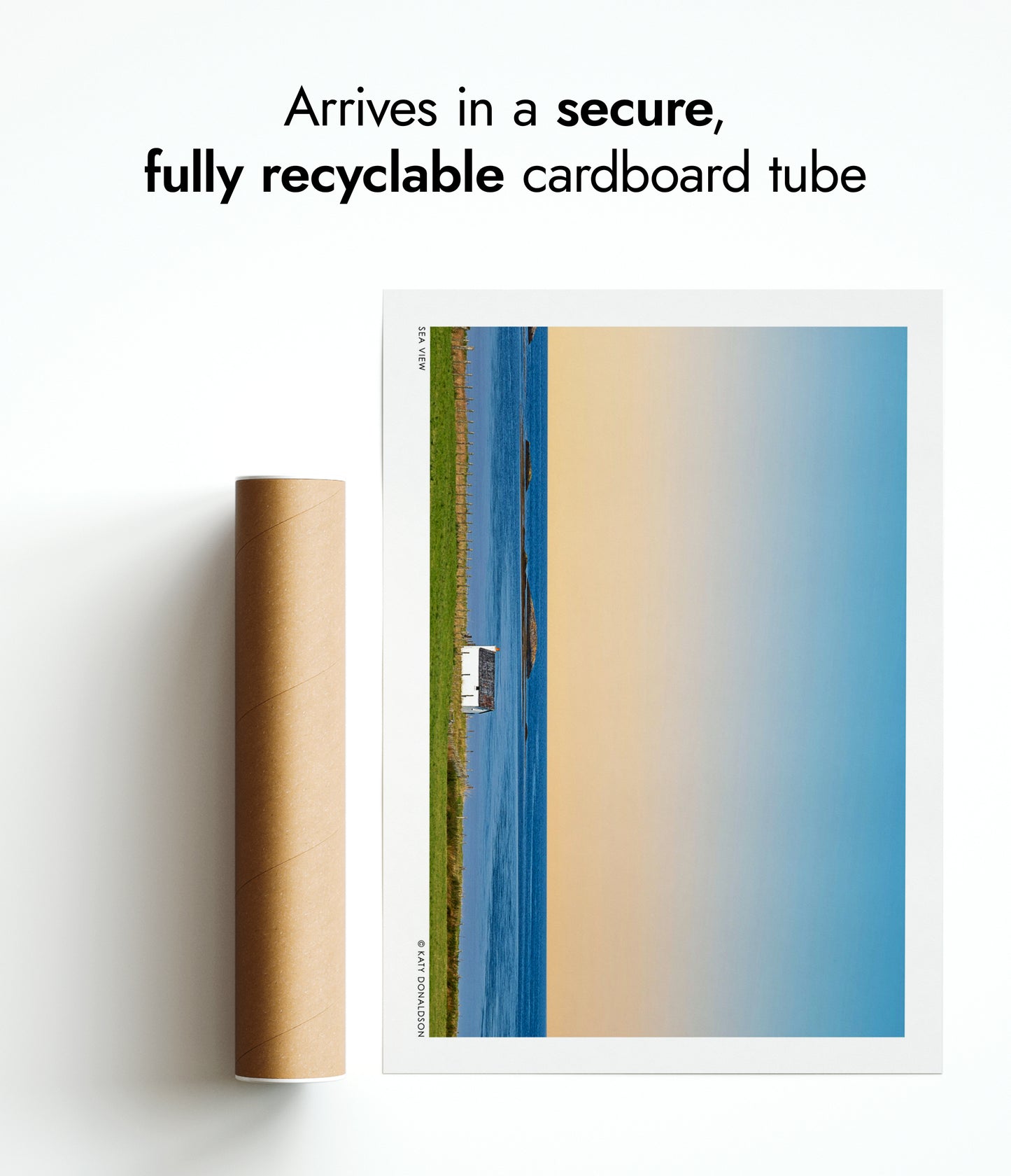 All orders are securely packed in recyclable, eco-friendly solutions. Frames are protected with sustainable bubble wrap alternatives inside thick boxes. Print only orders are shipped in heavy-duty cardboard tubes or protective hard-backed envelopes.