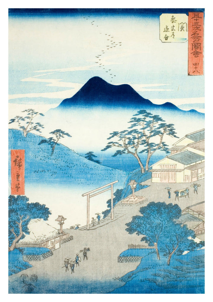 This Japanese woodblock poster titled "Seki Junction of the Pilgrim's Road to Ise Shrine" by Utagawa Hiroshige captures a serene village scene. The illustration features a mountain towering above a misty valley, traditional structures, and a torii gate, with paths leading through the tranquil landscape. Perfect for fans of traditional Ukiyo-e art and Japanese cultural themes.