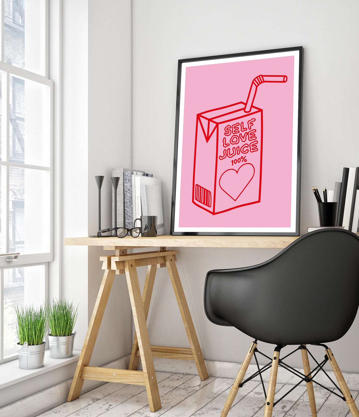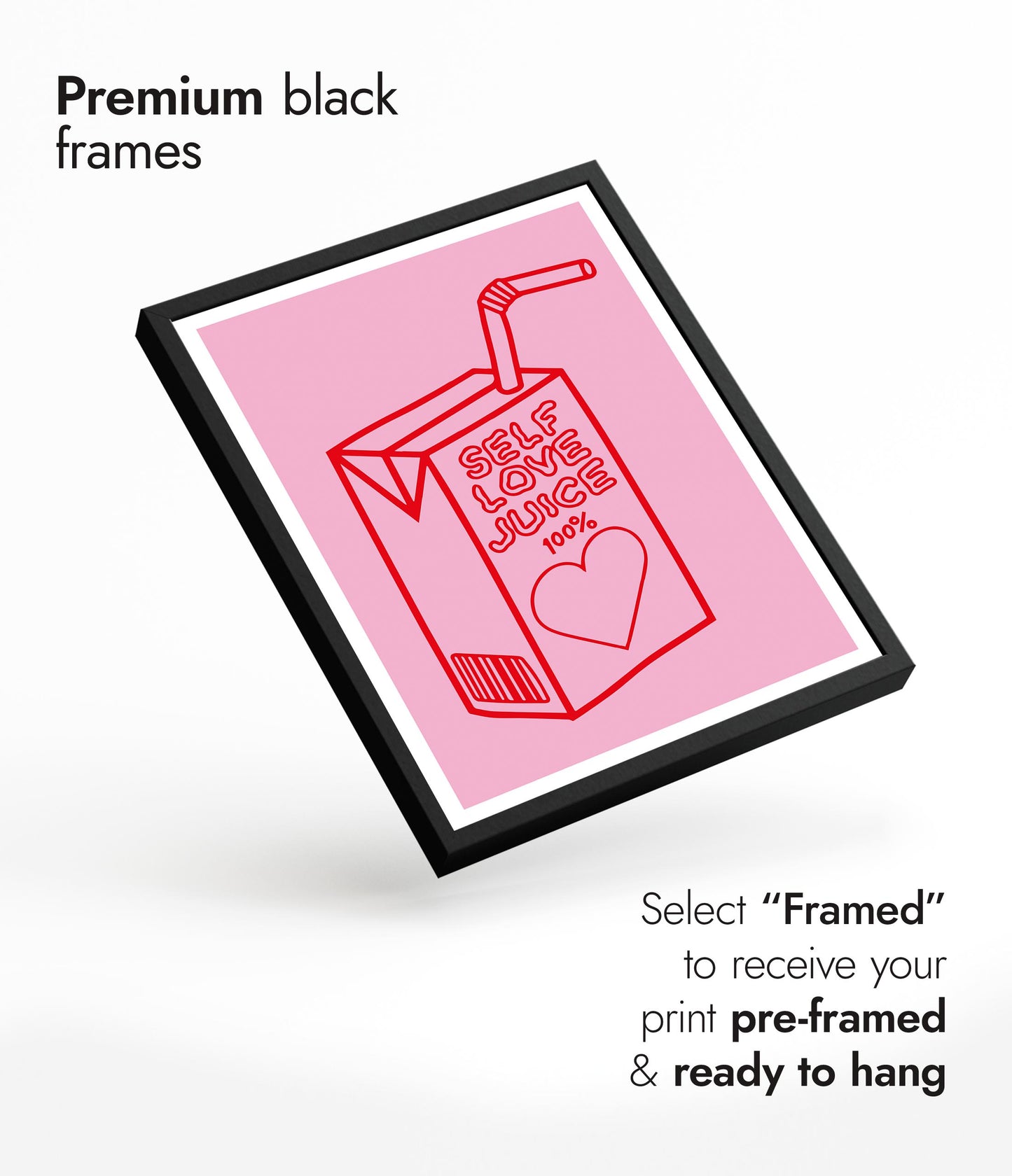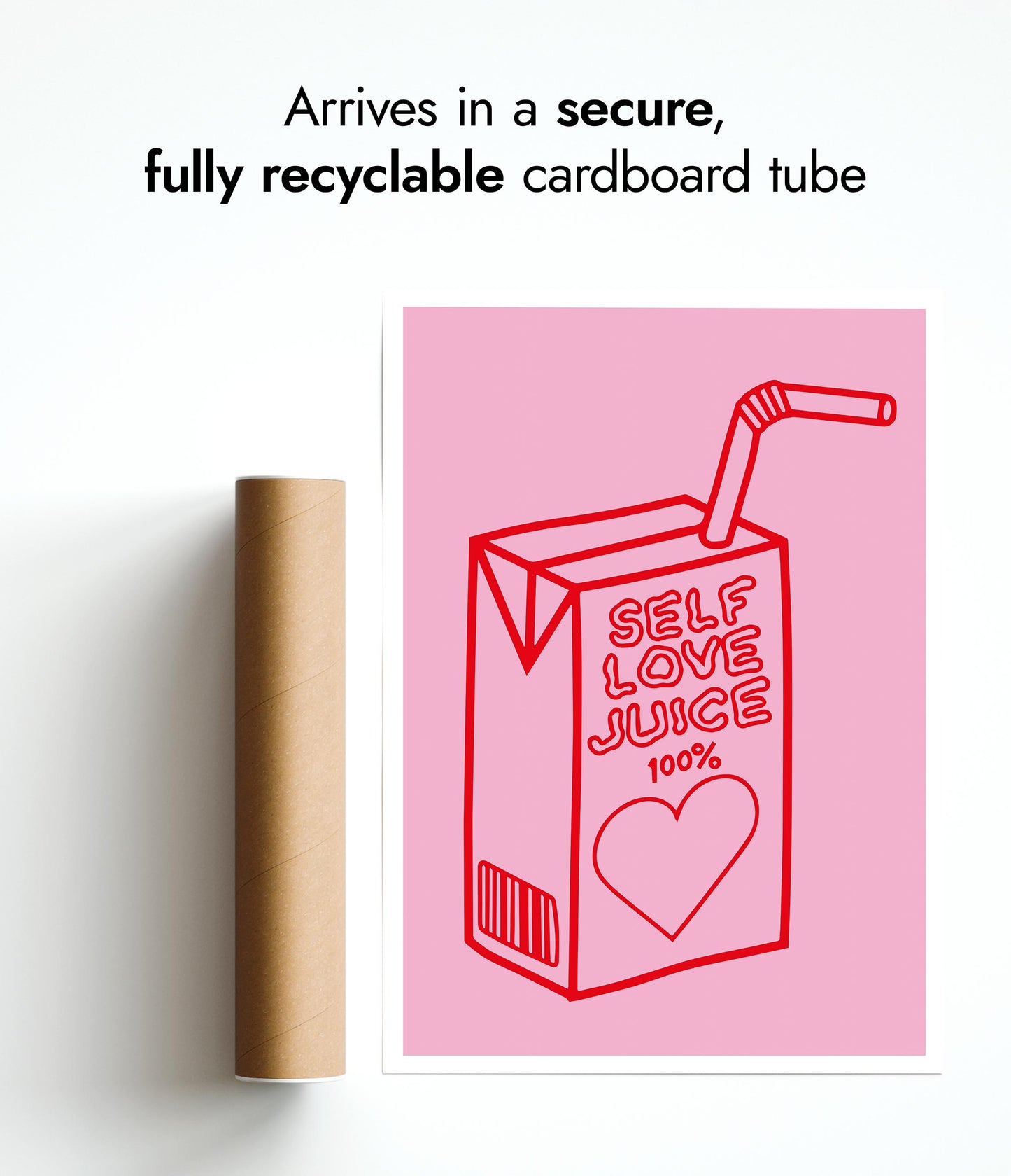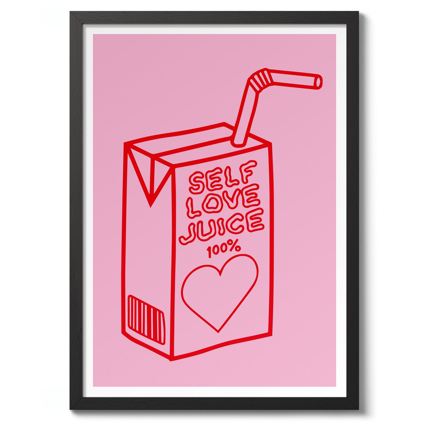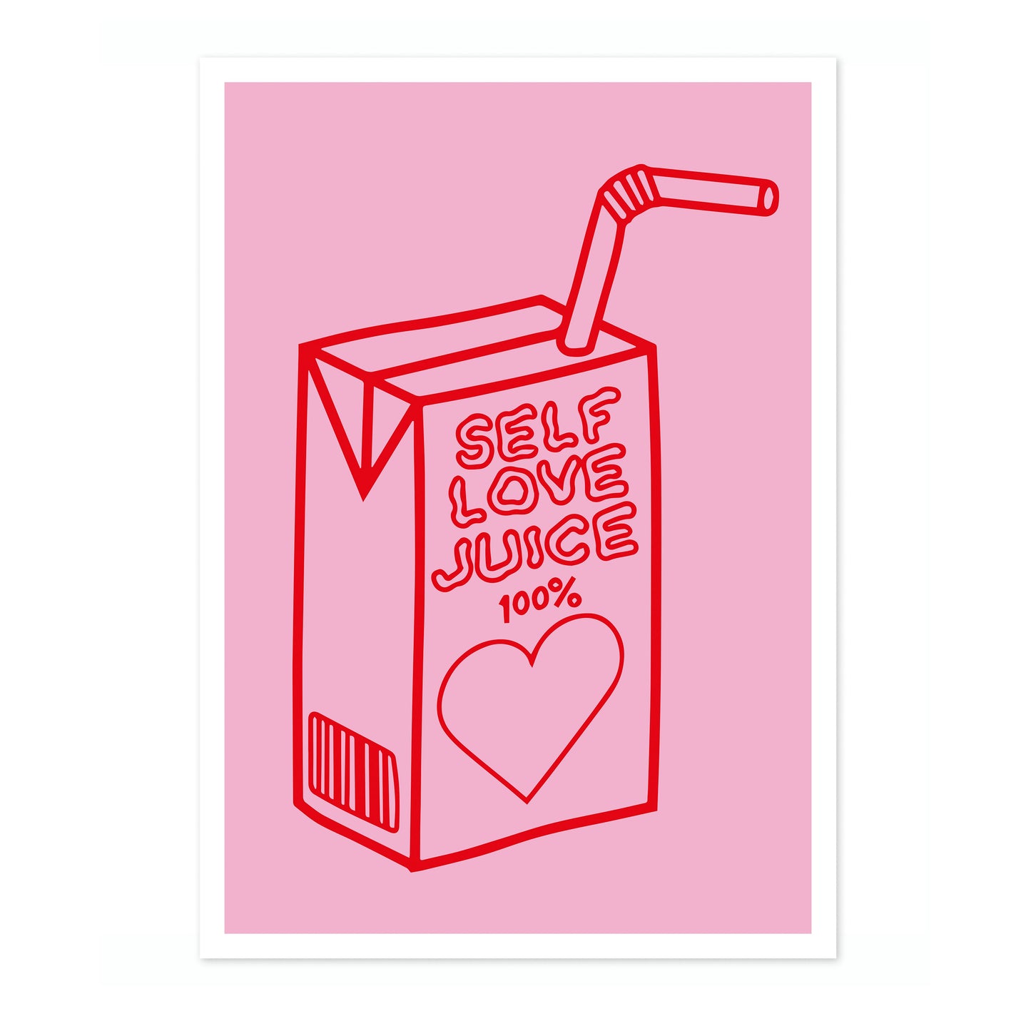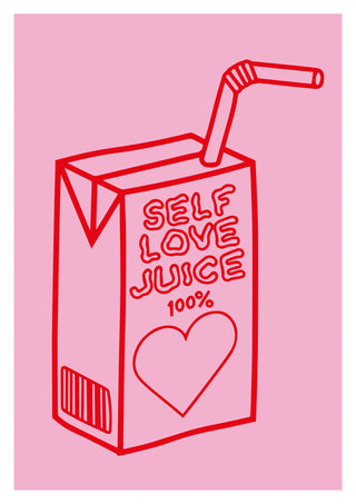 This vibrant poster titled "Self Love Juice" features a whimsical line art illustration of a juice box with the phrase "100% Self Love Juice." Rendered in bold red against a soft pink background, the design incorporates elements of wellness and love with a heart motif. Ideal for adding a playful and empowering touch to any space.