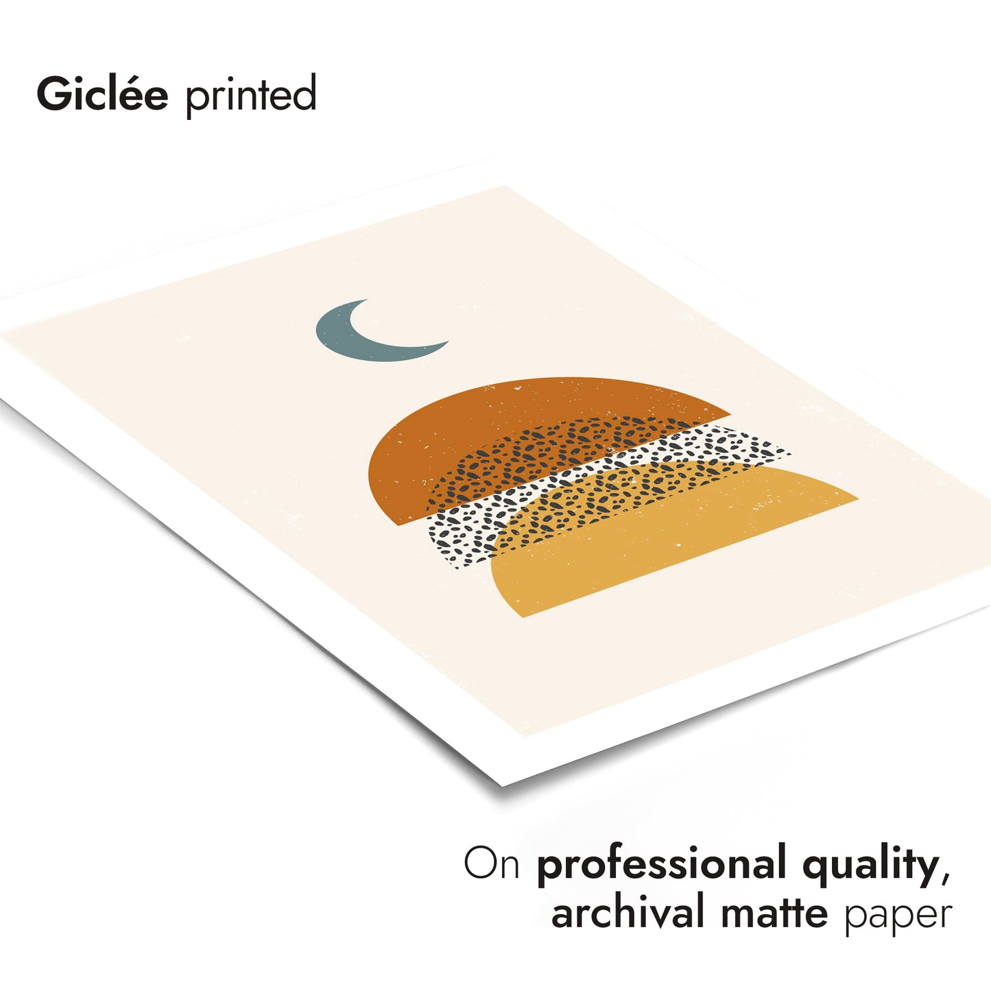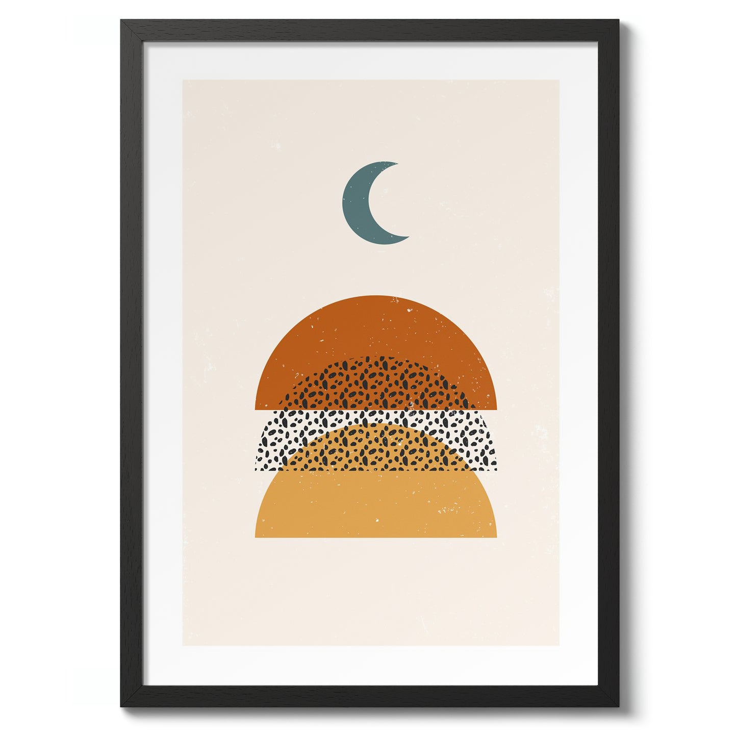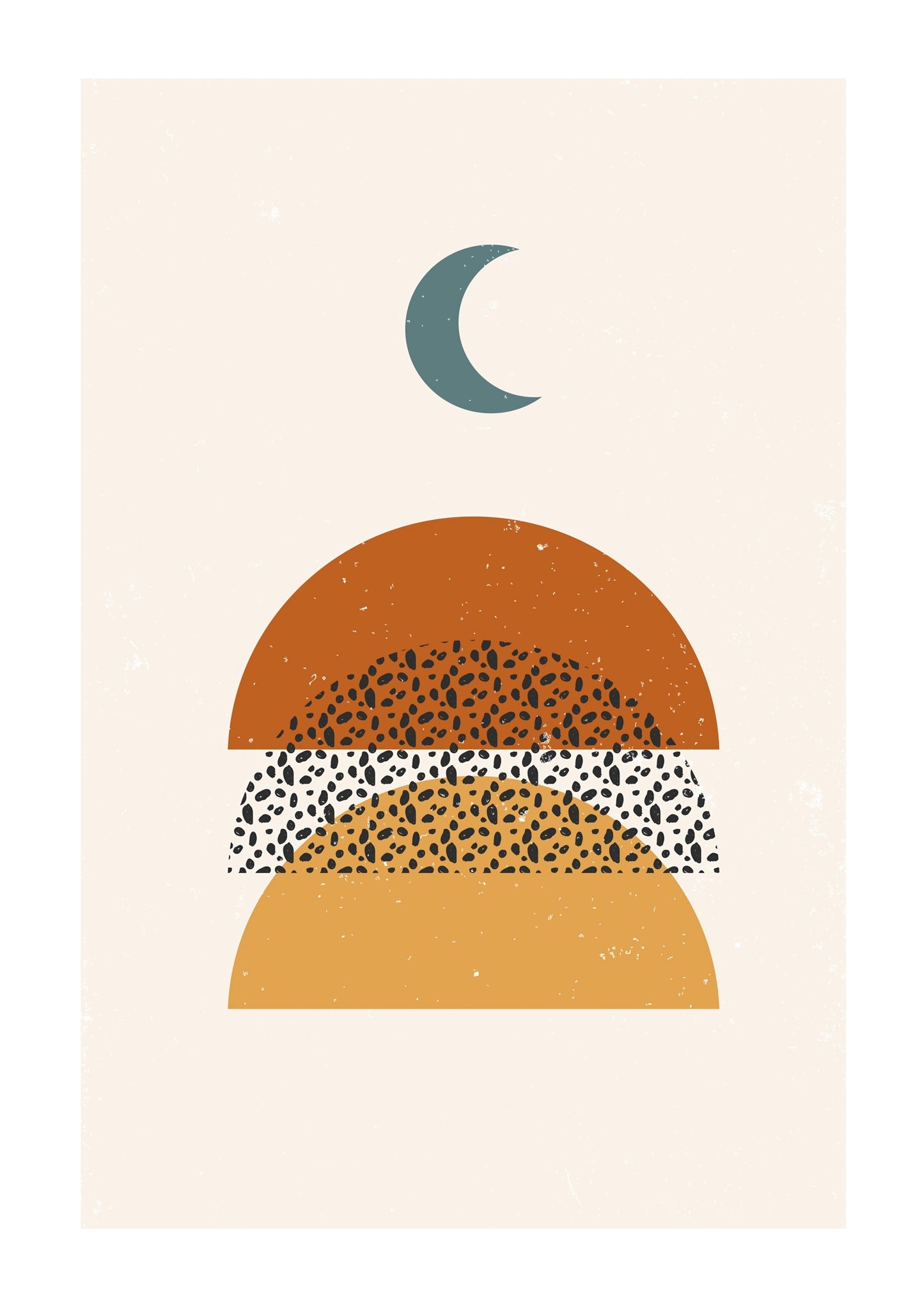 This minimalist poster features a striking abstract design with semi-circles in warm beige and orange hues, adorned with a distinctive speckled pattern. A serene moon shape hovers above, enhancing its modern aesthetic. Ideal for contemporary interiors, this graphic art piece embodies a bohemian feel, marrying geometric forms and subtle earthy tones in perfect harmony.