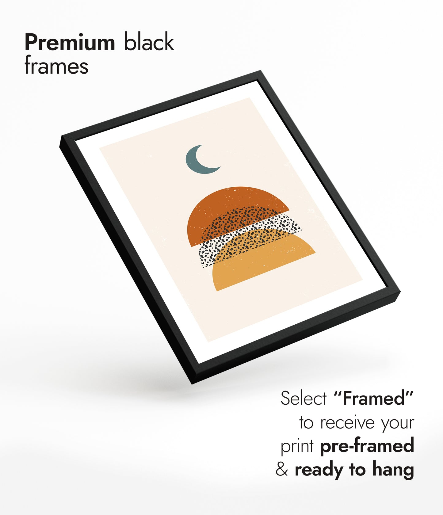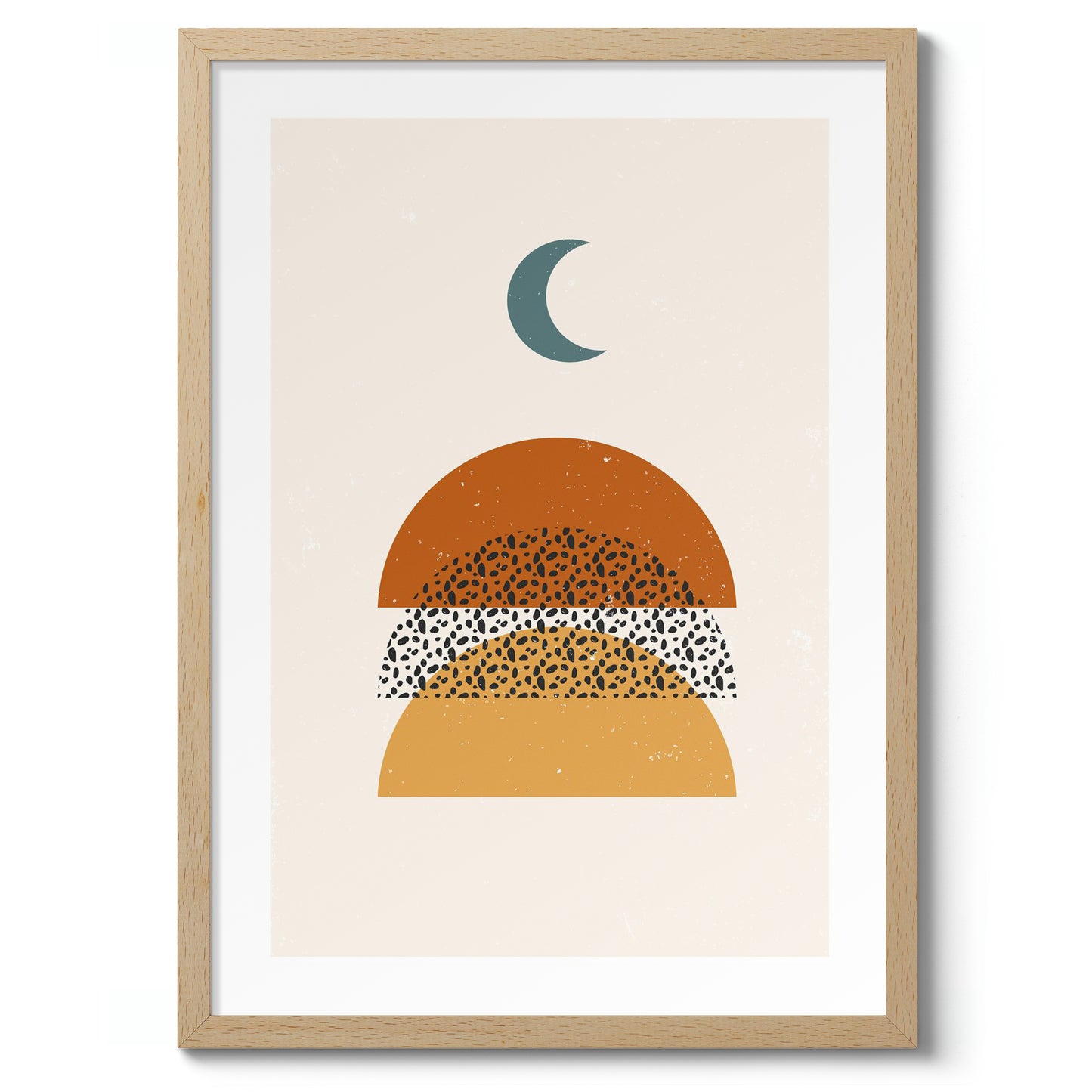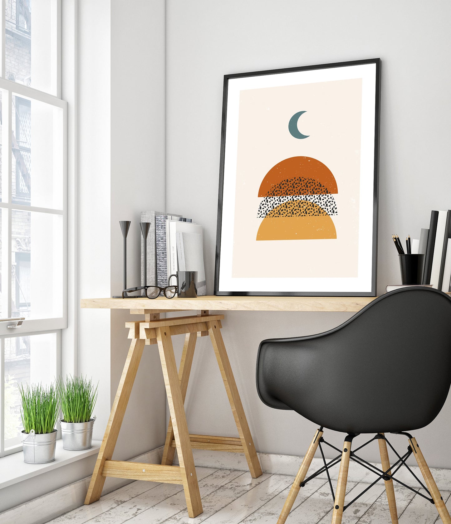 This minimalist poster features a striking abstract design with semi-circles in warm beige and orange hues, adorned with a distinctive speckled pattern. A serene moon shape hovers above, enhancing its modern aesthetic. Ideal for contemporary interiors, this graphic art piece embodies a bohemian feel, marrying geometric forms and subtle earthy tones in perfect harmony.