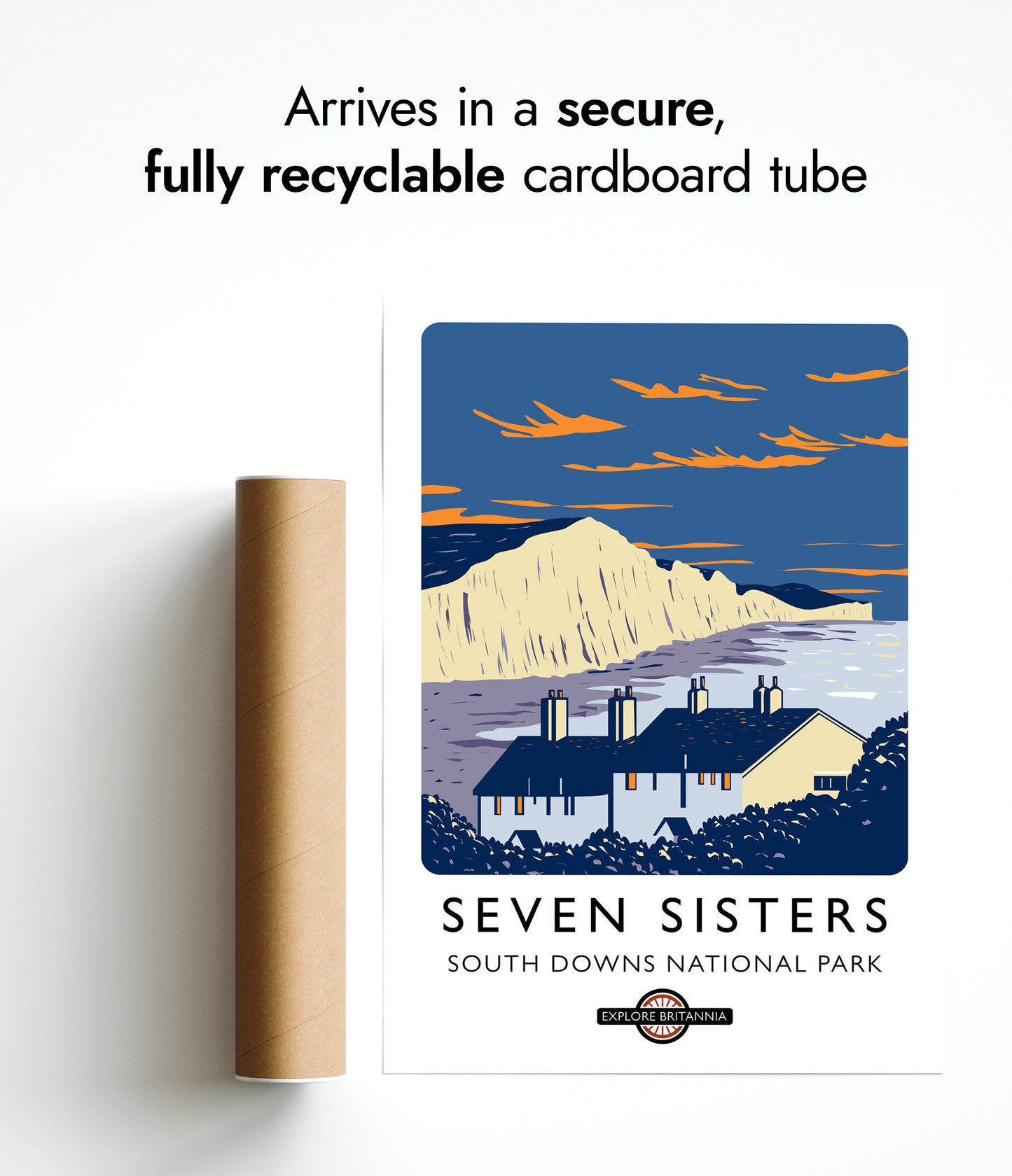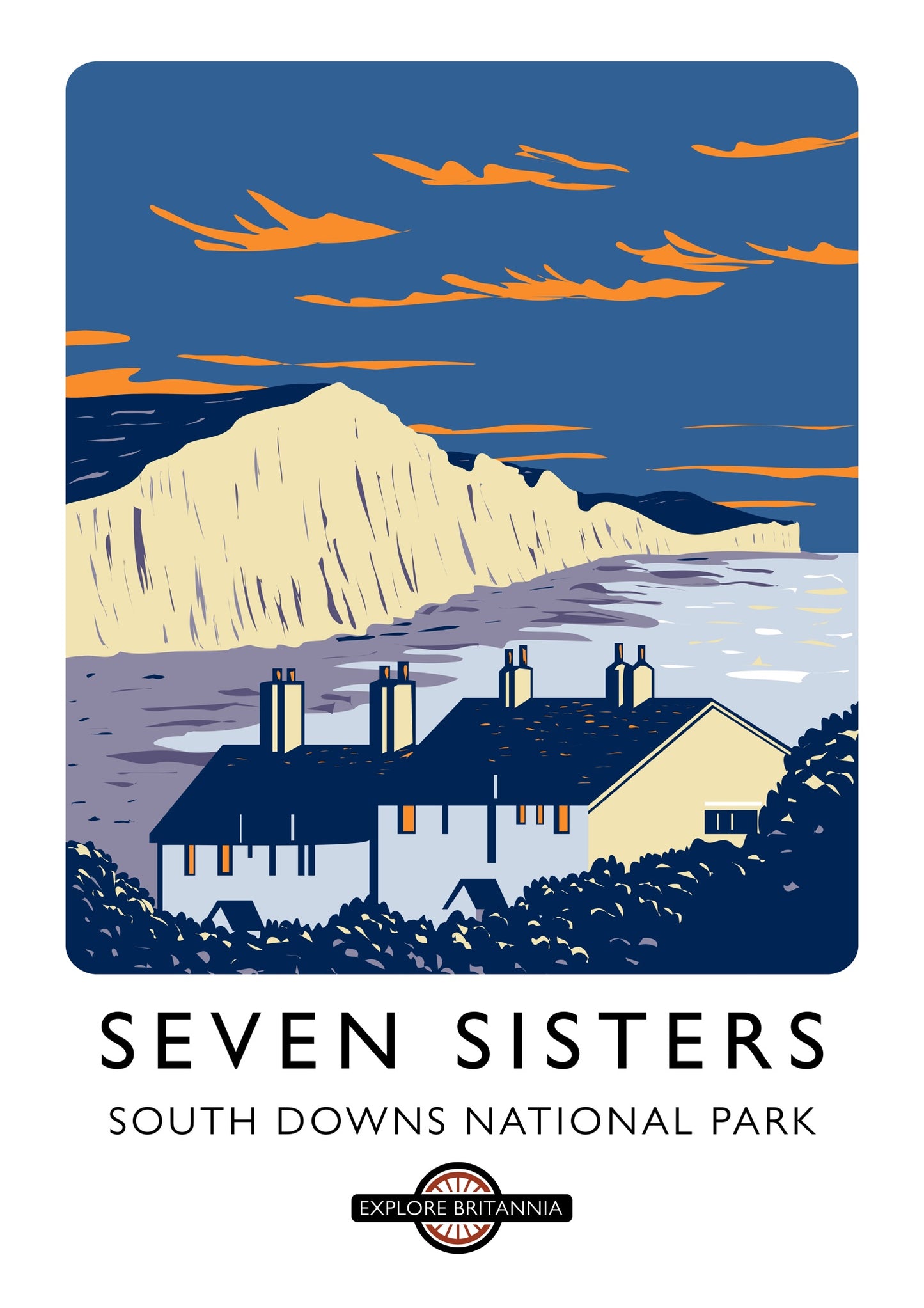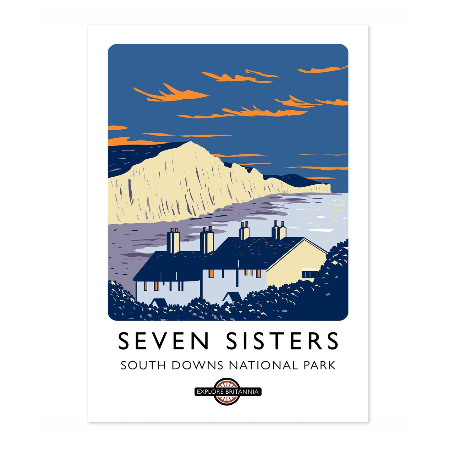 This illustrated poster of the Seven Sisters captures the iconic chalk cliffs of South Downs National Park. Featuring bold graphic elements and rich hues of blue and white, it depicts a serene coastal scene with quaint countryside houses nestled against the backdrop of the dramatic cliffs. Perfect for those seeking a travel-inspired artwork celebrating England's natural beauty.