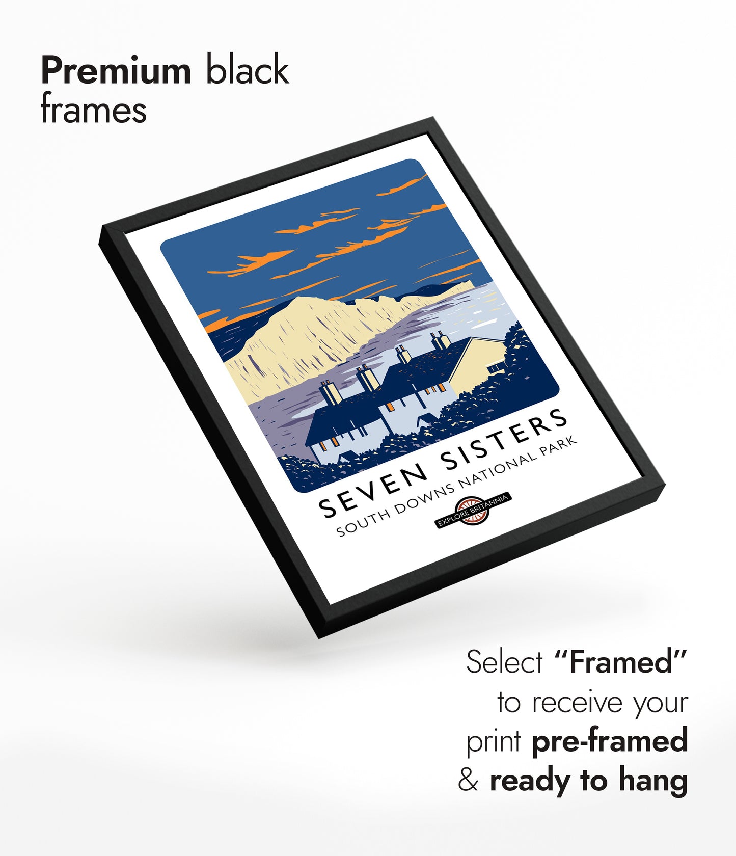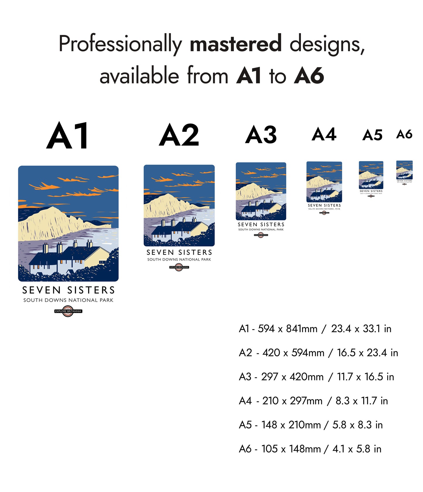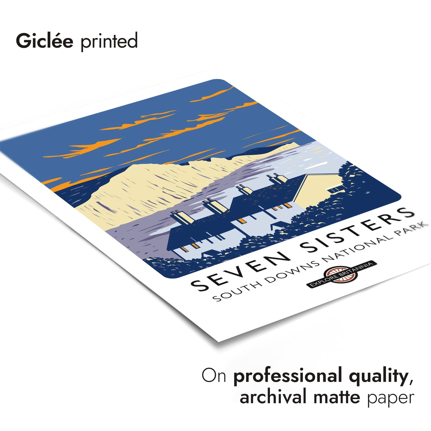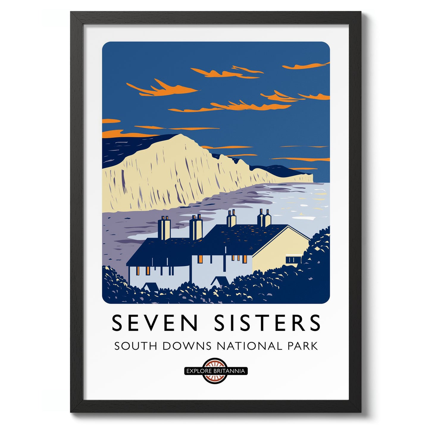 This illustrated poster of the Seven Sisters captures the iconic chalk cliffs of South Downs National Park. Featuring bold graphic elements and rich hues of blue and white, it depicts a serene coastal scene with quaint countryside houses nestled against the backdrop of the dramatic cliffs. Perfect for those seeking a travel-inspired artwork celebrating England's natural beauty.