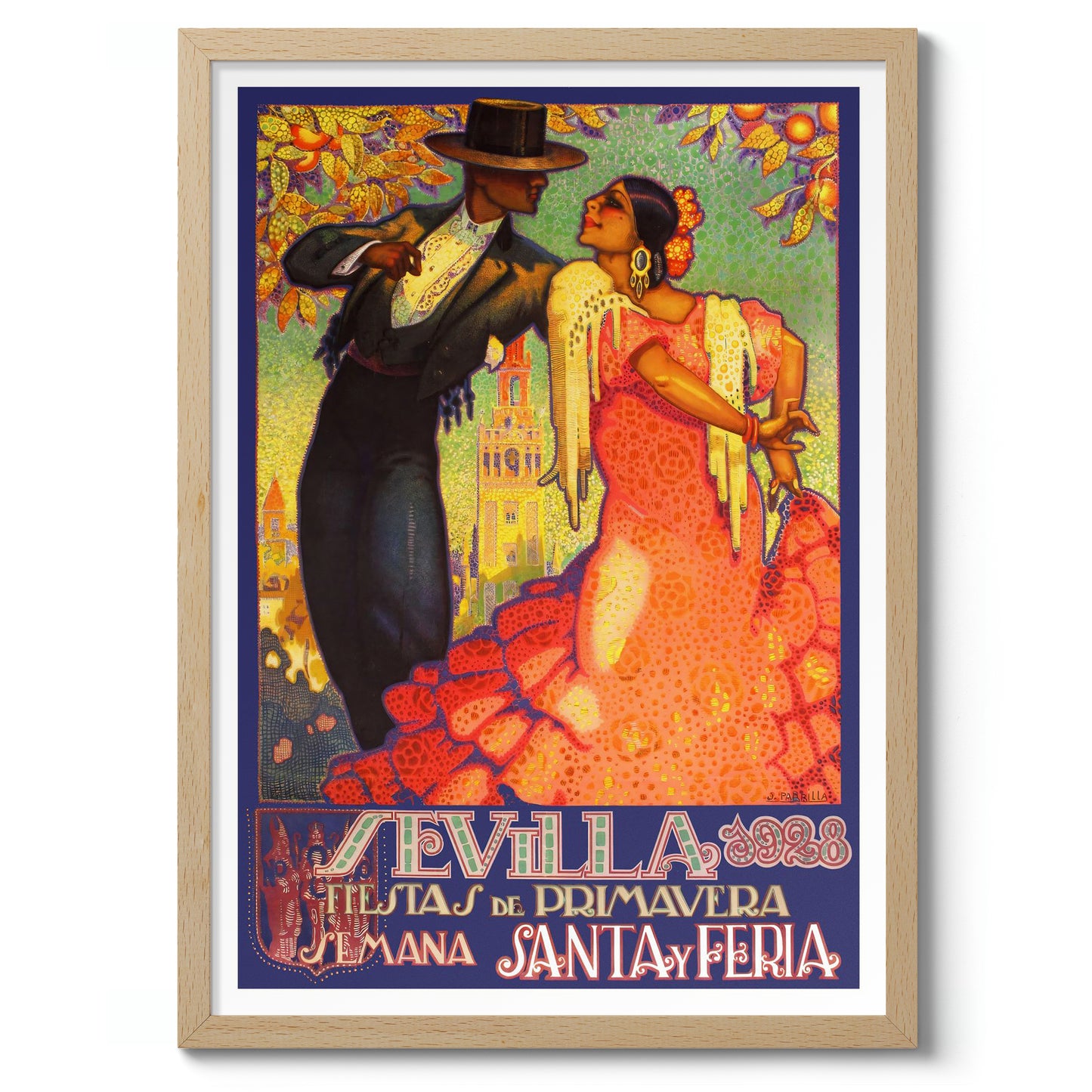 Capture the vibrant energy of Seville’s 1928 spring celebrations with this vintage travel poster. Featuring a flamenco dancer in a striking orange dress and a dashing partner, set against a picturesque backdrop of Seville. Rich hues of orange and purple highlight the Mediterranean charm, evoking the spirit of Spanish culture and tradition. Ideal for lovers of dance and travel-themed art.