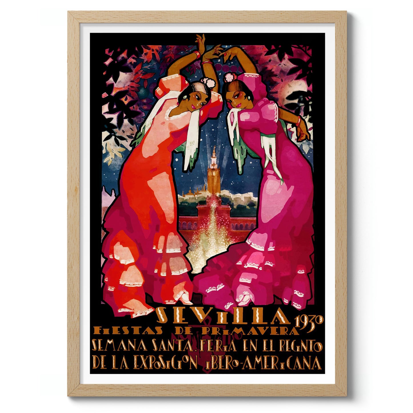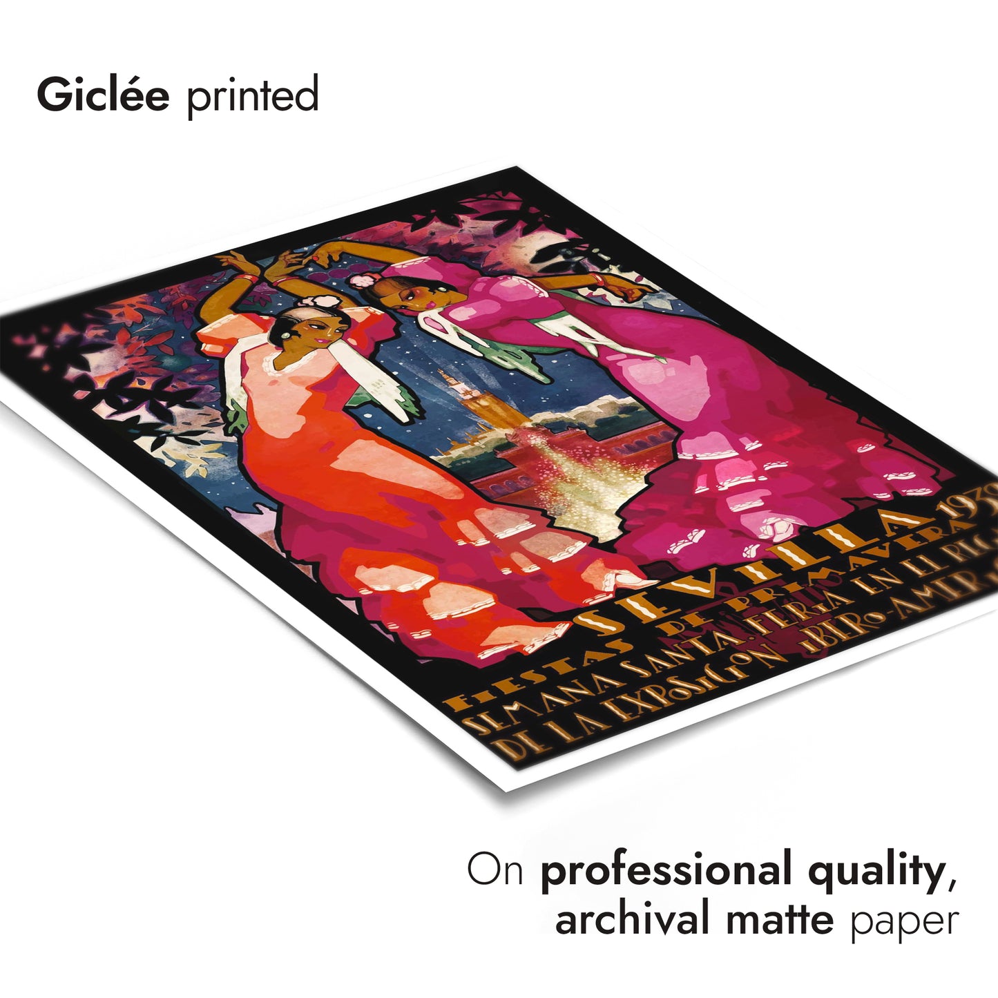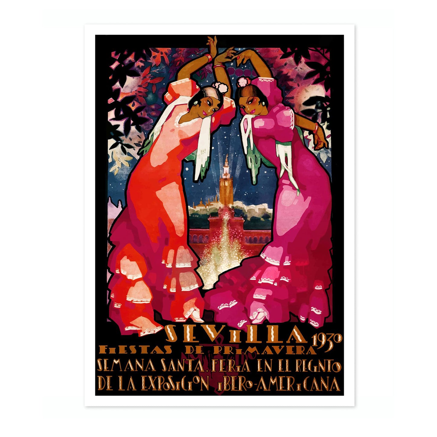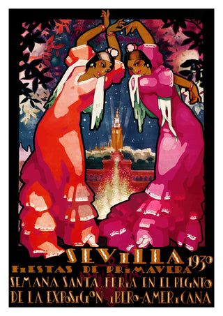 This vibrant vintage-style Seville poster from 1930 captures the dynamic energy of a Spanish festival. Featuring two women in traditional dresses dancing against the backdrop of Seville's iconic architecture, the illustration uses lively shades of red, purple, and black. Perfect for adding cultural flair and historical charm to any space, this travel-themed poster embodies the spirit of Spanish celebrations.