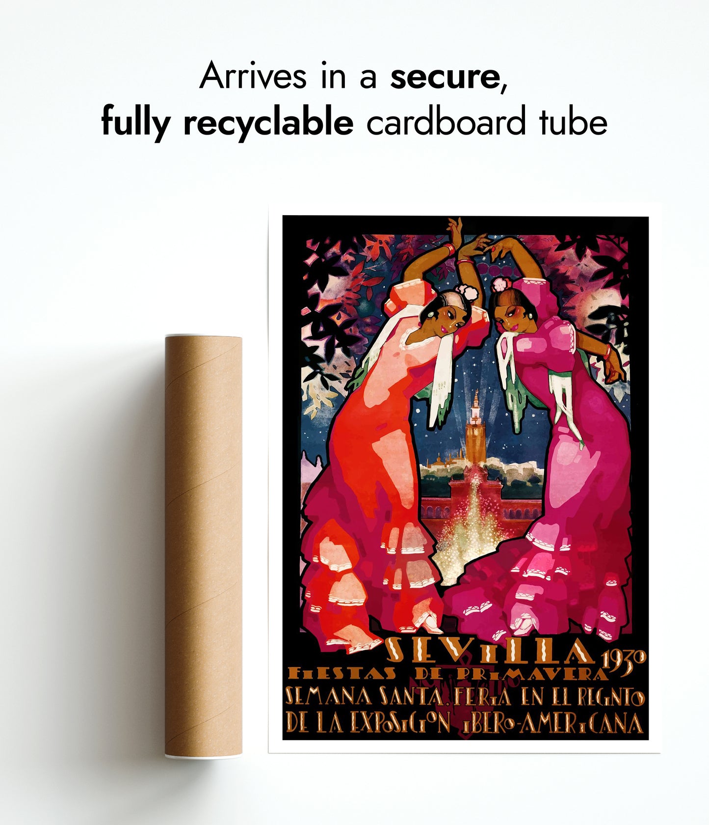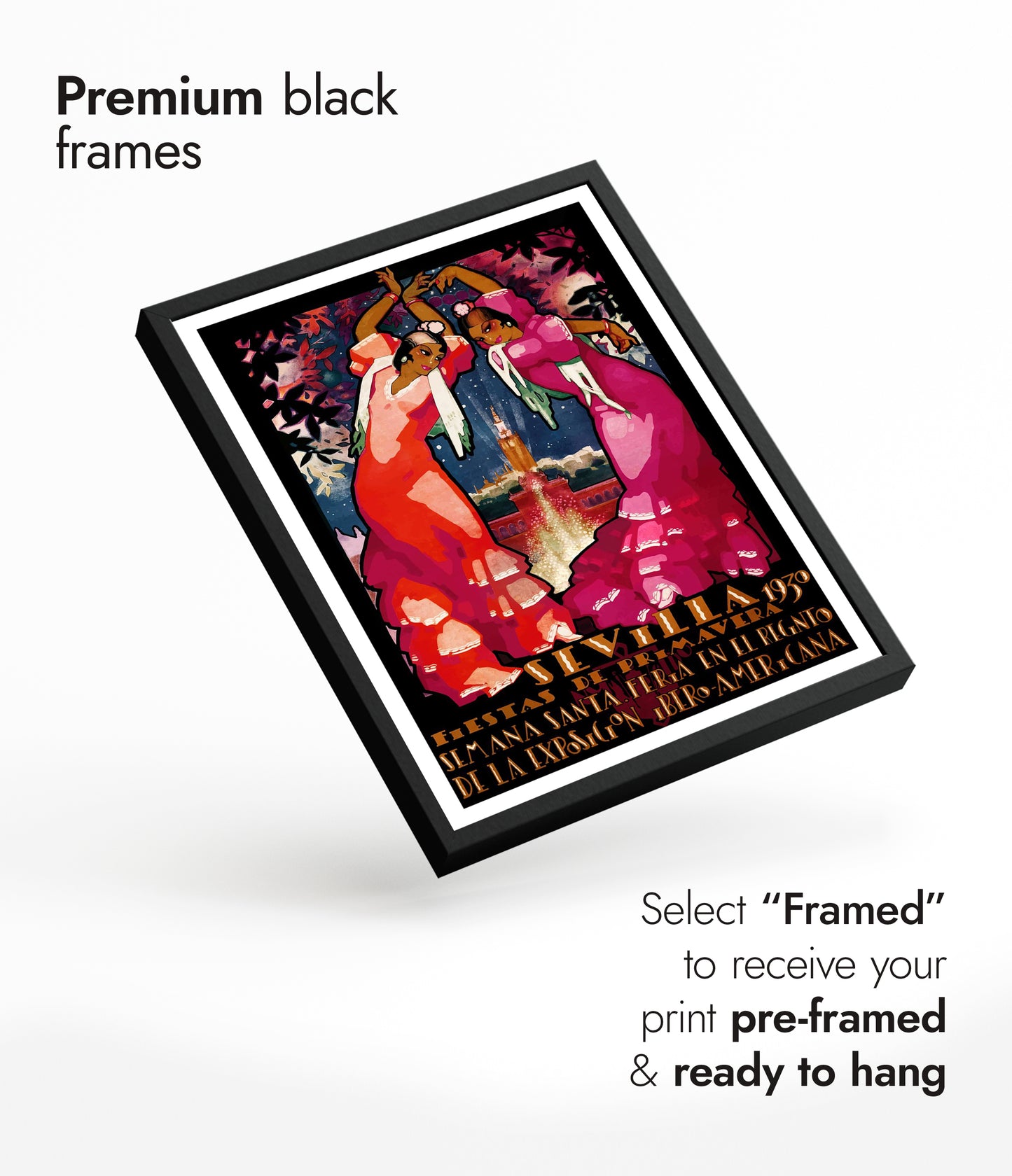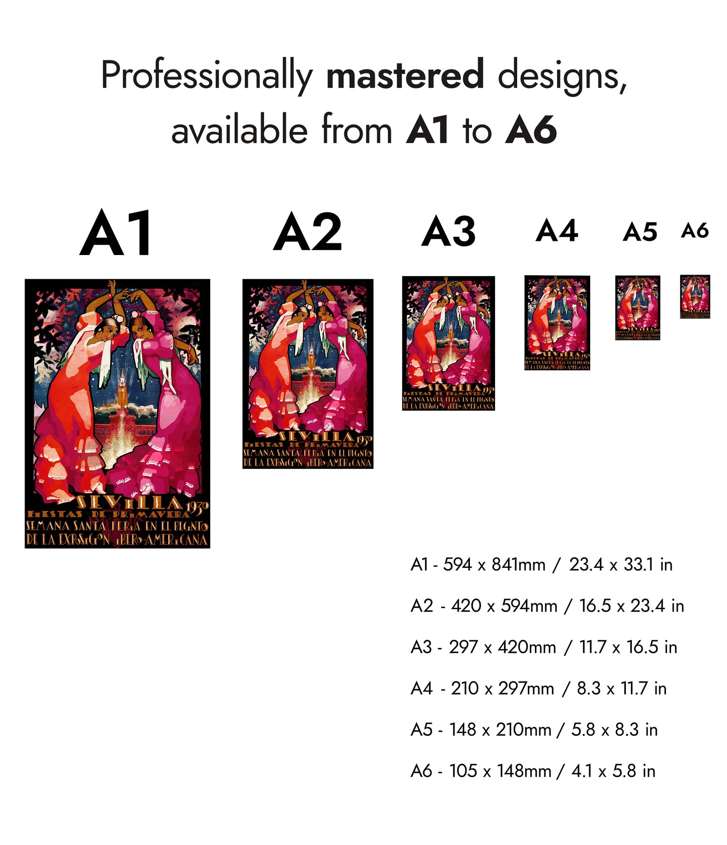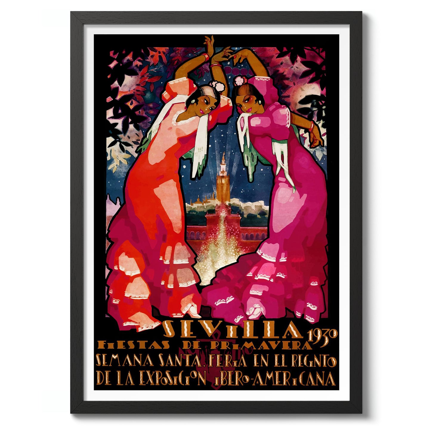 This vibrant vintage-style Seville poster from 1930 captures the dynamic energy of a Spanish festival. Featuring two women in traditional dresses dancing against the backdrop of Seville's iconic architecture, the illustration uses lively shades of red, purple, and black. Perfect for adding cultural flair and historical charm to any space, this travel-themed poster embodies the spirit of Spanish celebrations.