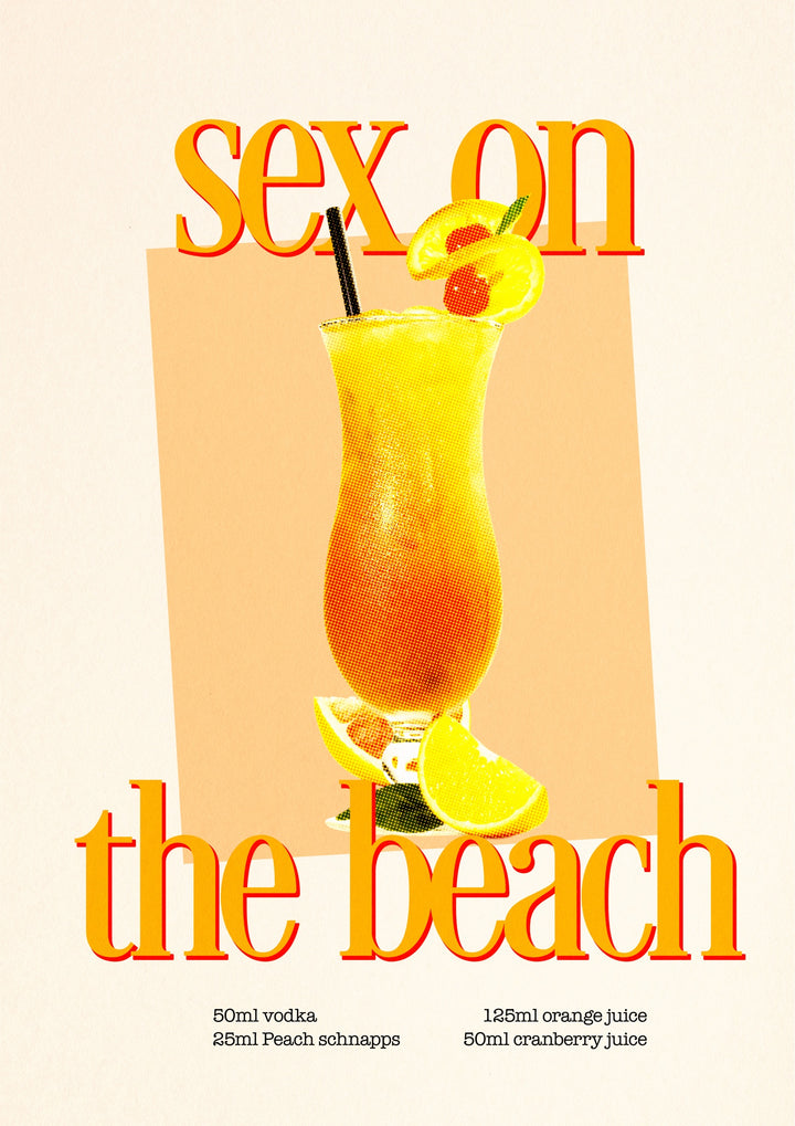 This vibrant poster features a graphical, retro-style portrayal of the classic “Sex on the Beach” cocktail. Dominated by warm tones, the print includes a detailed illustration of the drink garnished with a slice of orange and cherry. The background contrasts elegantly with bold, nostalgic typography and a recipe list at the bottom, encapsulating a lively and refreshing alcohol-themed aesthetic.