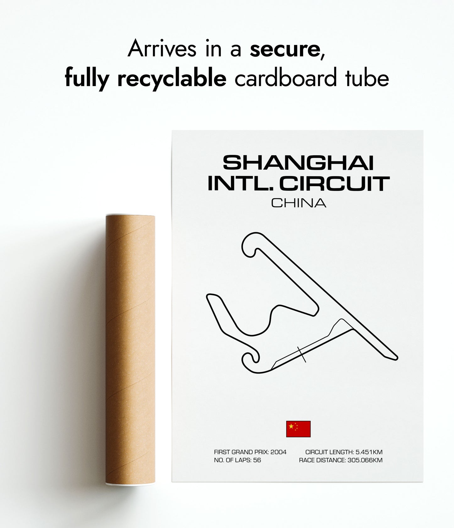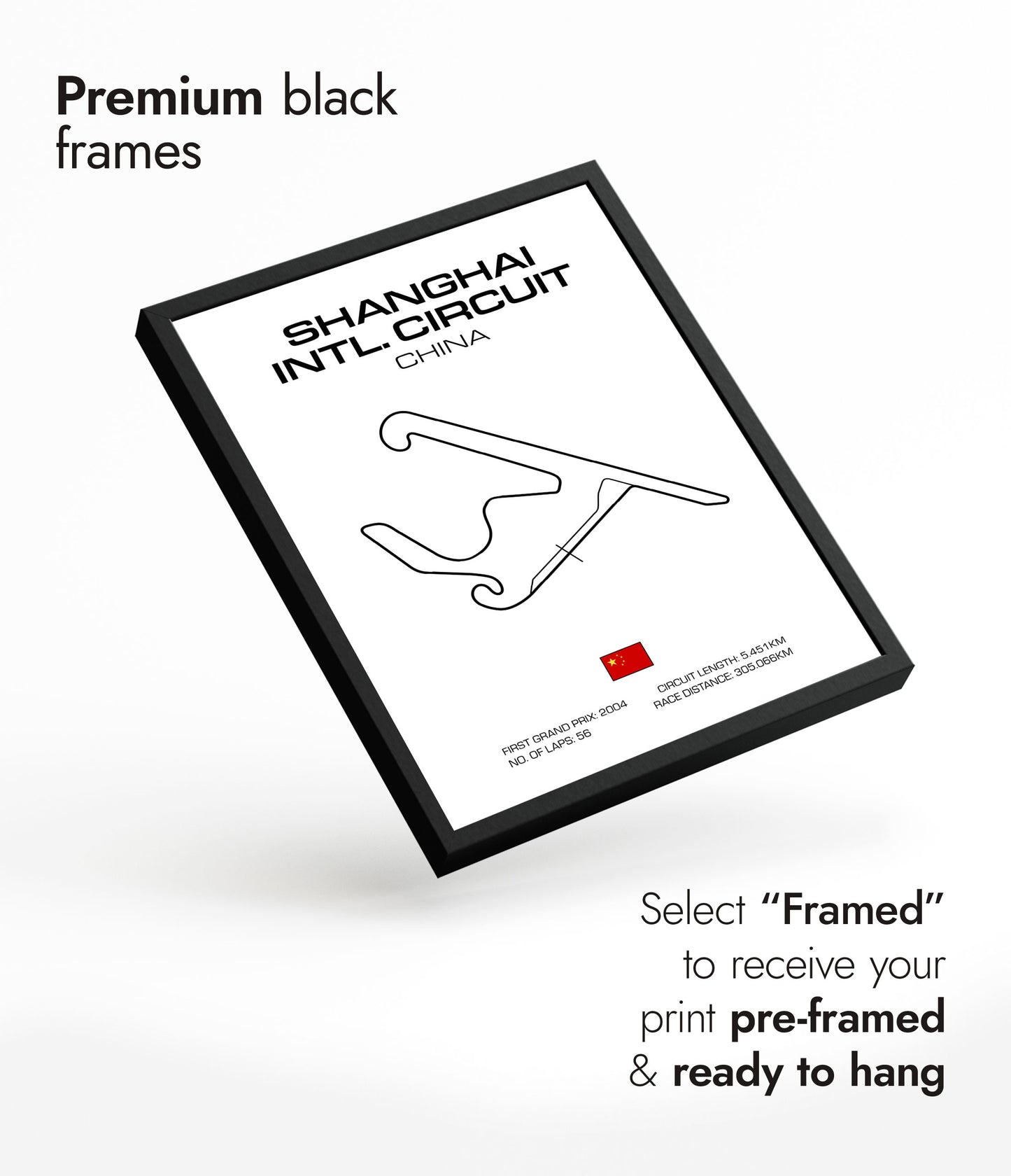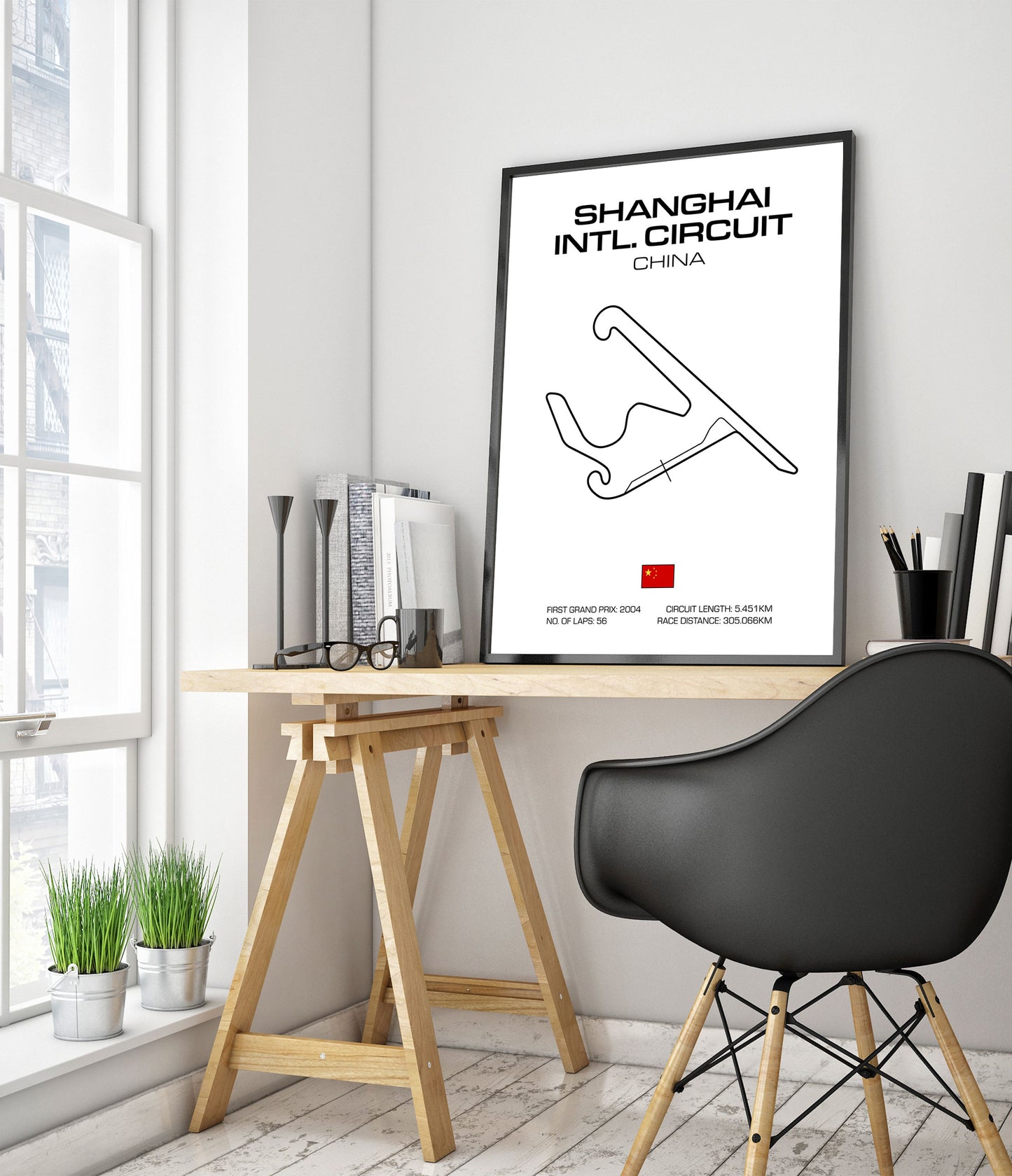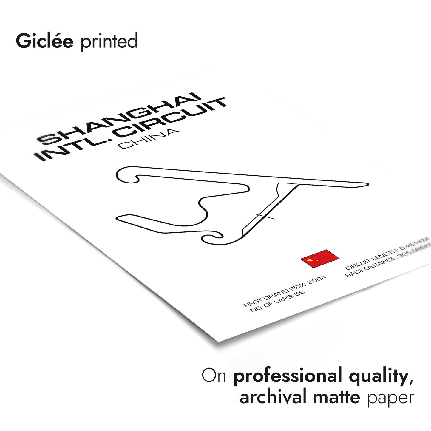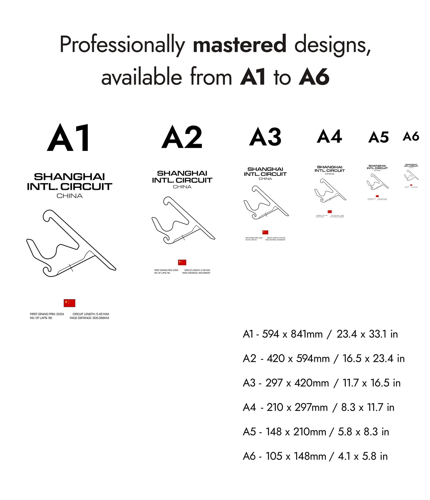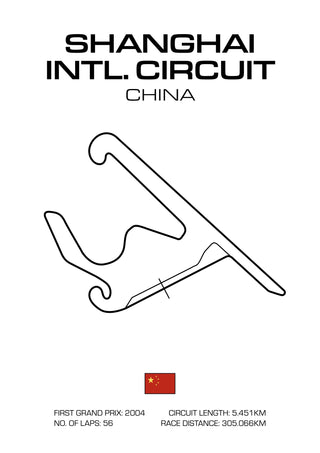 This modern and graphic poster features the sleek line art of the Shanghai International Circuit, home to the thrilling Shanghai Grand Prix in China. Highlighting its distinctive track layout, the illustration is accompanied by essential race details such as circuit length, number of laps, and race distance. A must-have for Formula One and motorsports enthusiasts.