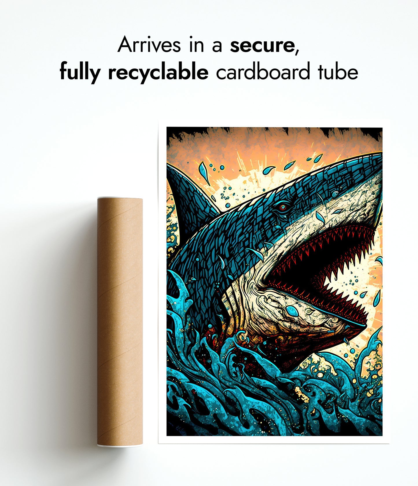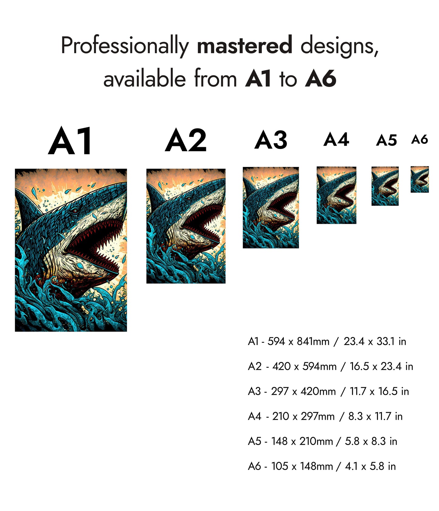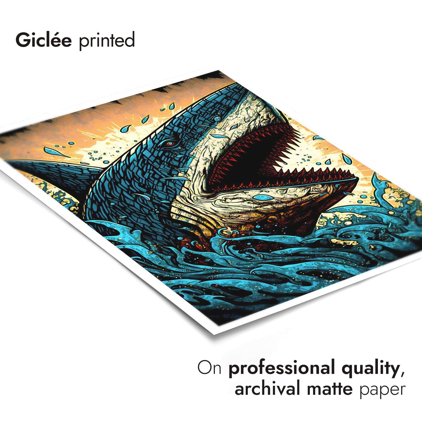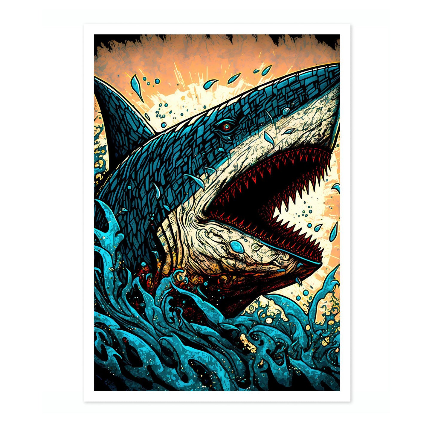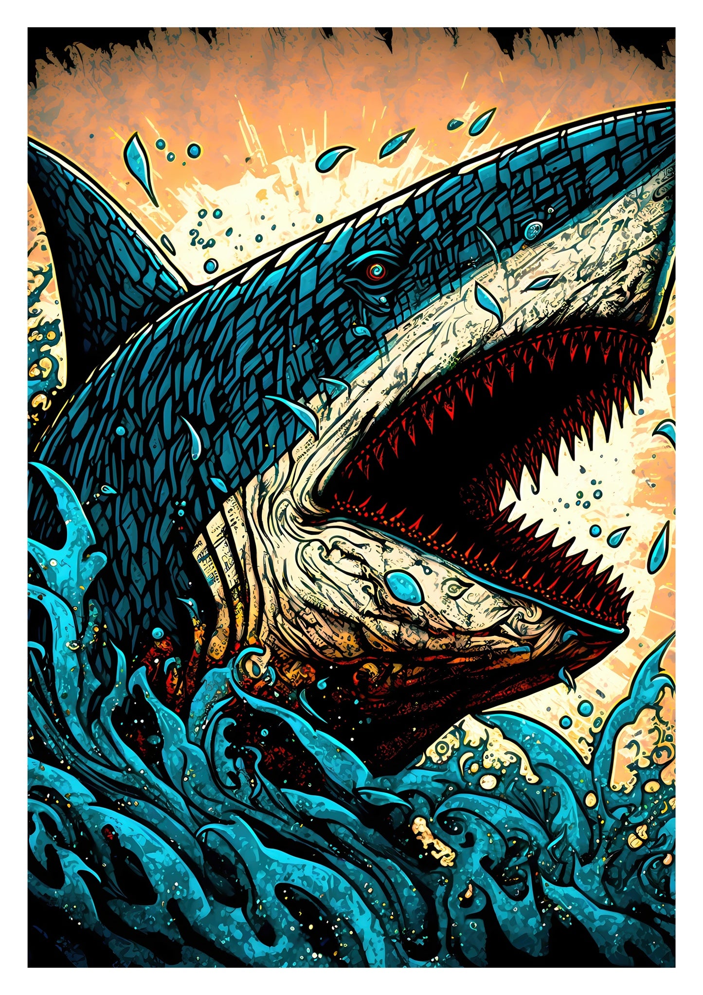 This modern anime-inspired shark poster captures the fierce dynamism of a shark slicing through ocean waves. Rendered in vivid blue and contrasting orange, its open maw and detailed scales exude intensity and movement. Ideal for enthusiasts of oceanic or anime art styles, this illustration portrays a captivating sea monster in action. Perfect for adding bold energy to any space.