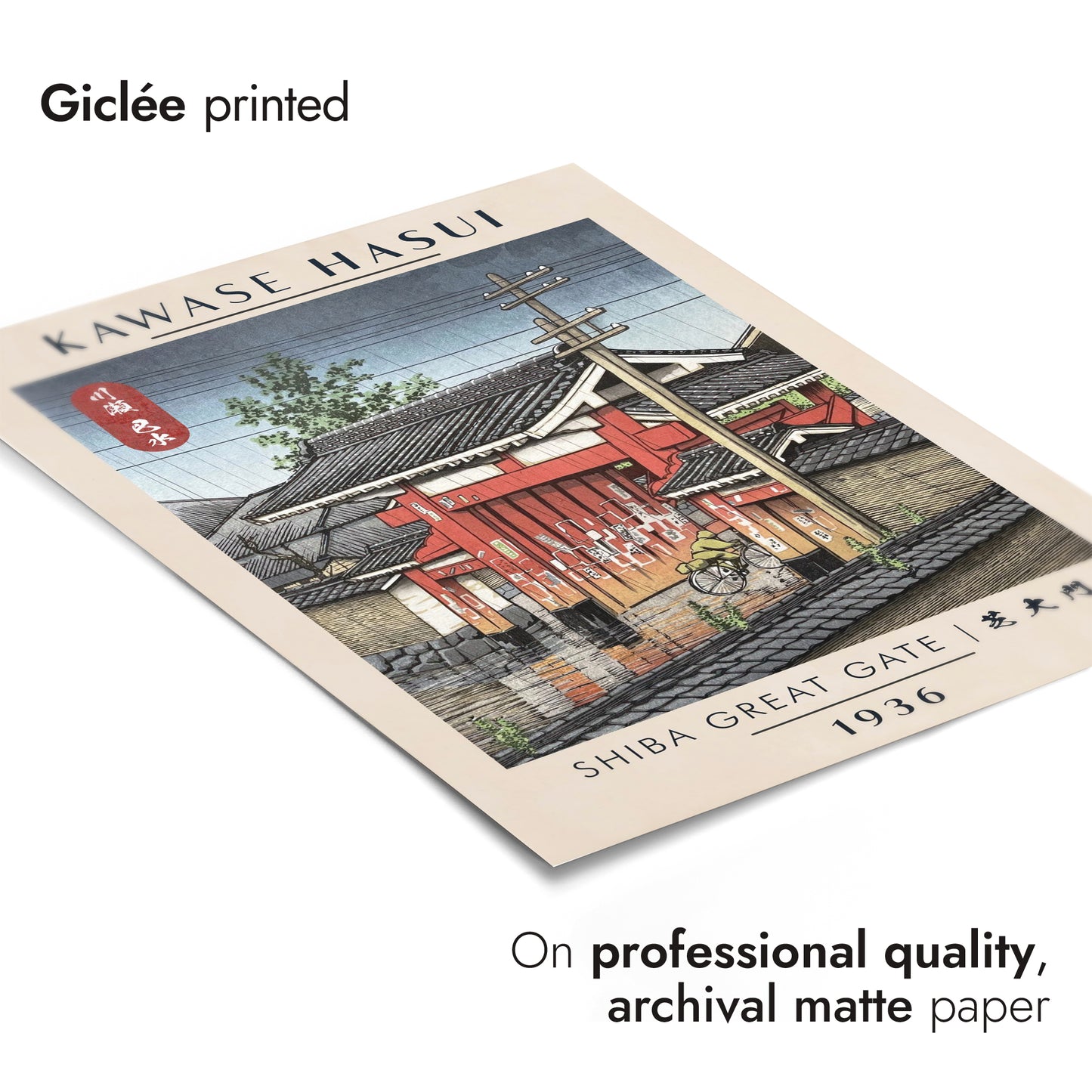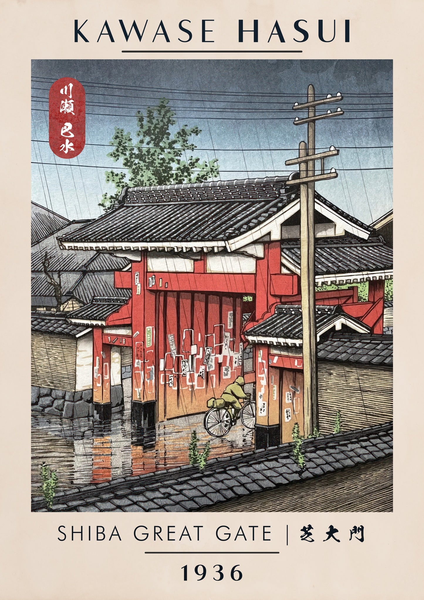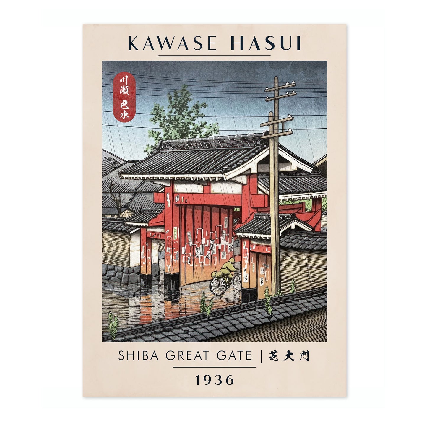 This "Shiba Great Gate" poster by Kawase Hasui, created in 1936, captures the traditional charm of Japanese woodblock artistry. The scene features a striking red gate amidst a serene cityscape, accentuated by gentle rainfall and a lone bicycle. The composition is balanced by lush trees and muted beige tones, embodying the Ukiyo-e style's beauty and tranquility.