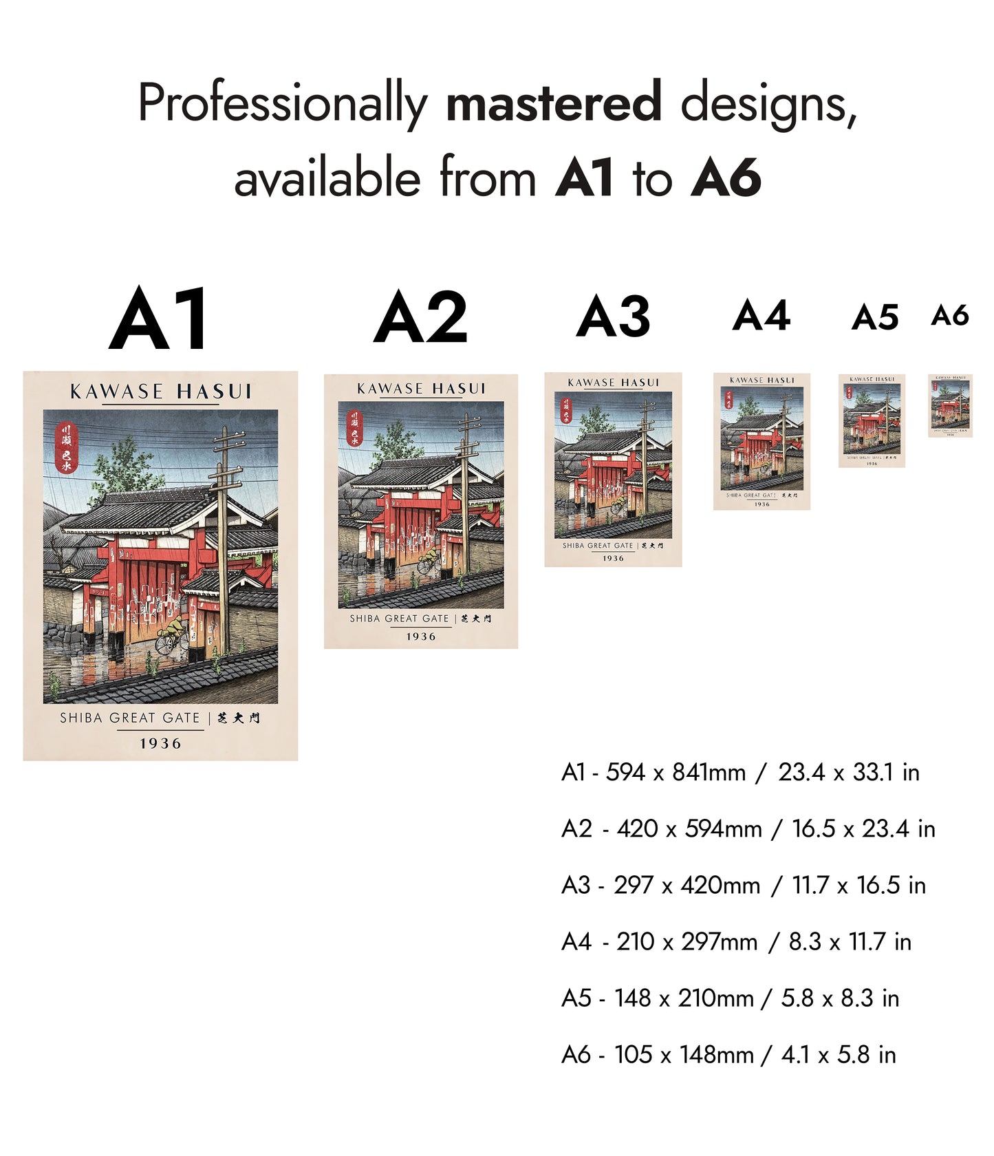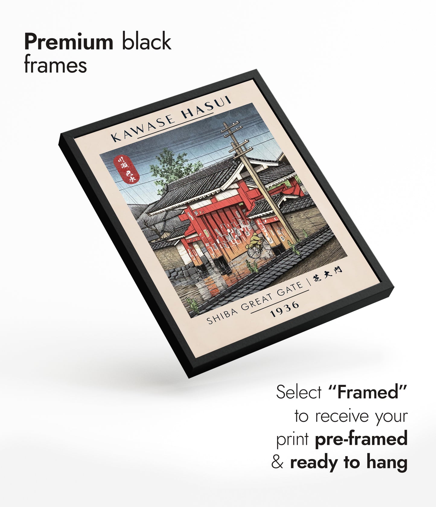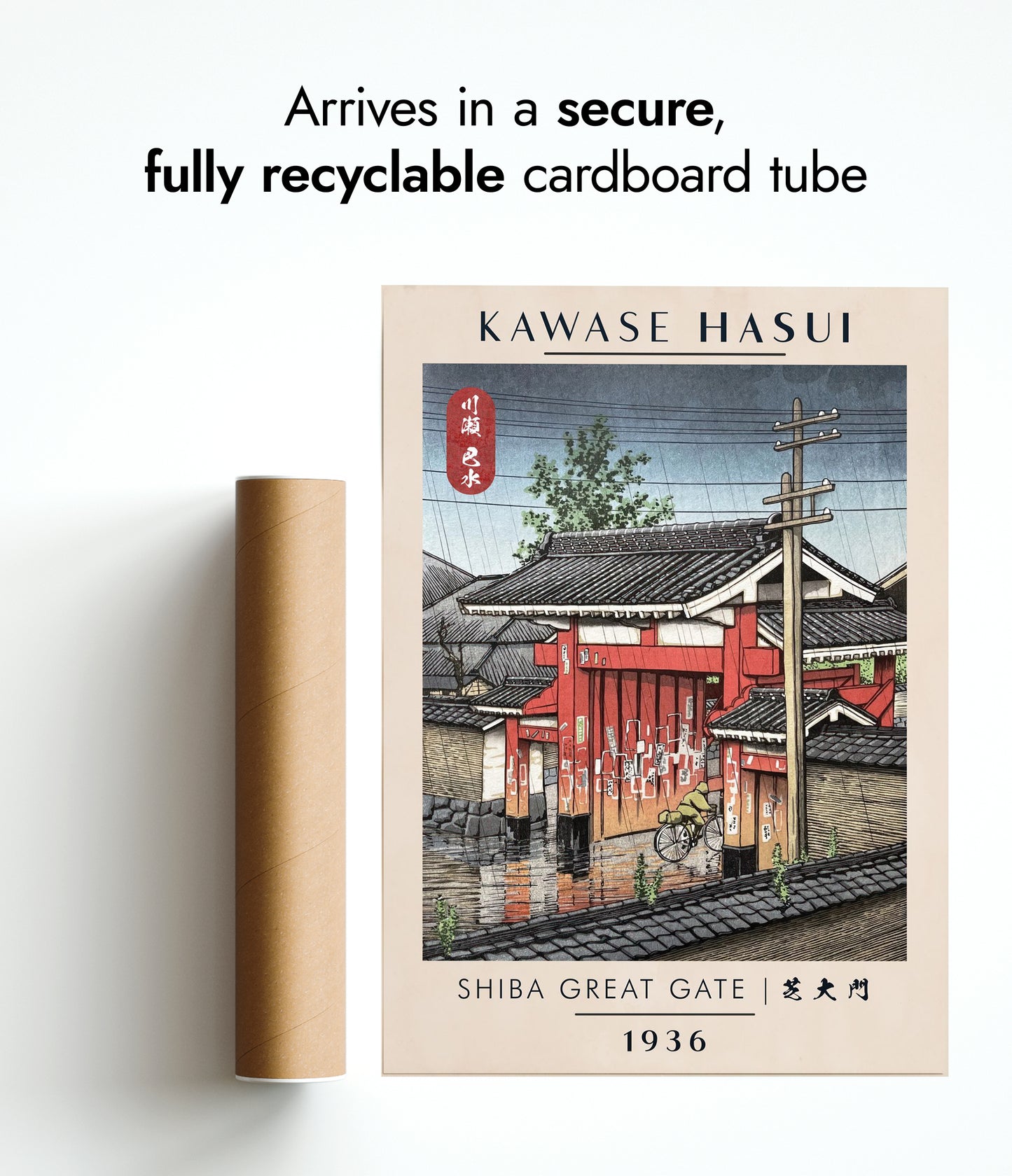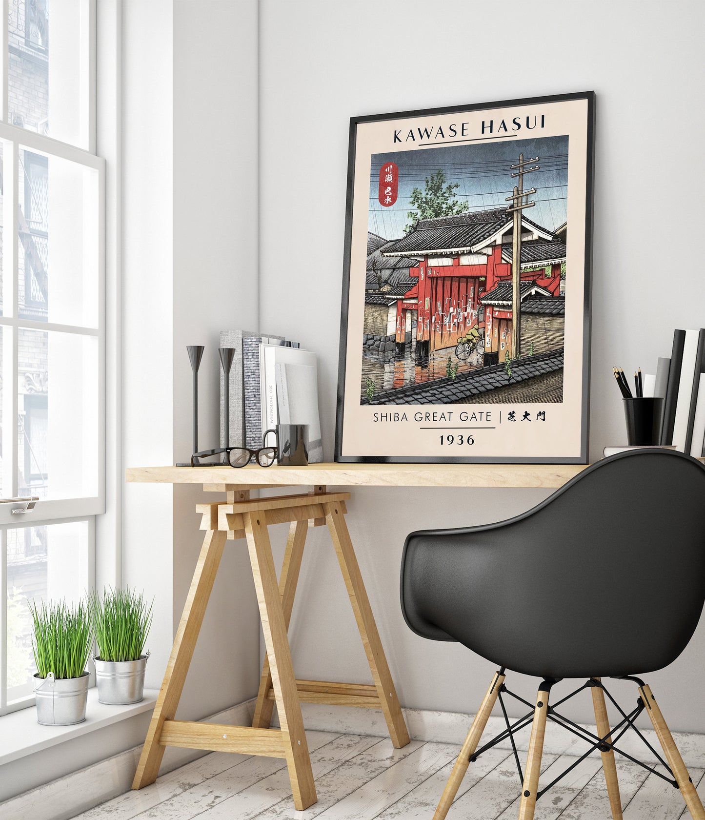This "Shiba Great Gate" poster by Kawase Hasui, created in 1936, captures the traditional charm of Japanese woodblock artistry. The scene features a striking red gate amidst a serene cityscape, accentuated by gentle rainfall and a lone bicycle. The composition is balanced by lush trees and muted beige tones, embodying the Ukiyo-e style's beauty and tranquility.