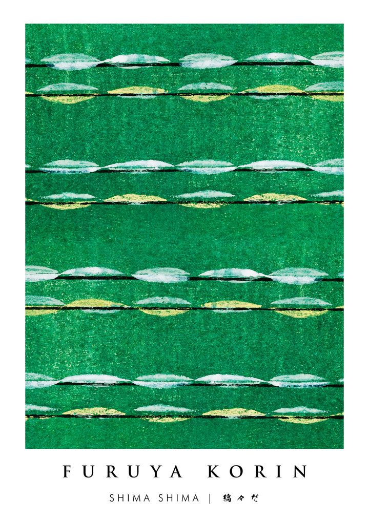 This poster, "Shima Shima 1" by Furuya Korin, showcases a minimalist abstract design inspired by traditional Japanese woodblock art. The artwork features repetitive horizontal bands of green with subtle hints of white and yellow, evoking textile patterns. Ideal for lovers of traditional and abstract art, this piece elegantly merges historical craftsmanship with minimalist aesthetics.