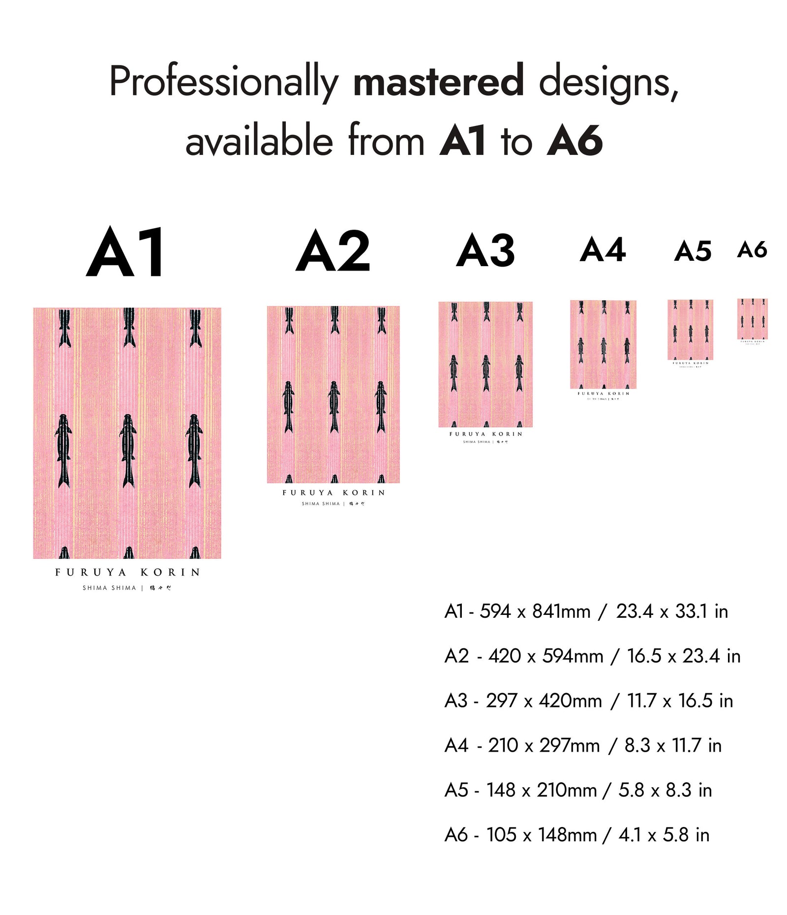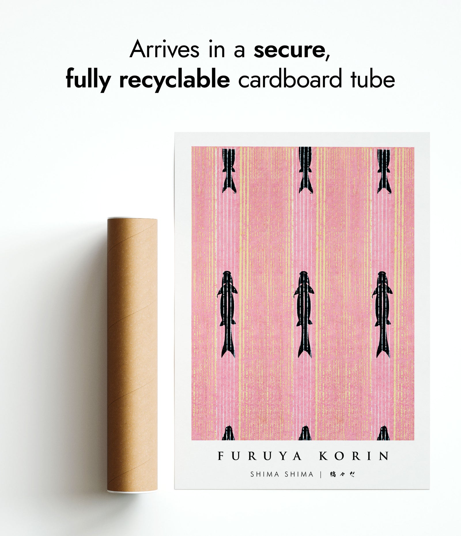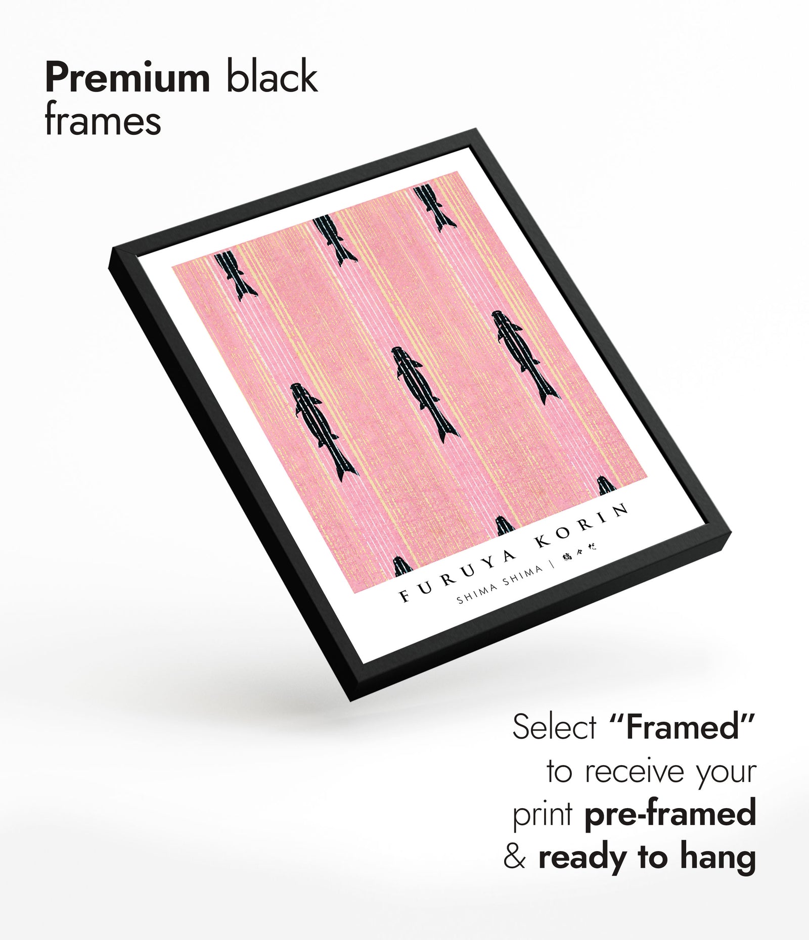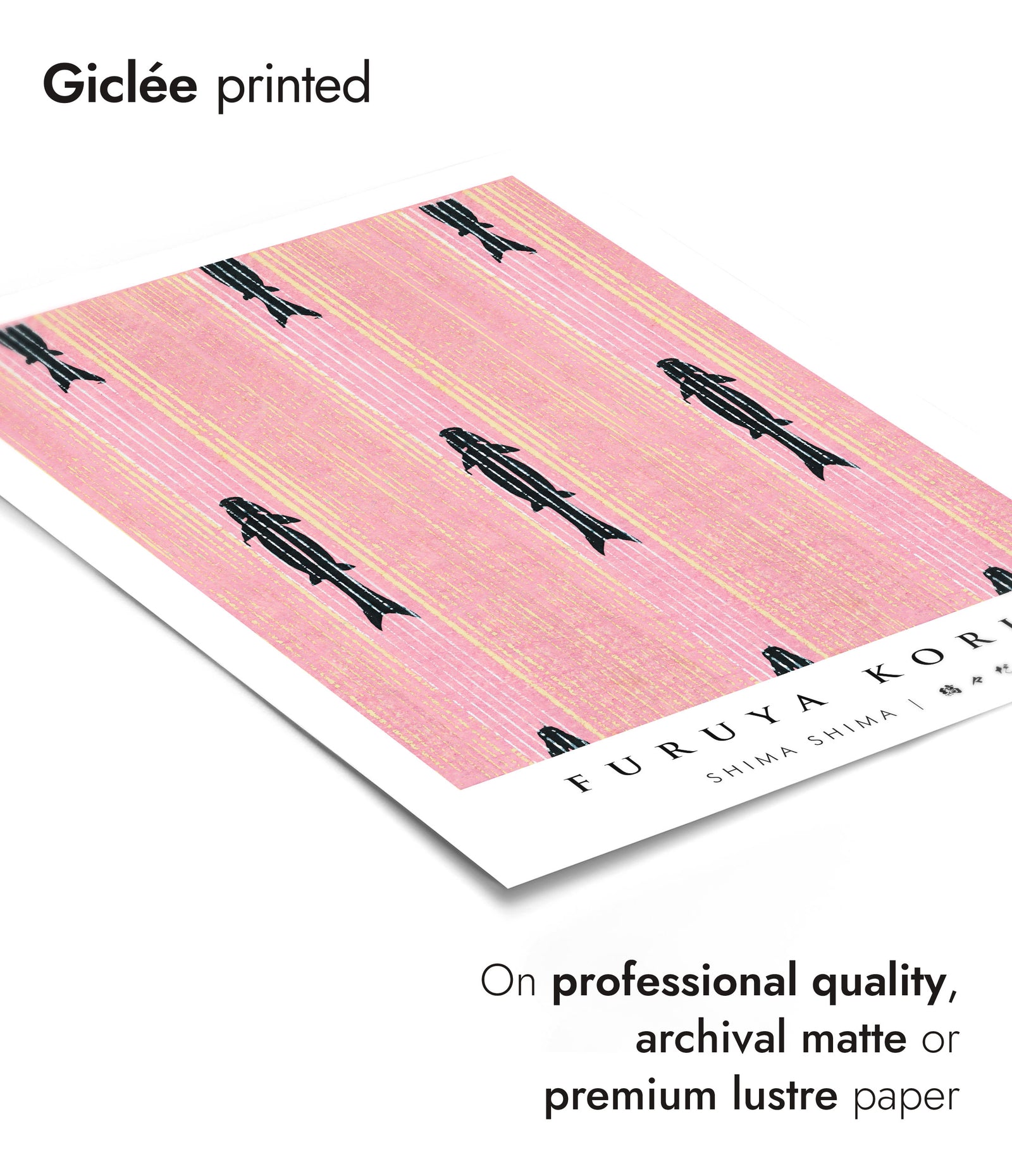 This minimalist poster, "Shima Shima 2" by Furuya Korin, showcases an abstract pattern inspired by traditional Japanese woodblock art. The design features black fish silhouettes against a soft pink background with subtle vertical lines, creating a harmonious textile effect. Ideal for adding a touch of traditional Japanese aesthetics to modern interiors.