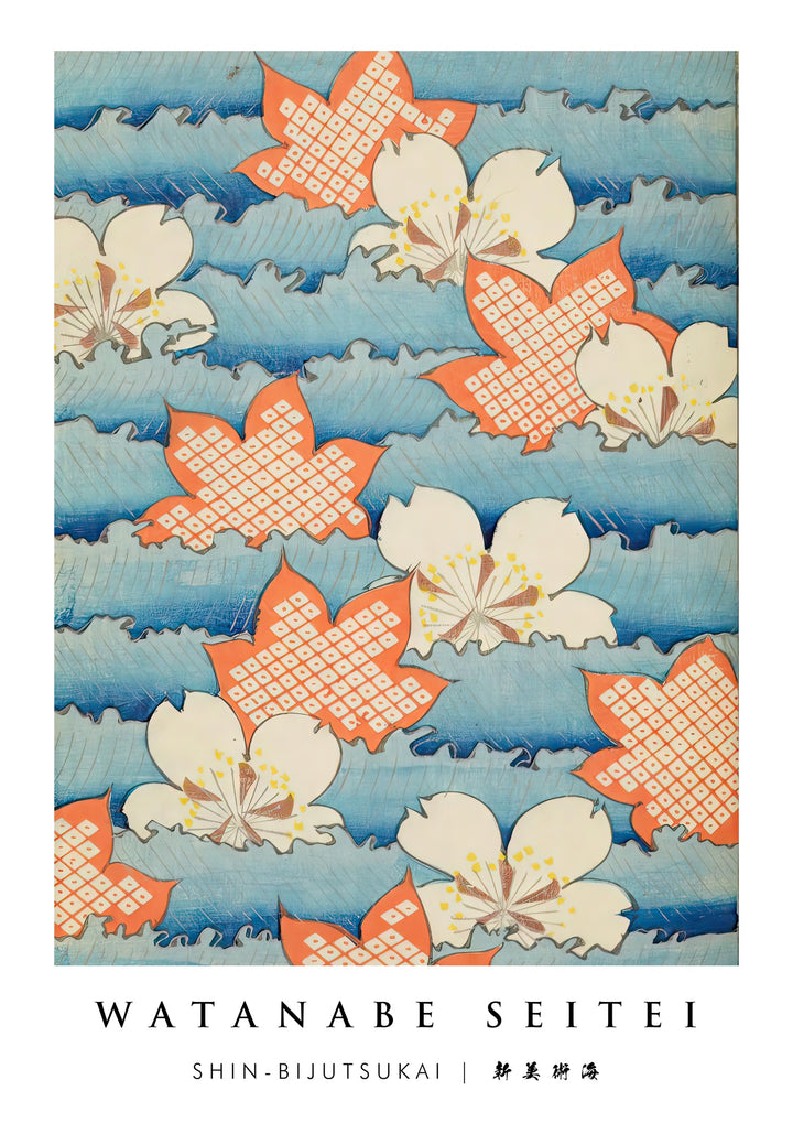 This captivating Japanese art poster by Watanabe Seitei, titled "Shin-Bijutsukai 5," showcases traditional woodblock elements. It features cascading cherry blossoms and vibrant maple leaves set against rhythmic blue waves. The minimalist design and abstract portrayal evoke a serene natural harmony, ideal for fans of Ukiyo-e and traditional Japanese prints.