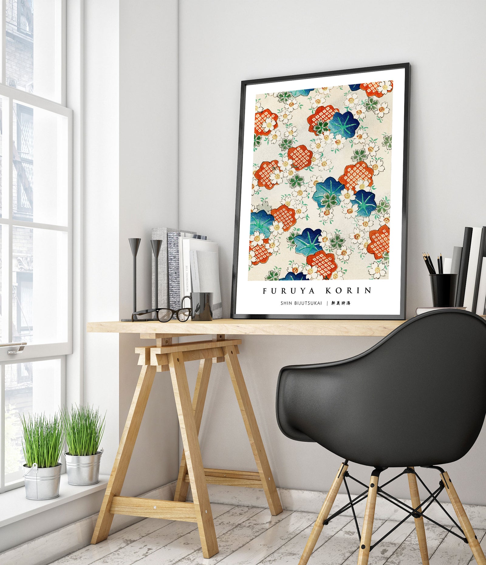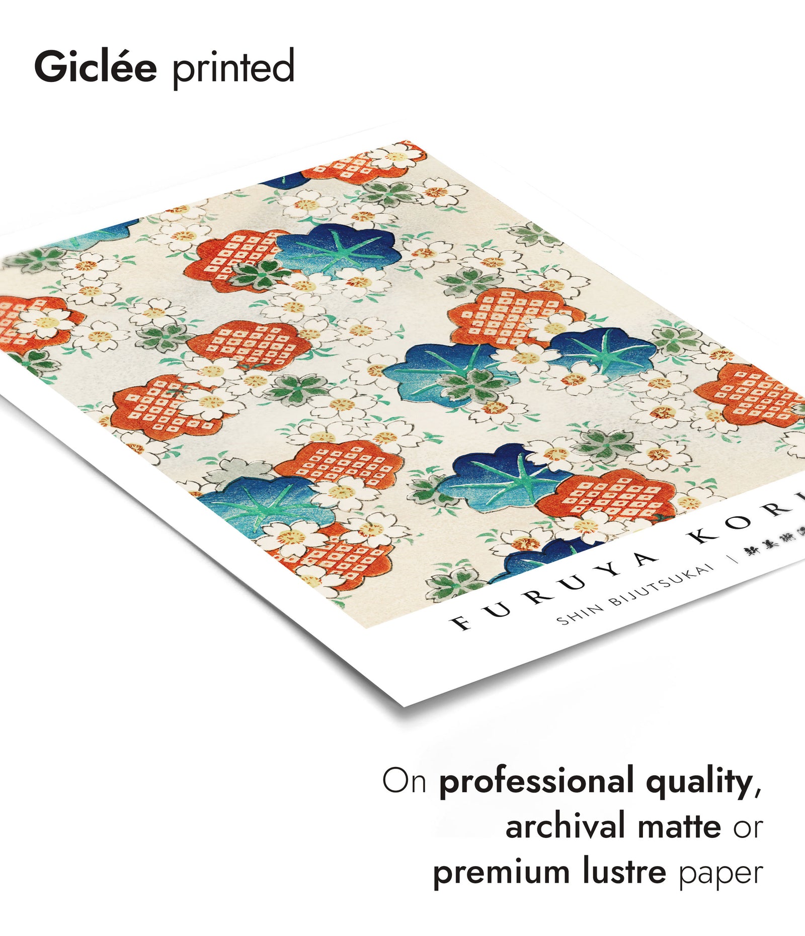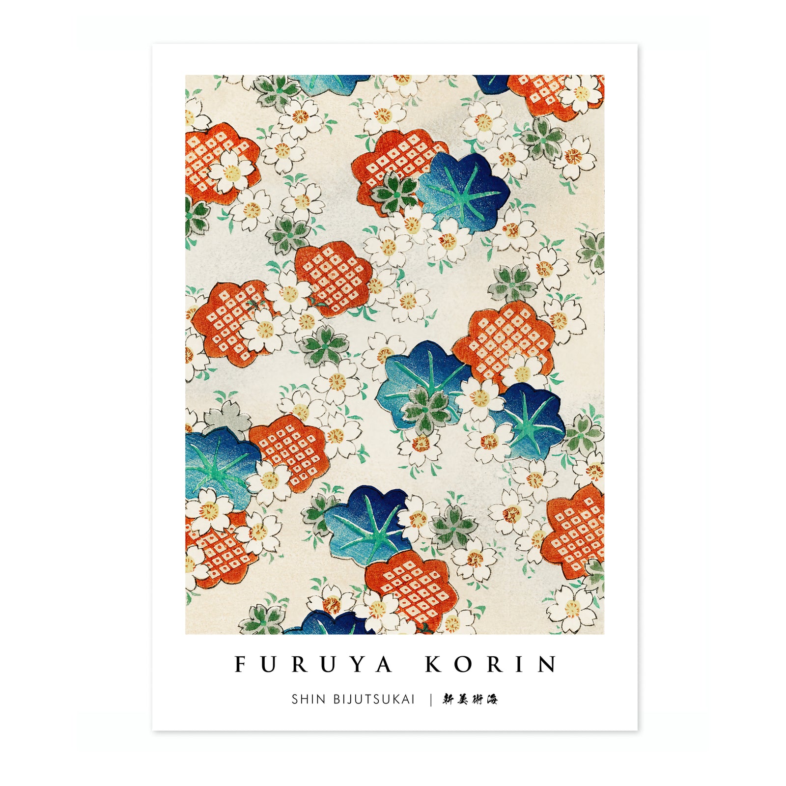This floral art poster by Furuya Korin, titled *Shin Bijutsukai*, showcases intricate traditional Japanese woodblock patterns. Rich hues of blue and red are interwoven with delicate floral motifs, creating a harmonious composition that epitomizes ukiyo-e aesthetics. Ideal for those appreciating Japanese artistry, this poster adds a touch of elegance and cultural heritage to any space.