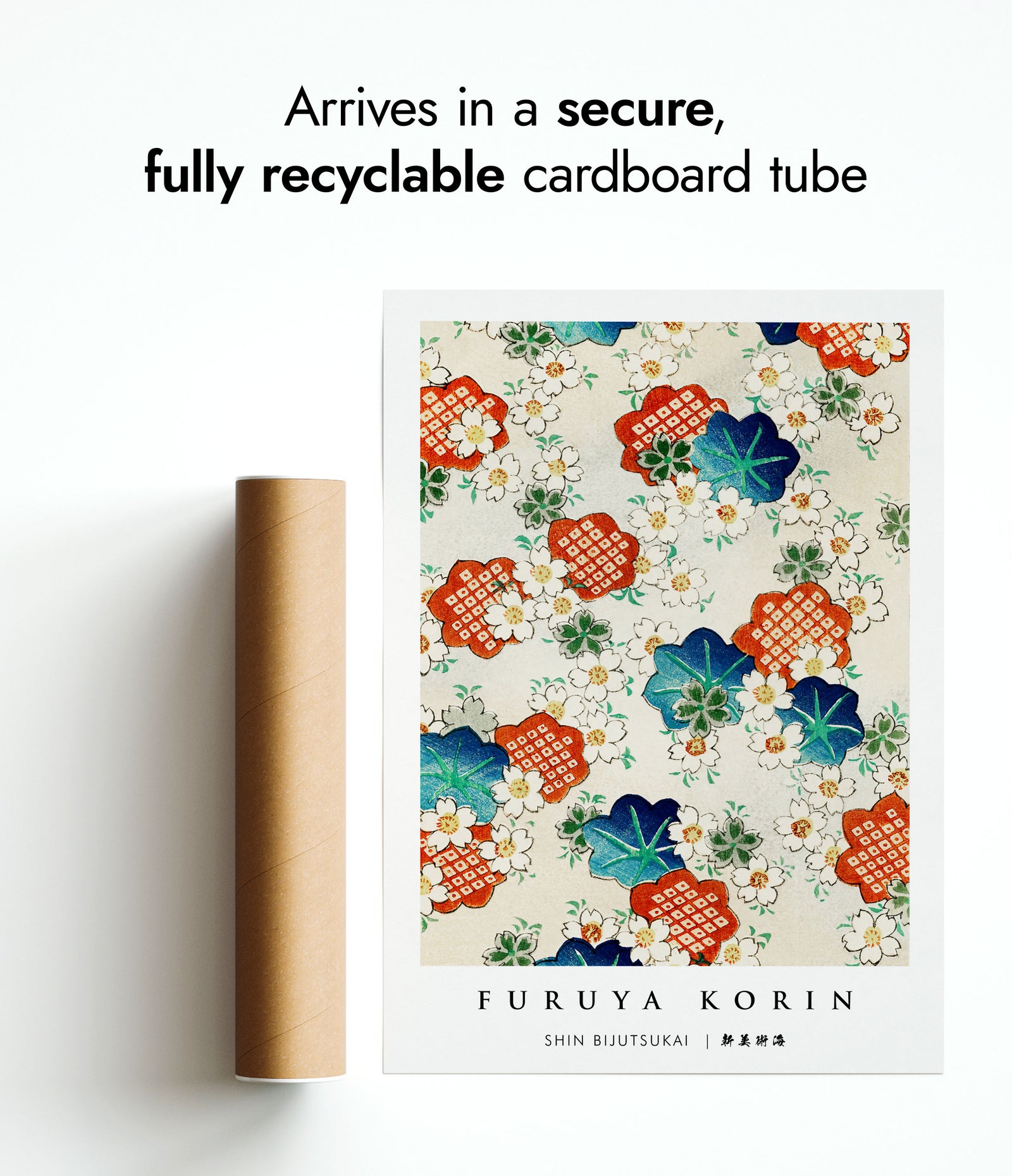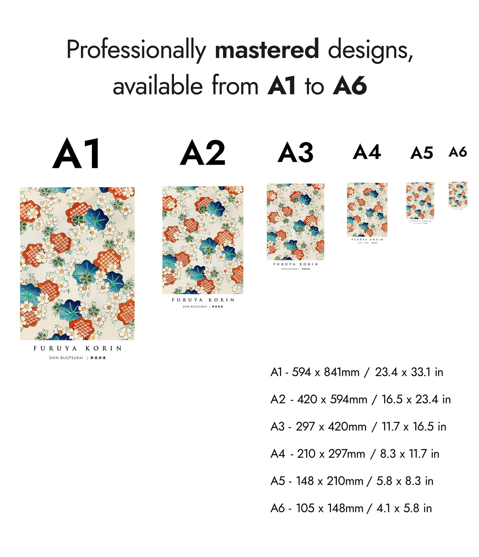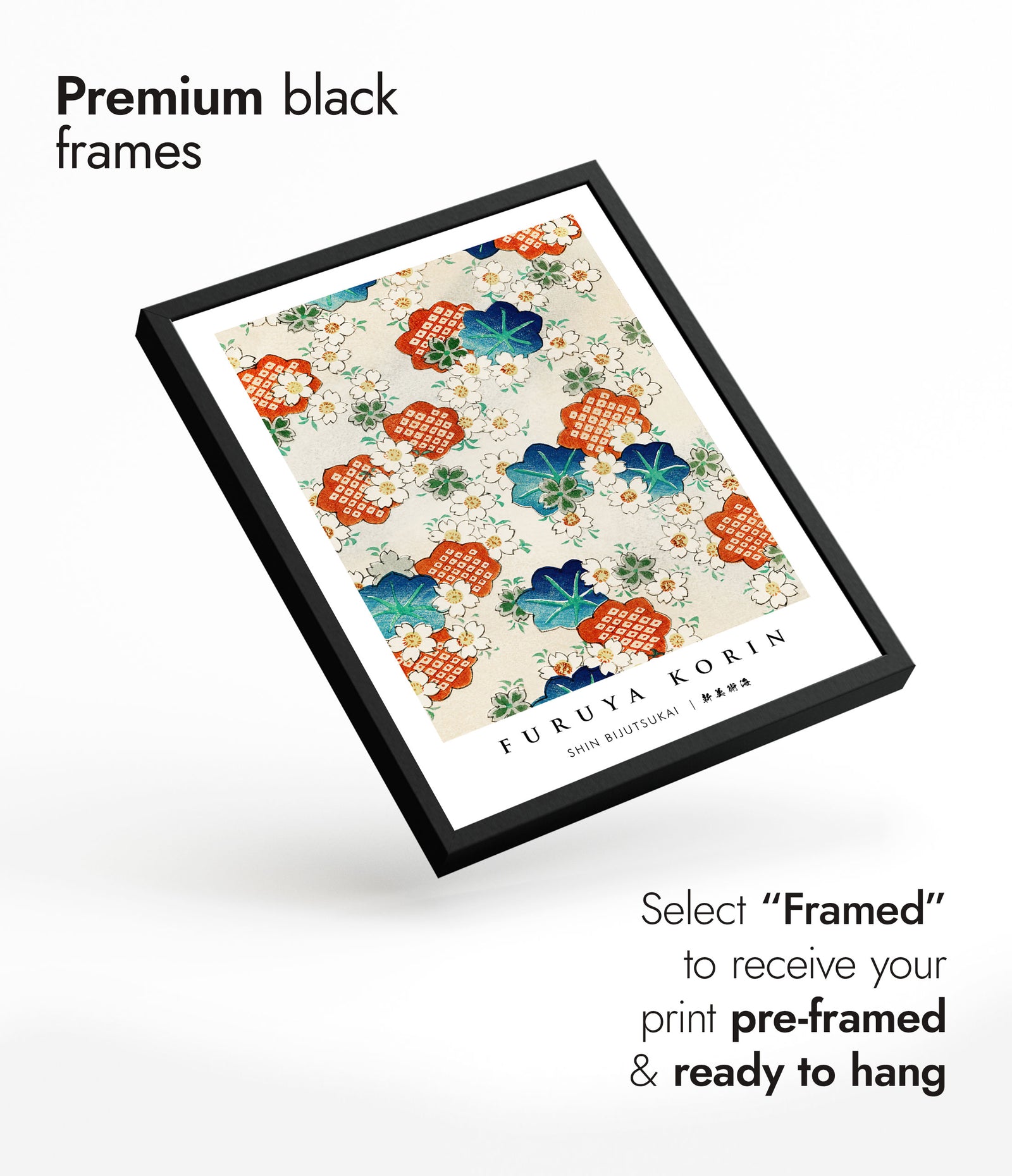This floral art poster by Furuya Korin, titled *Shin Bijutsukai*, showcases intricate traditional Japanese woodblock patterns. Rich hues of blue and red are interwoven with delicate floral motifs, creating a harmonious composition that epitomizes ukiyo-e aesthetics. Ideal for those appreciating Japanese artistry, this poster adds a touch of elegance and cultural heritage to any space.