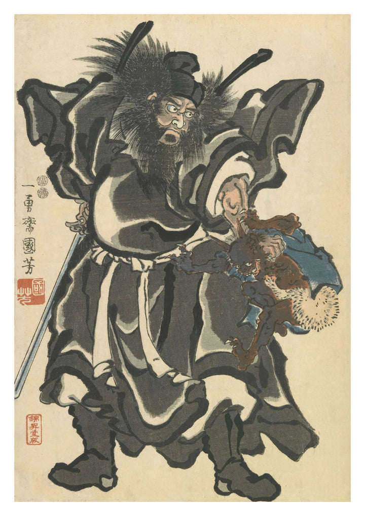 This striking poster features "Shoki & Demon" by Utagawa Kuniyoshi, a master of traditional Japanese woodblock printing. The artwork portrays the mythical warrior Shoki wielding a sword and capturing a demon, emanating powerful and dynamic energy. The intricate details and bold lines showcase the essence of Ukiyo-E art, perfect for admirers of classic Japanese illustrations.
