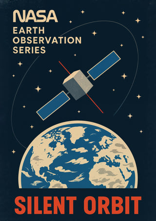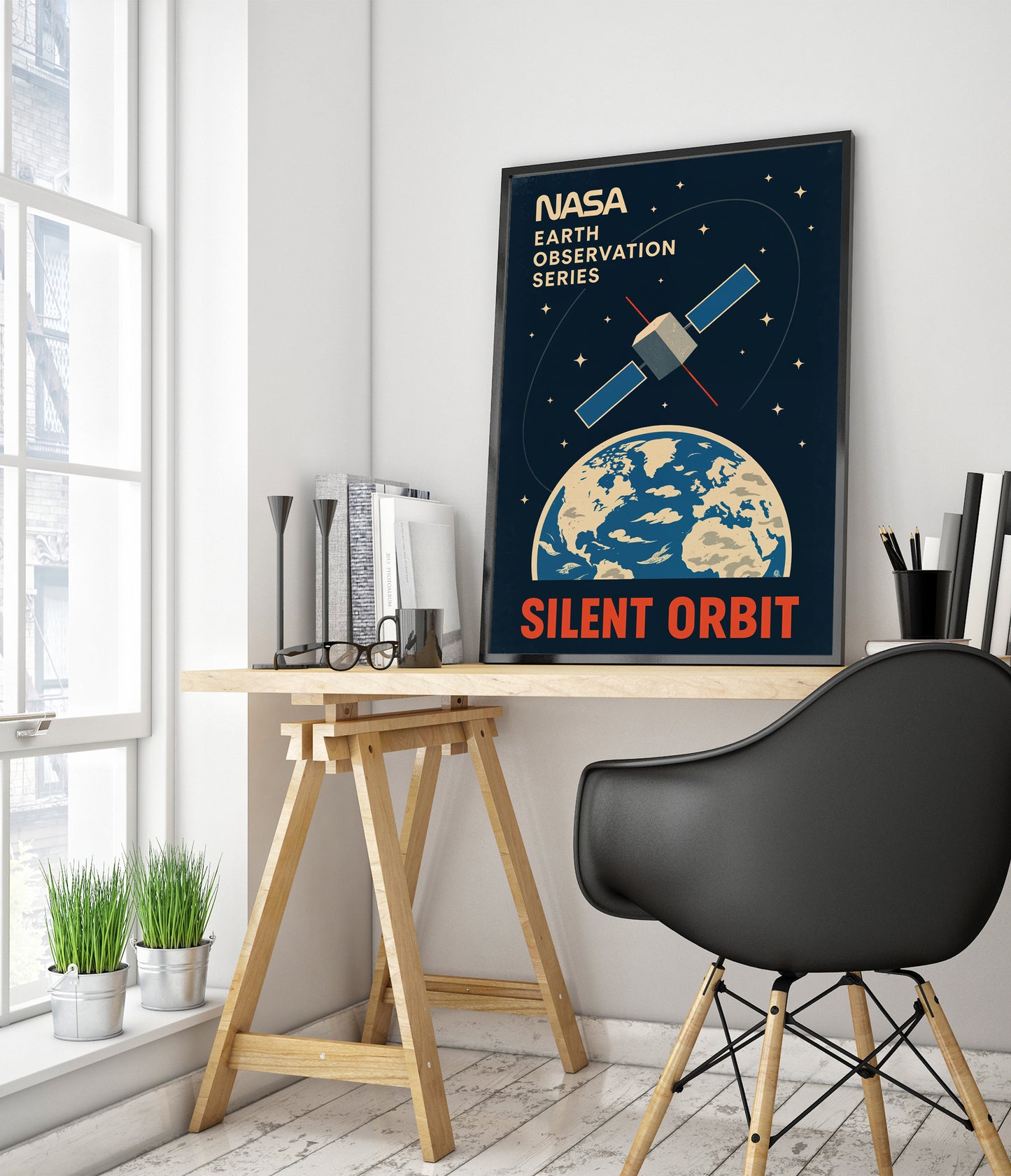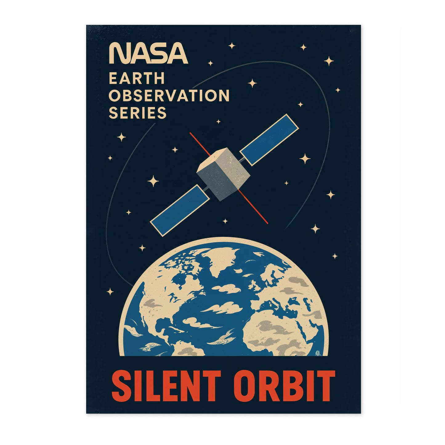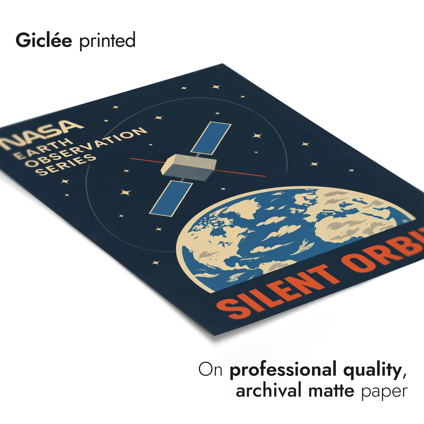 This "Silent Orbit" poster from the NASA Earth Observation Series showcases a vintage graphic design. It features a satellite orbiting Earth, highlighted against a starry night sky. The retro style emphasizes classic space exploration themes with bold typography. Perfect for enthusiasts of space and astronomy, this art print captures the intrigue of silent, celestial observation.