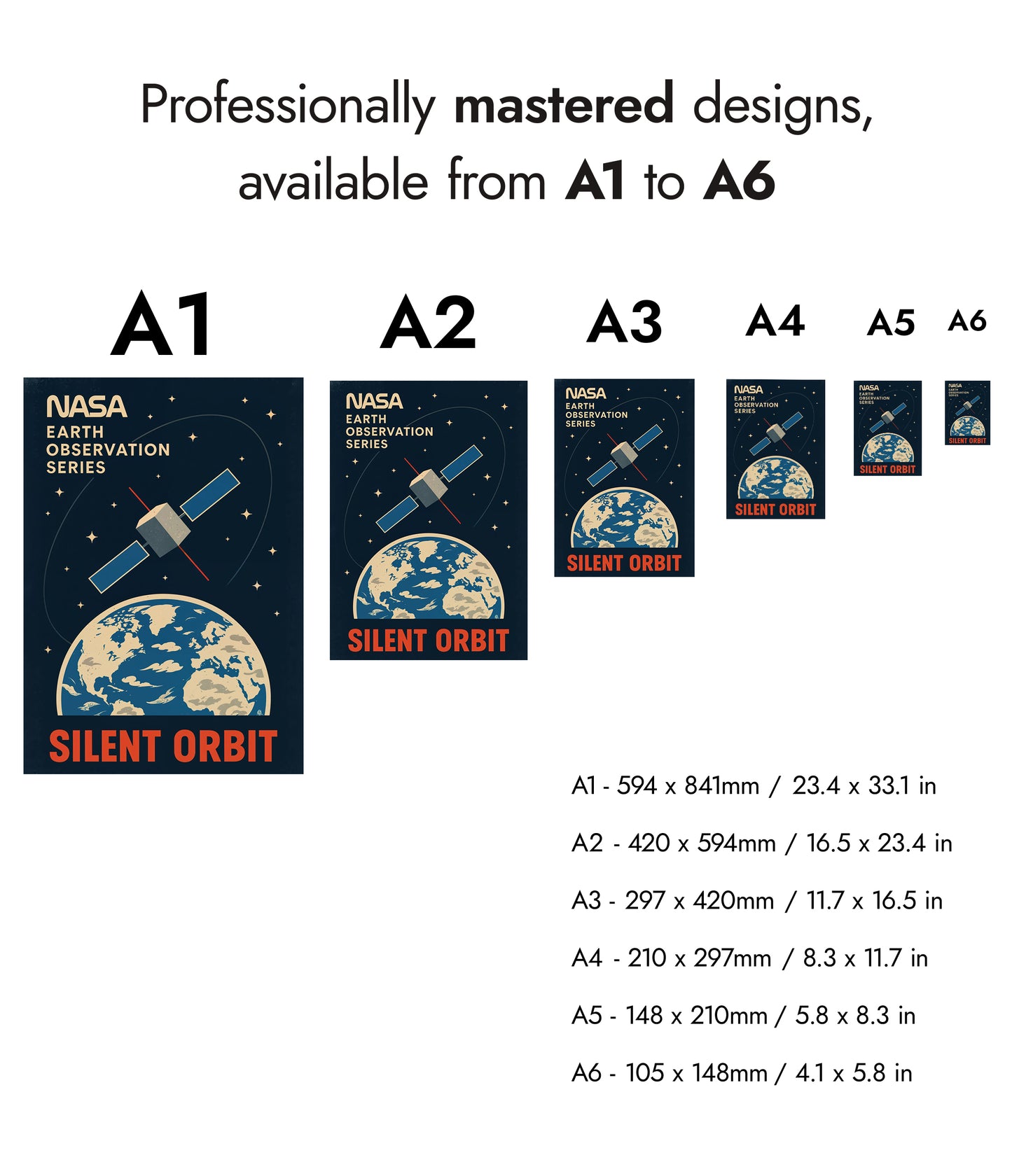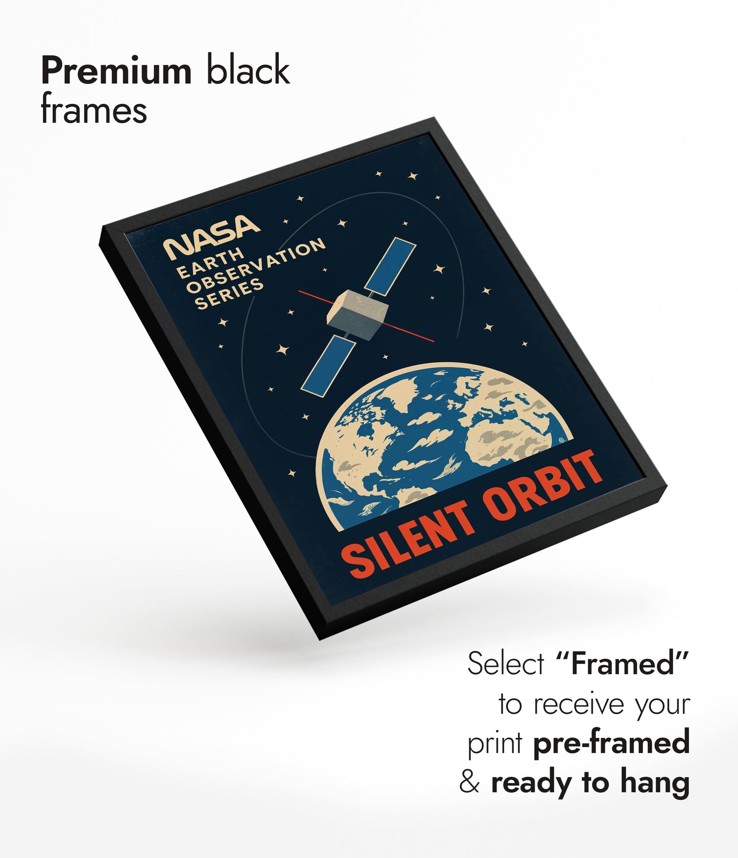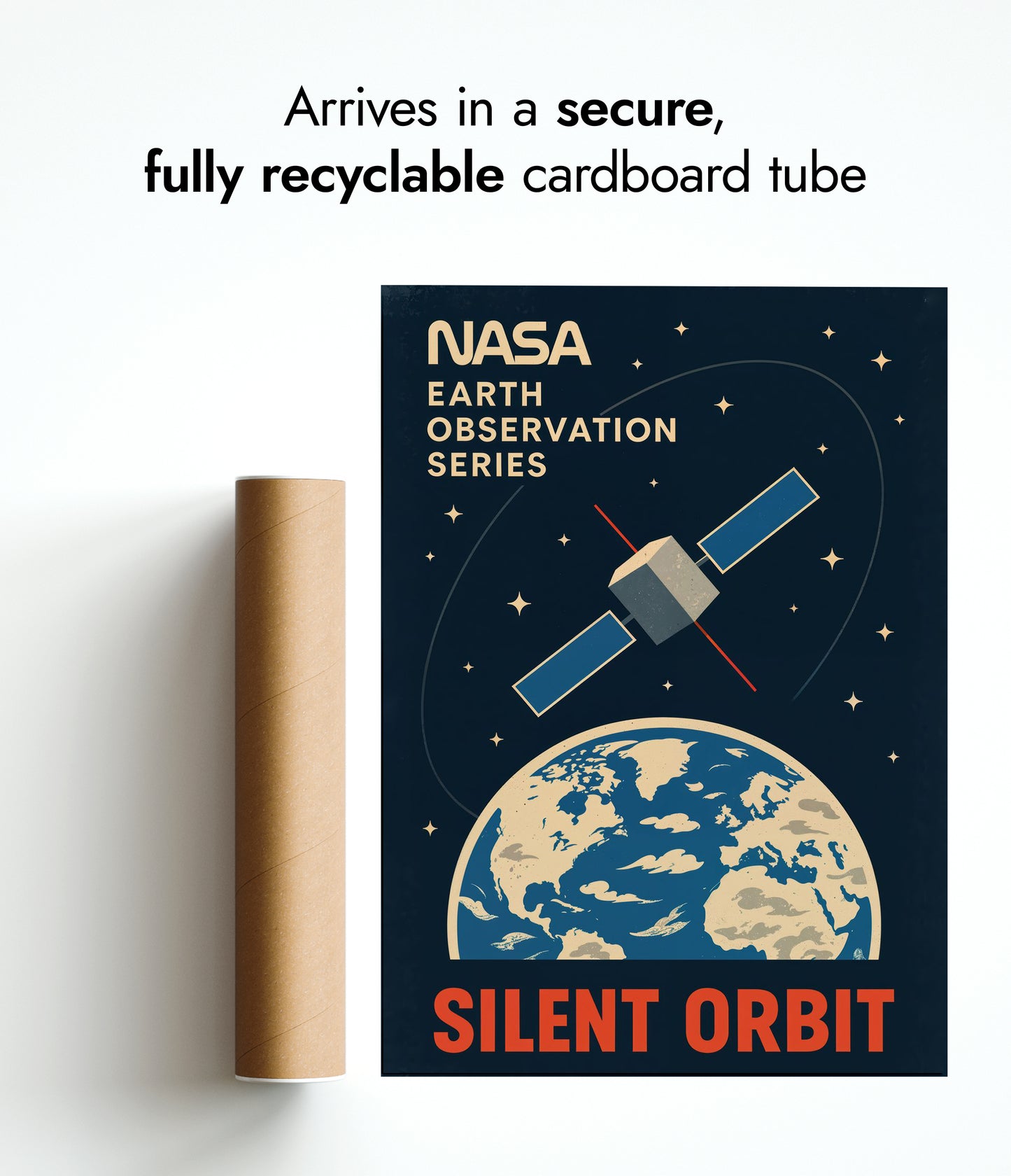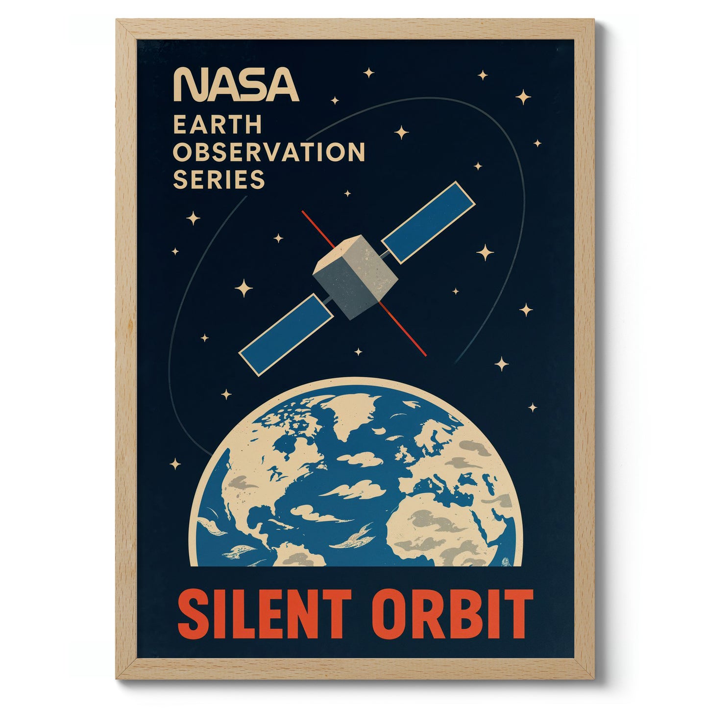 This "Silent Orbit" poster from the NASA Earth Observation Series showcases a vintage graphic design. It features a satellite orbiting Earth, highlighted against a starry night sky. The retro style emphasizes classic space exploration themes with bold typography. Perfect for enthusiasts of space and astronomy, this art print captures the intrigue of silent, celestial observation.