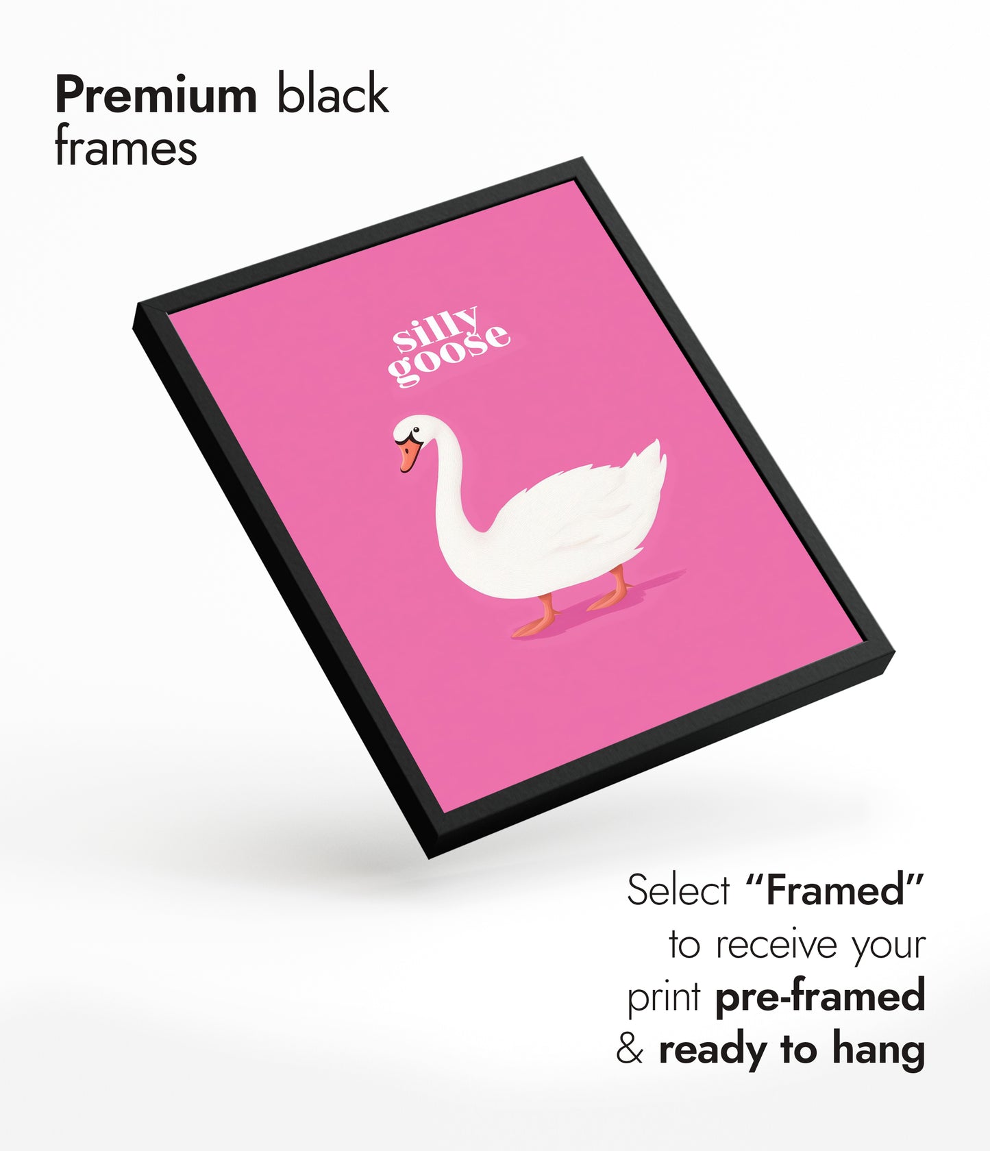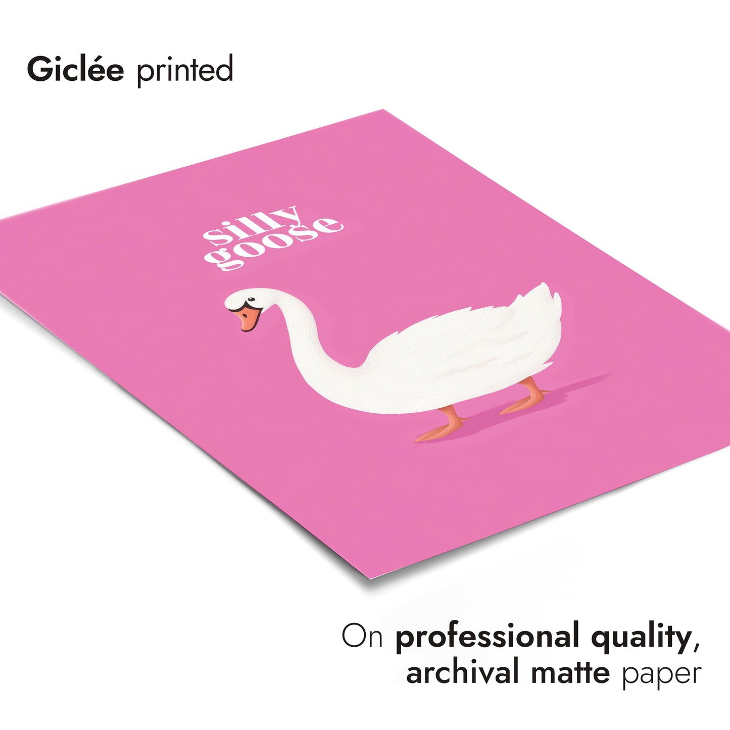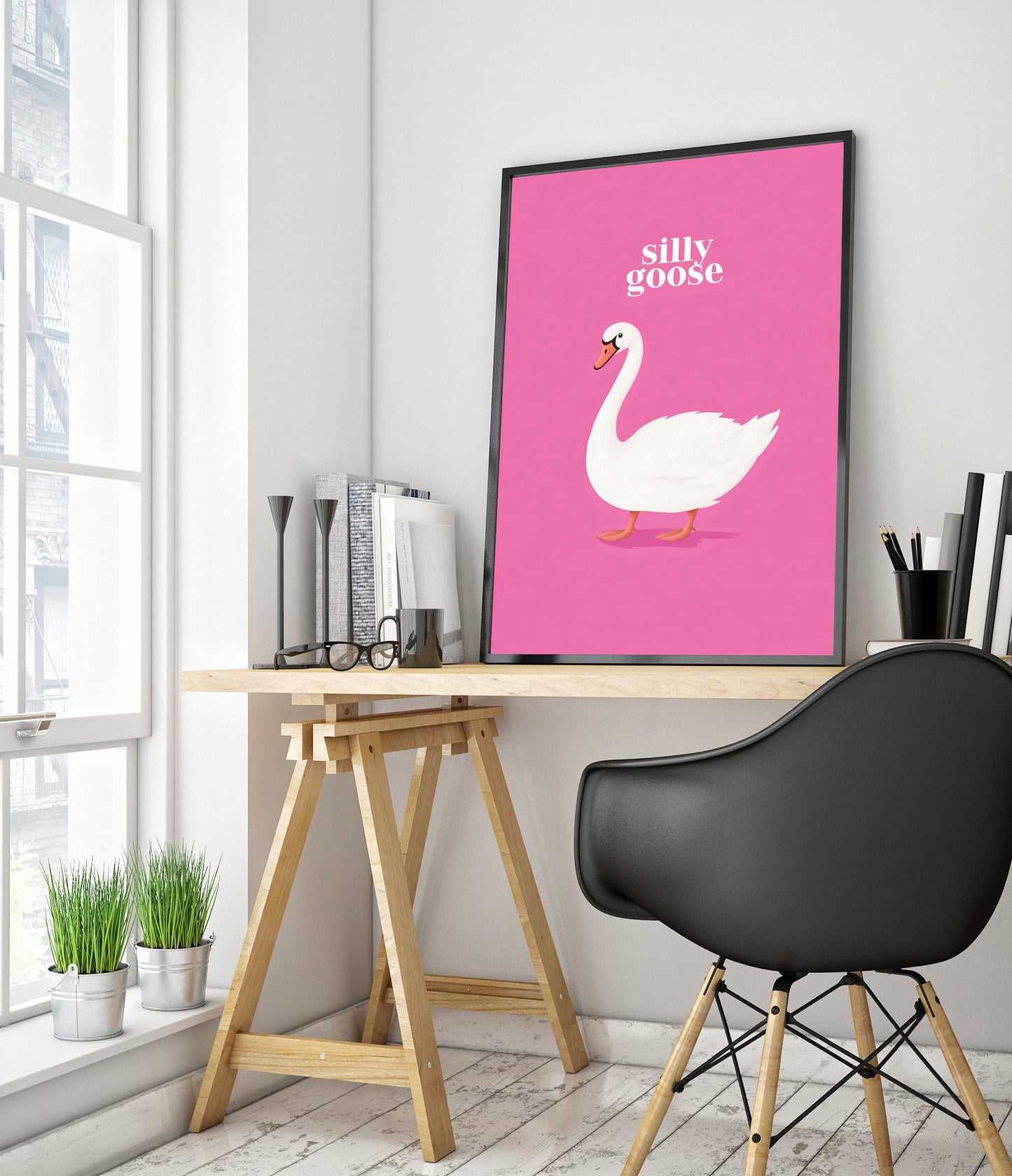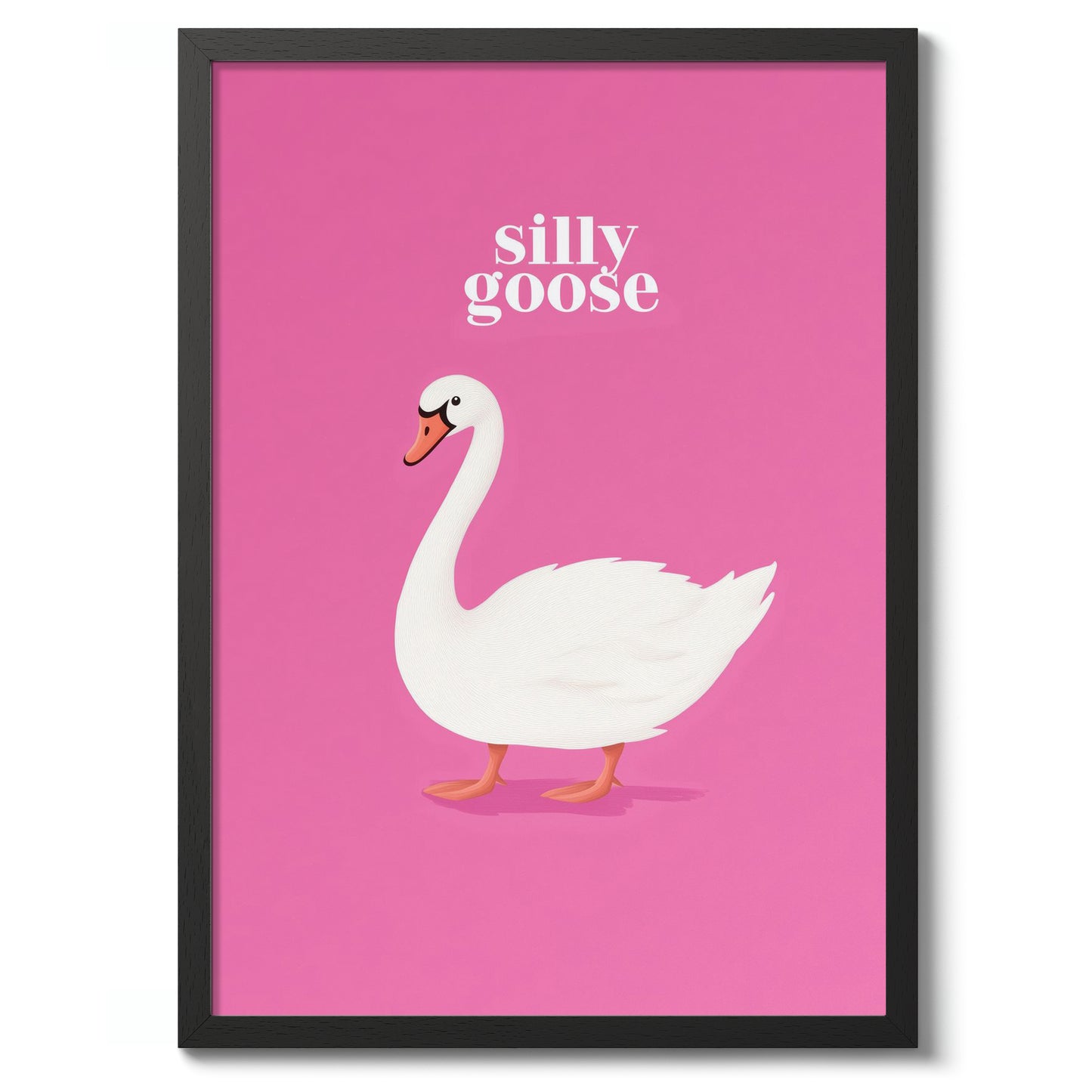 Featuring a whimsical goose with a cheeky, cartoonish expression, the "Silly Goose" poster is set against a vibrant pink background. The playful typography adds a humorous touch, making it an ideal choice for livening up any space with a splash of humor and charm. Perfect for those who appreciate typographic and graphic art styles.