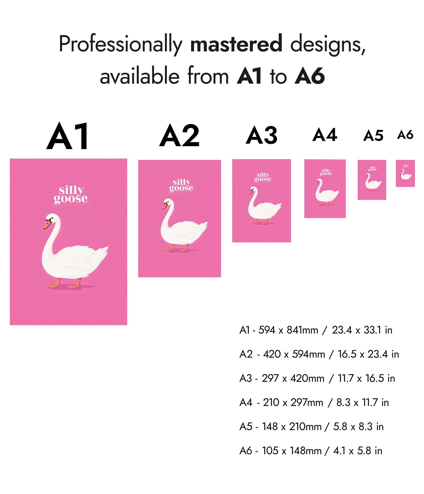 8 colour giclée print process on high-quality 230gsm archival matte paper. All our paper is FSC Certified and prints come with a lifetime fade-resistance guarantee.