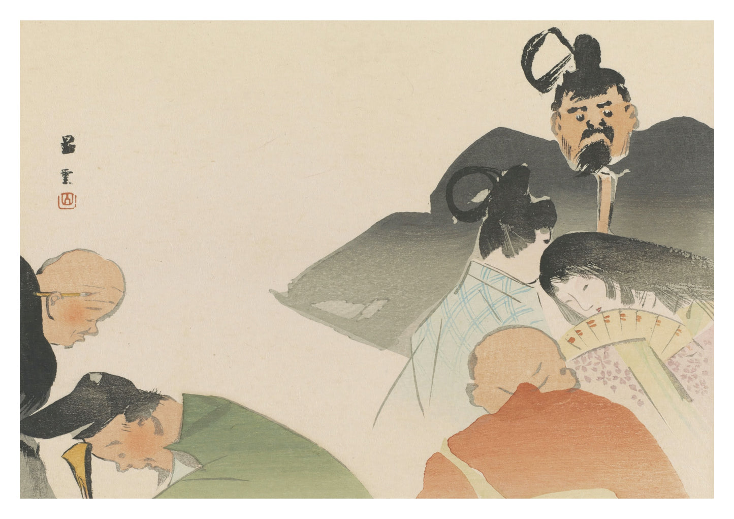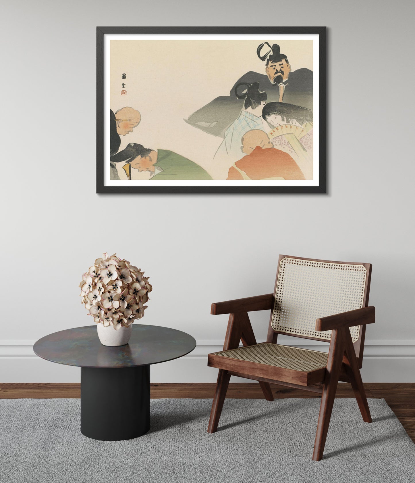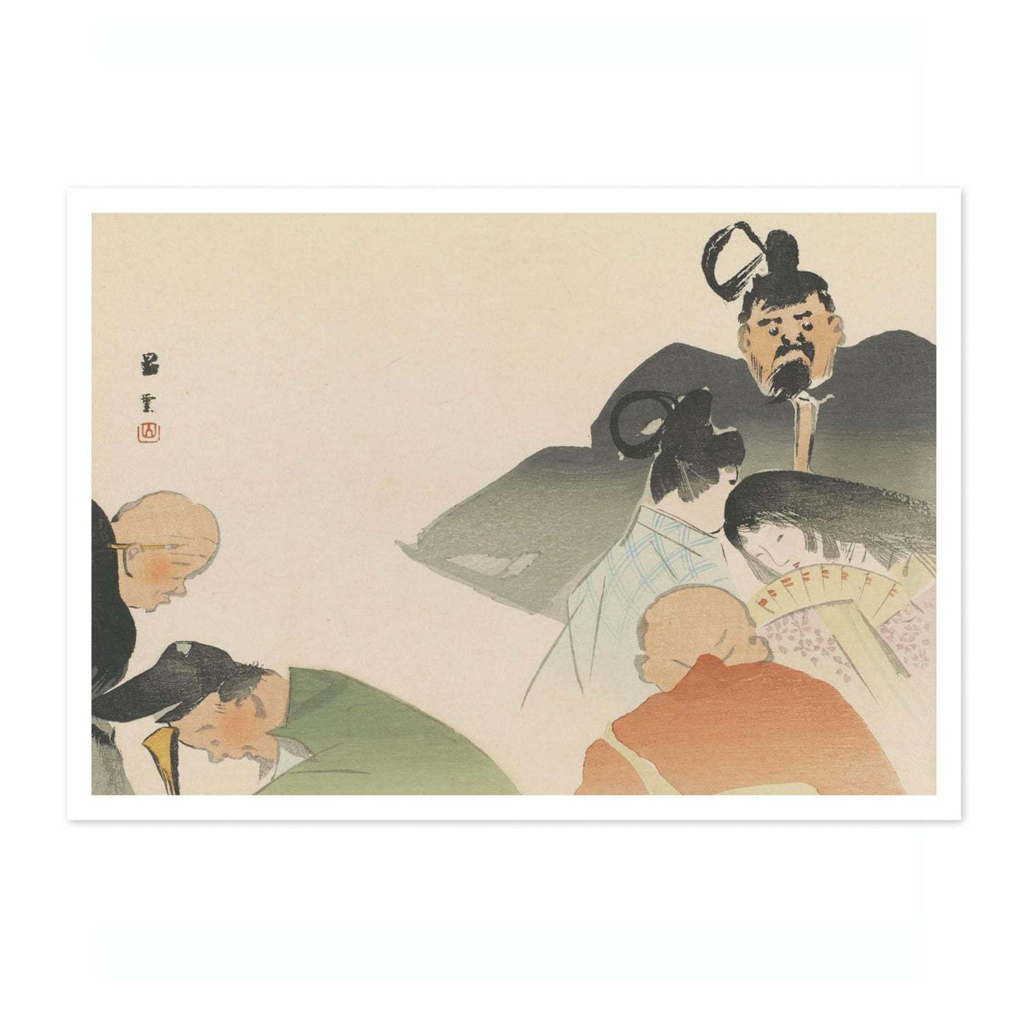 This "Six Poets" poster by Yamamoto Shoun captures a traditional Japanese woodblock style, showcasing figures in kimonos. The composition highlights a dignified king and contemplative poets, featuring delicate, multicolored detailing against a soft beige background. This traditional artwork reflects elements of the Shin-Hanga and Ukiyo-E styles, perfect for those appreciating Japanese cultural art in poster form.