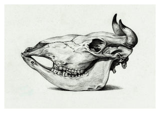 This vintage illustration poster features a detailed, monochrome drawing of a cow skull by Jean Bernard. The precise, lifelike rendering highlights the skull's intricate bone structure and textural nuances, showcasing a blend of natural beauty and anatomical study. Perfect for lovers of nature-themed and animal art, this timeless piece adds a sophisticated touch to any space.