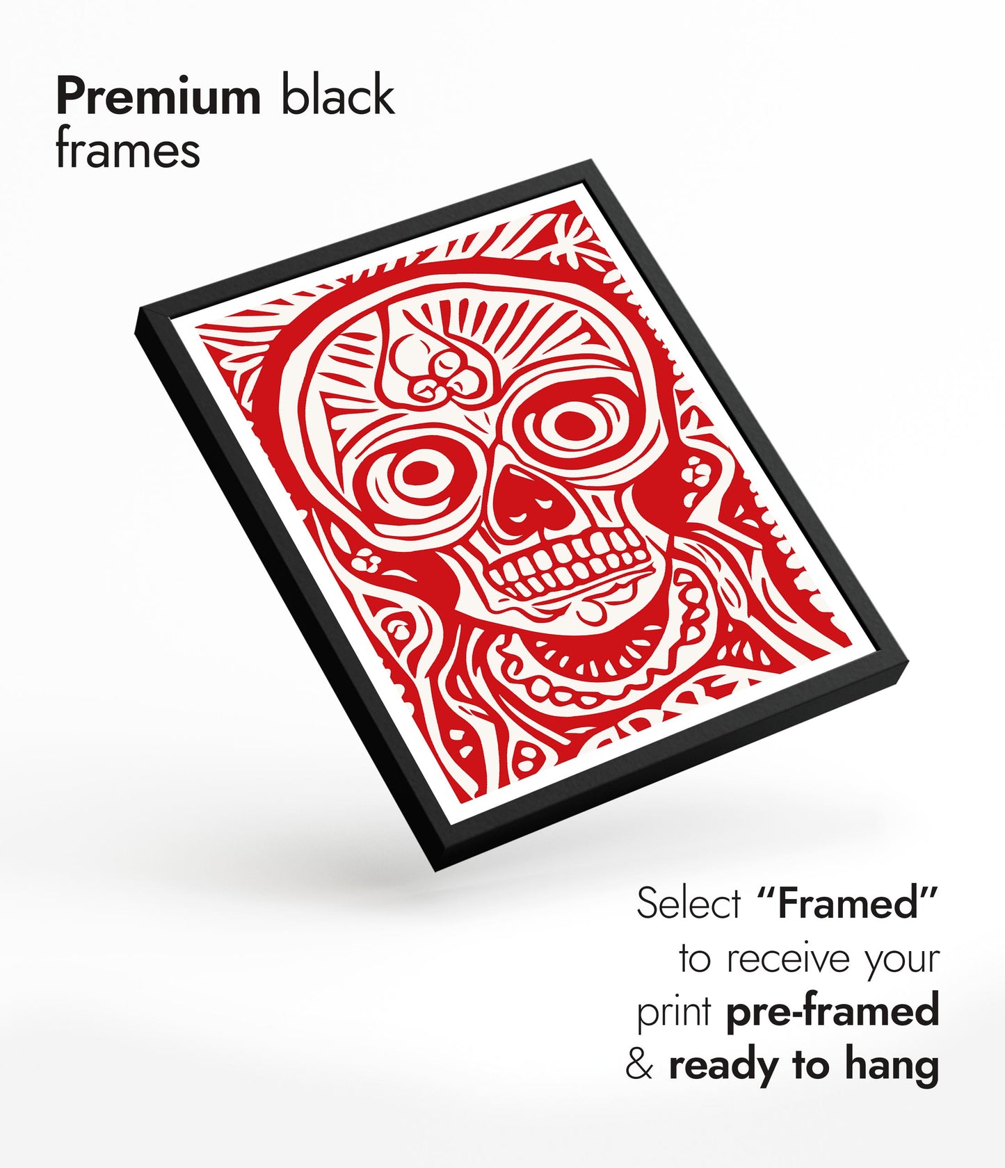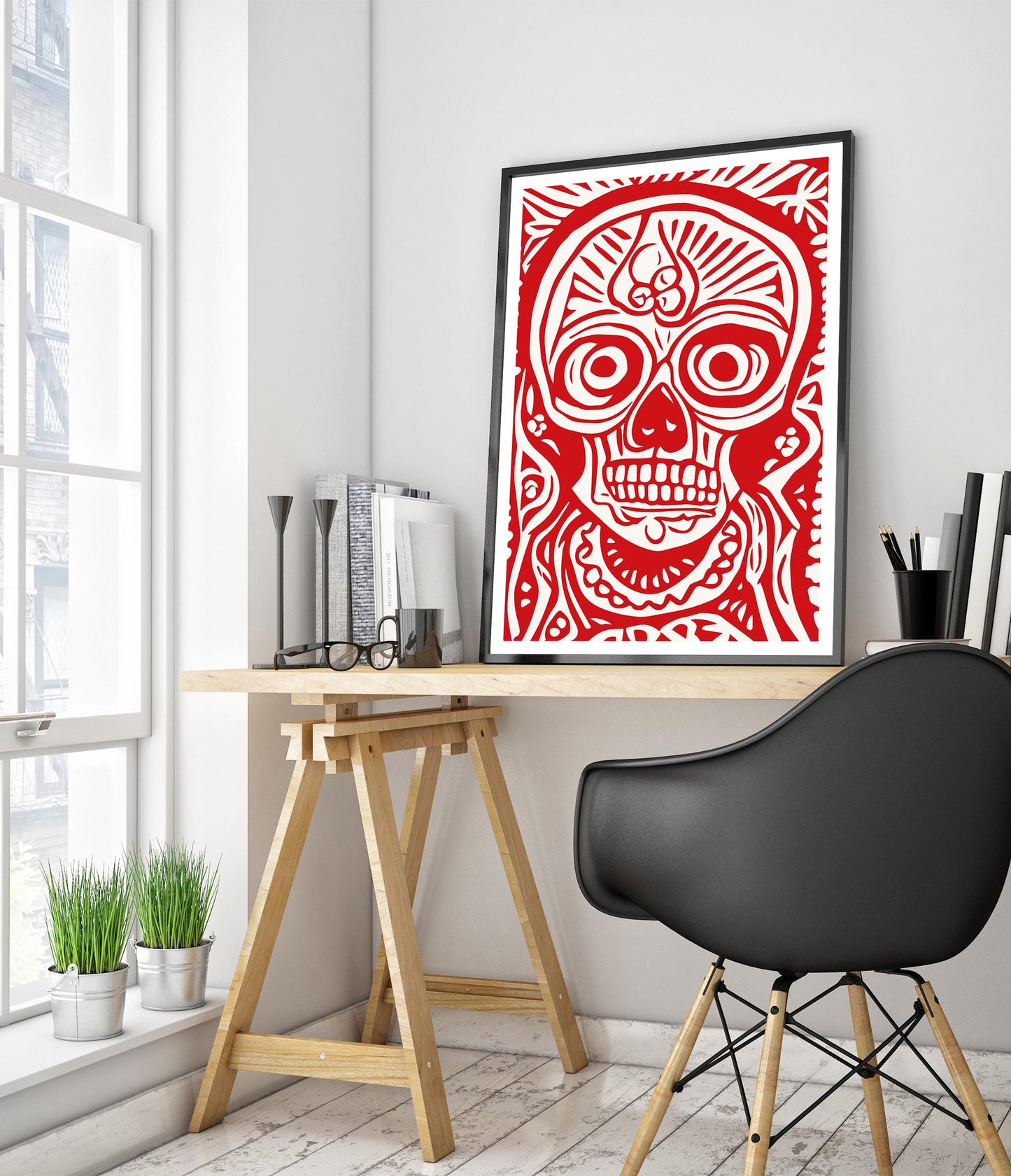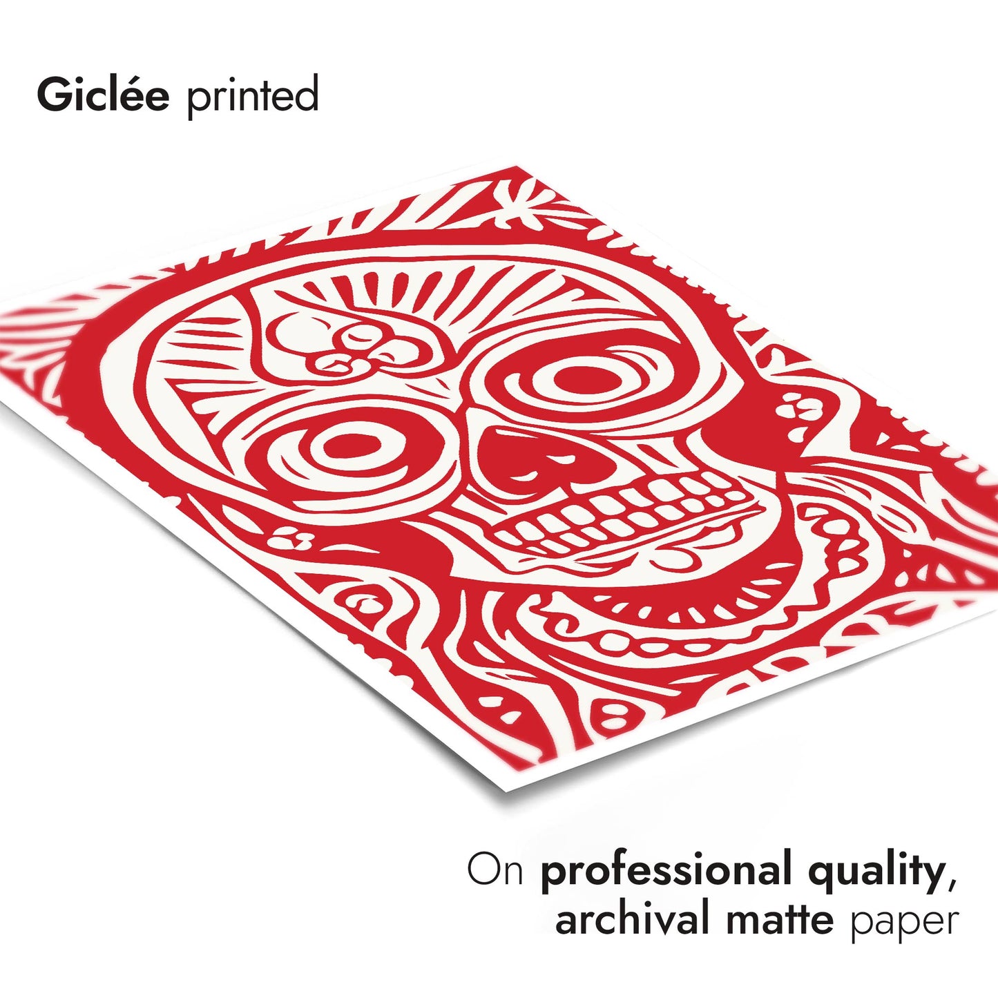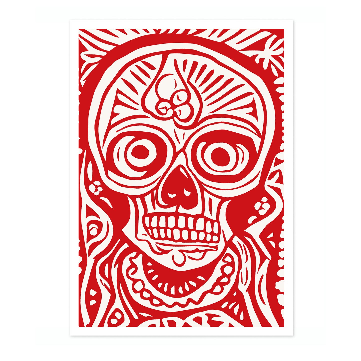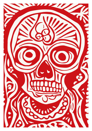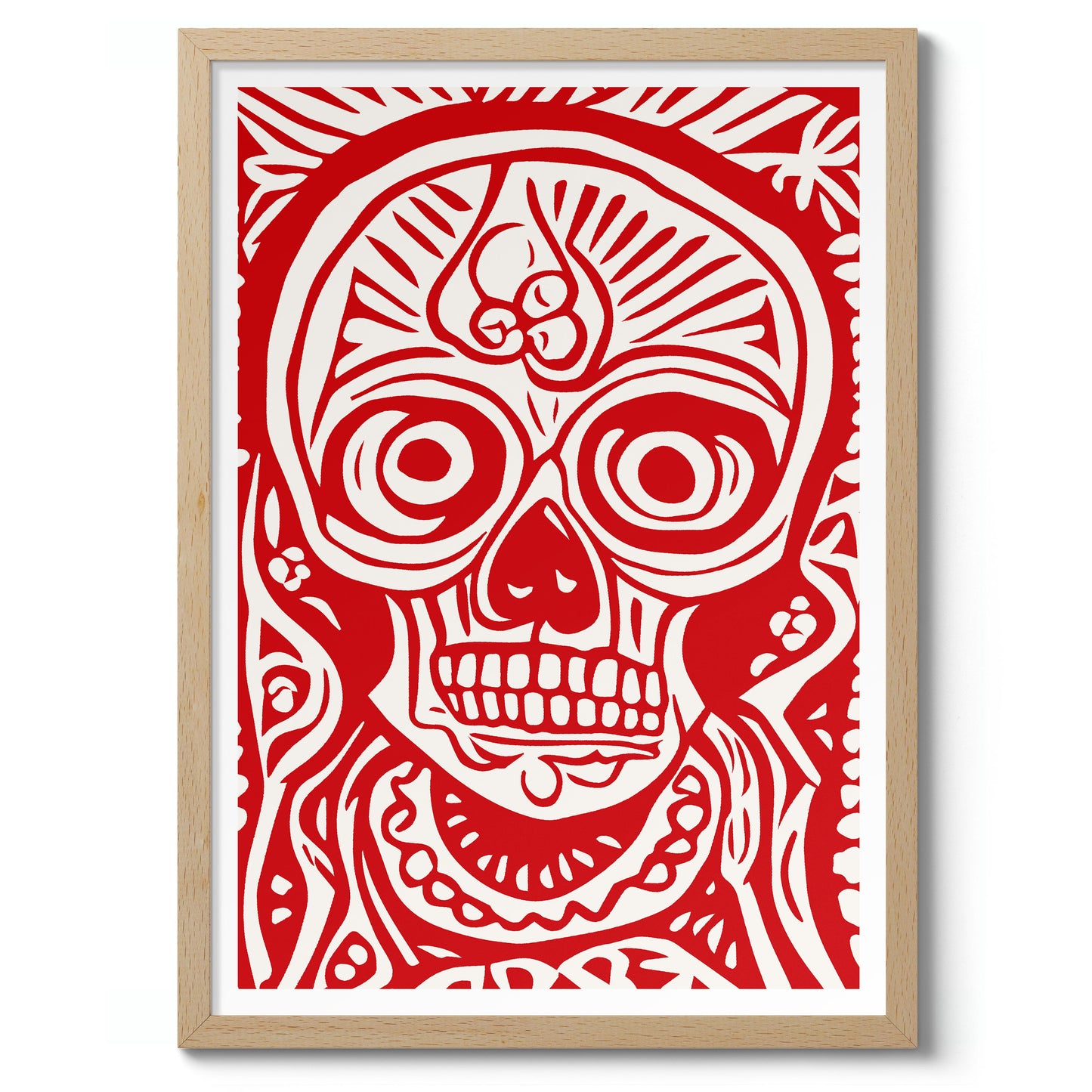 This striking poster features a bold red graphic representation of a skull, reminiscent of traditional Mexican Dia de los Muertos (Day of the Dead) iconography. The intricate design elements and vivid colour capture themes of death and celebration. Ideal for adding a touch of vintage aesthetic with cultural significance to any space. High-quality print ensures lasting durability and vibrant colour.