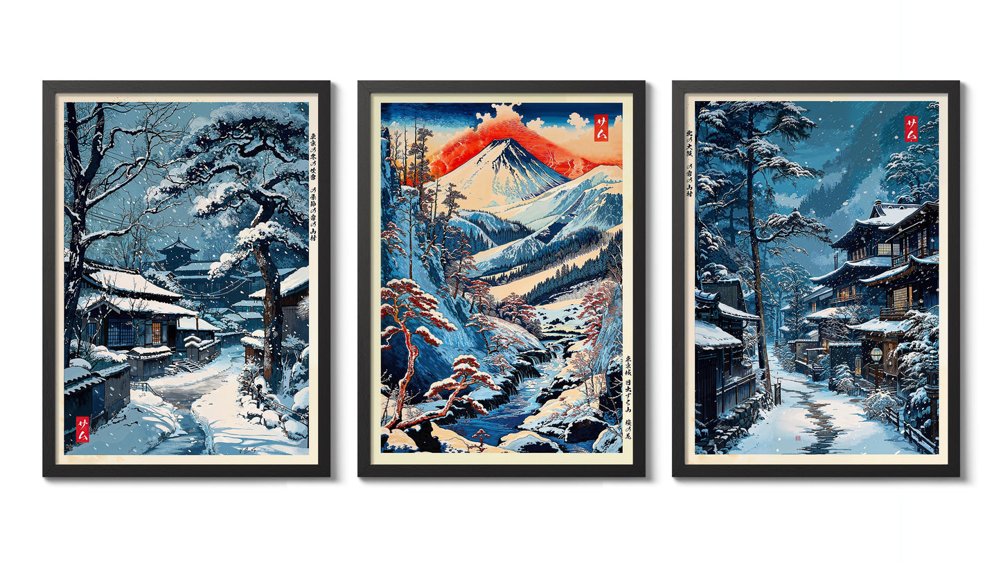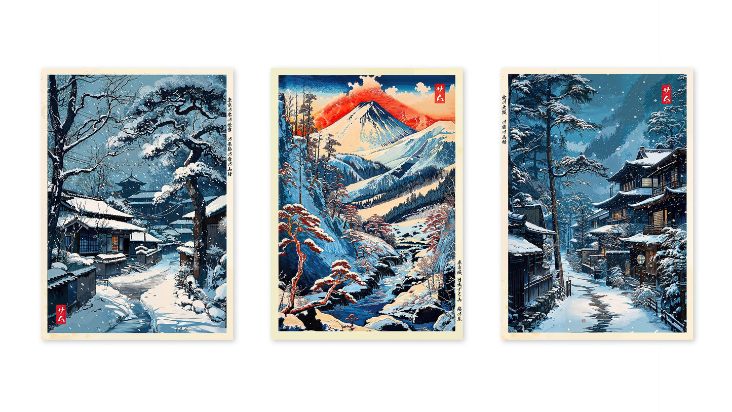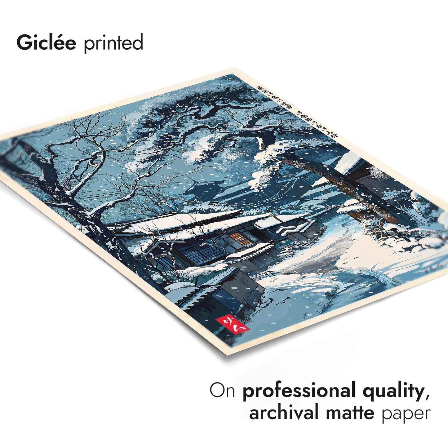 This "Snowy Osaka Scenes" poster set captures serene winter landscapes with blue and white hues, showcasing traditional Japanese woodblock art. Each illustration depicts snow-laden trees, quaint village streets, and the iconic Mount Fuji under stormy skies. These captivating prints merge graphic elegance with tranquil winter themes, making them ideal for lovers of Japanese artistry and snowy vistas.