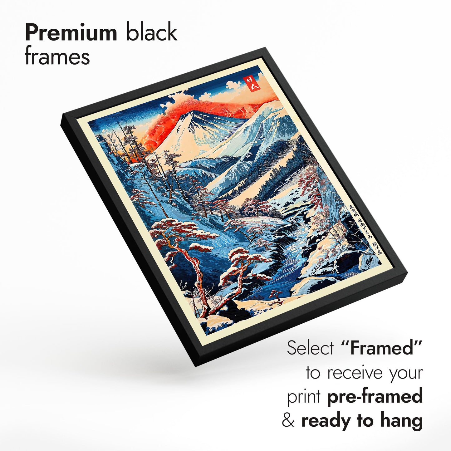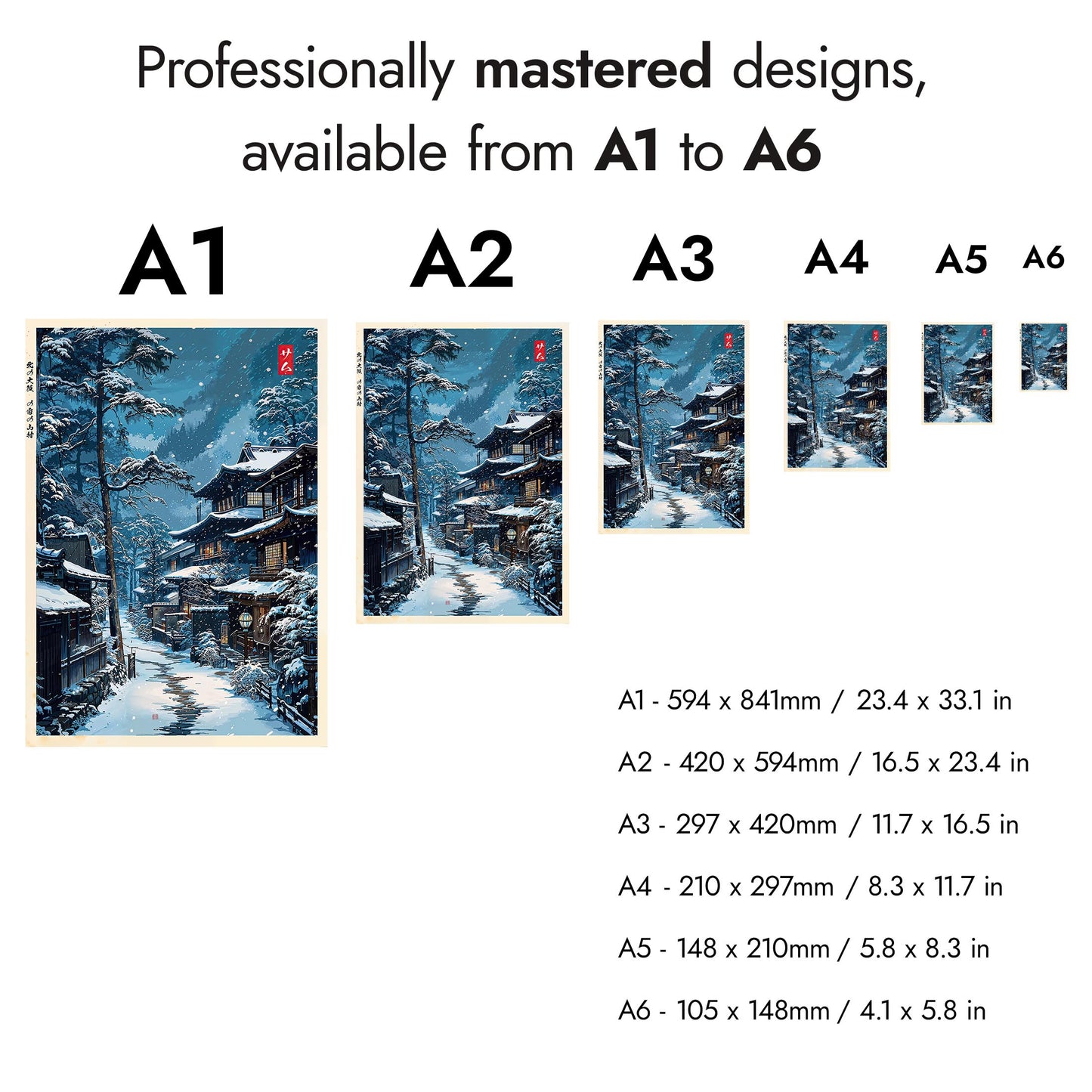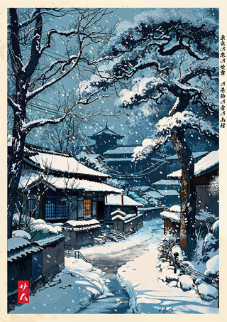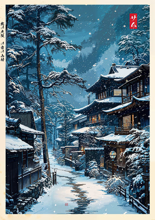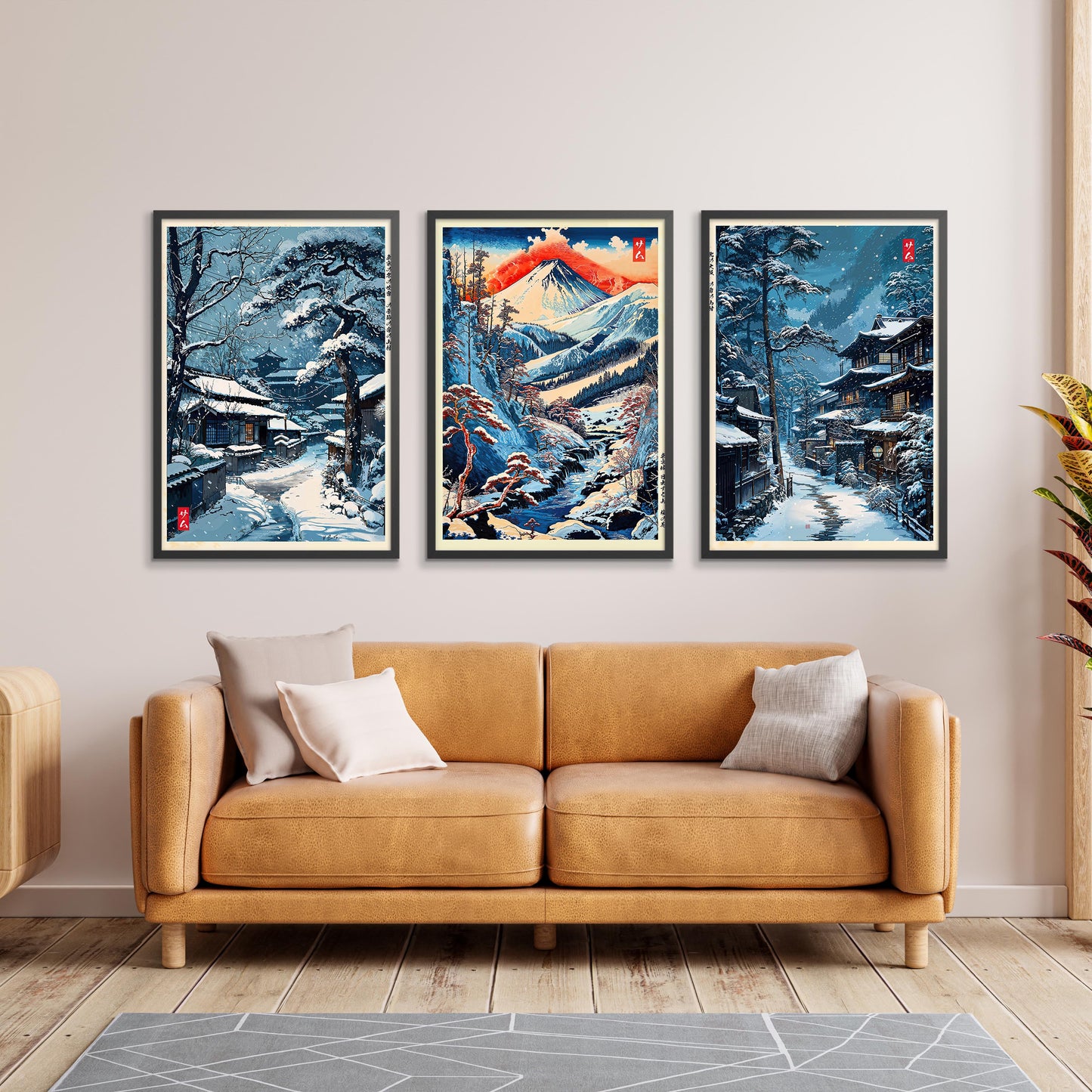 This "Snowy Osaka Scenes" poster set captures serene winter landscapes with blue and white hues, showcasing traditional Japanese woodblock art. Each illustration depicts snow-laden trees, quaint village streets, and the iconic Mount Fuji under stormy skies. These captivating prints merge graphic elegance with tranquil winter themes, making them ideal for lovers of Japanese artistry and snowy vistas.